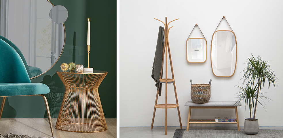Gebruik reflecterende materialen zoals spiegels, glas en metaal in je interieur. Deze zorgen er namelijk voor dat er meer licht verspreid wordt en laat de kamer groter lijken. Bovendien is een spiegel een perfecte illusie, je hersenen zijn ervan overtuigd dat de reflectie deel uitmaakt van je interieur.