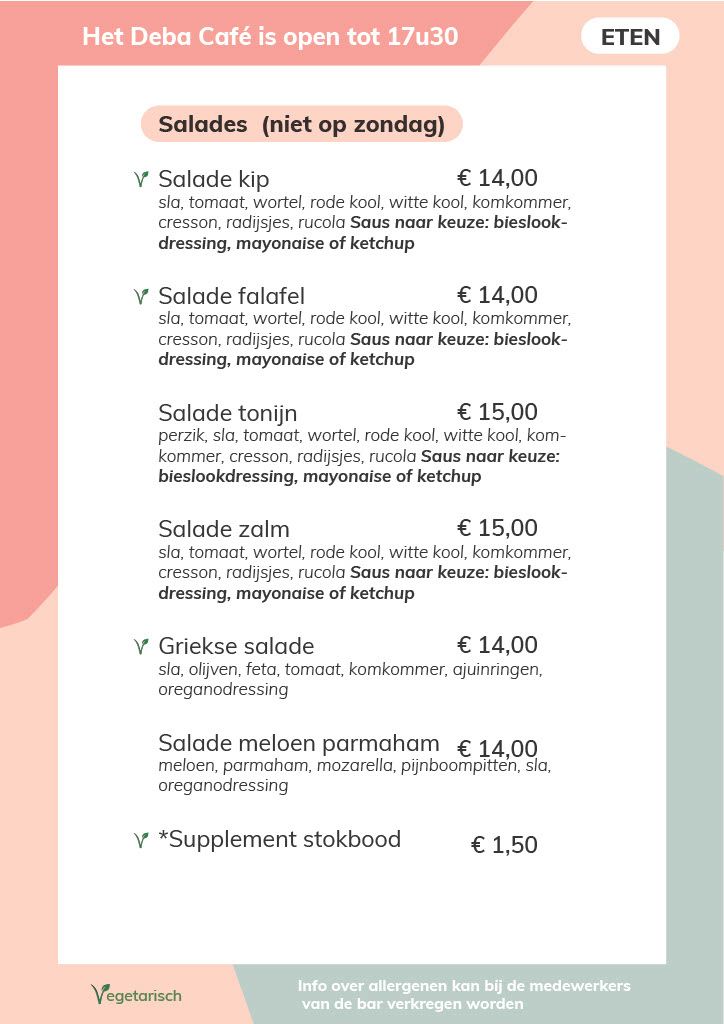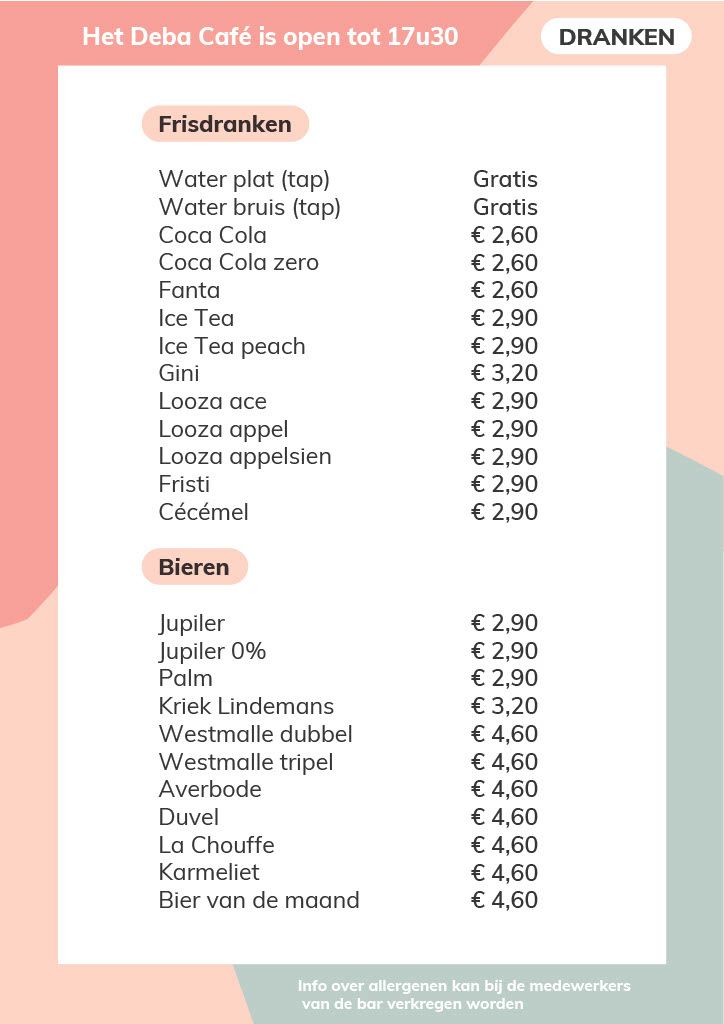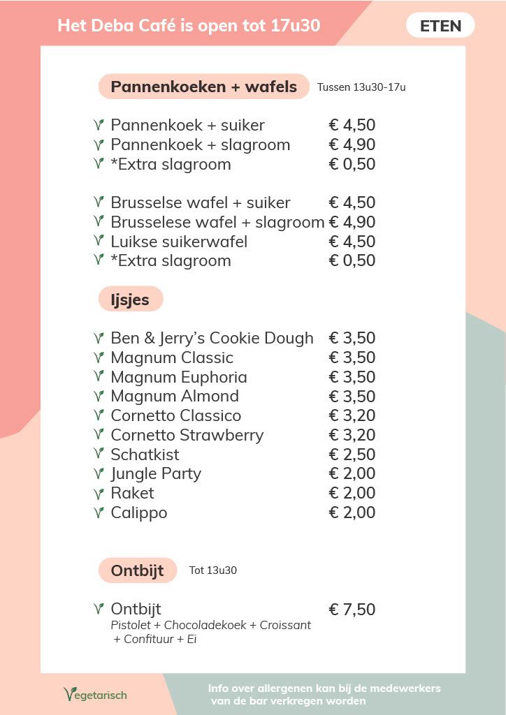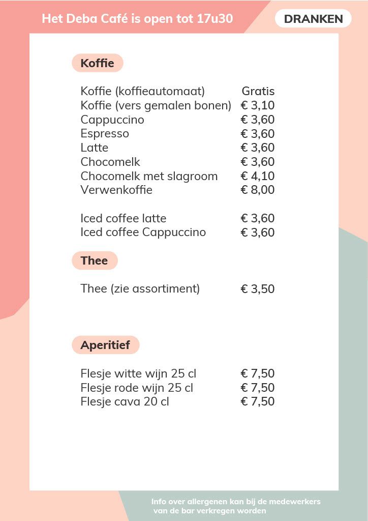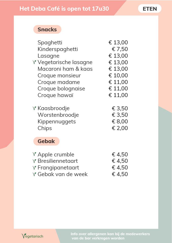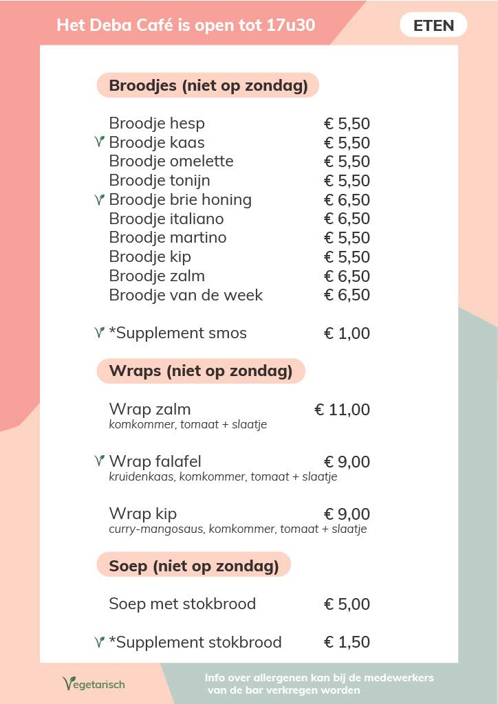 Terug naar het overzichtOntdek het smaakvolle menu van het DEBA Café, jouw plek in onze meubelwinkel om te ontspannen en te genieten. Geniet van een variatie aan gerechten, zoals verse soepen, knapperige broodjes, smakelijke porties spaghetti en andere heerlijke opties. Bovendien bieden we gratis water en koffie aan tijdens jouw bezoek aan ons DEBA Café. Kom je ook gezellig even langs?