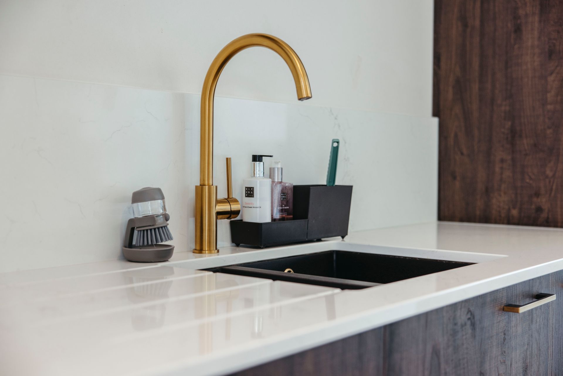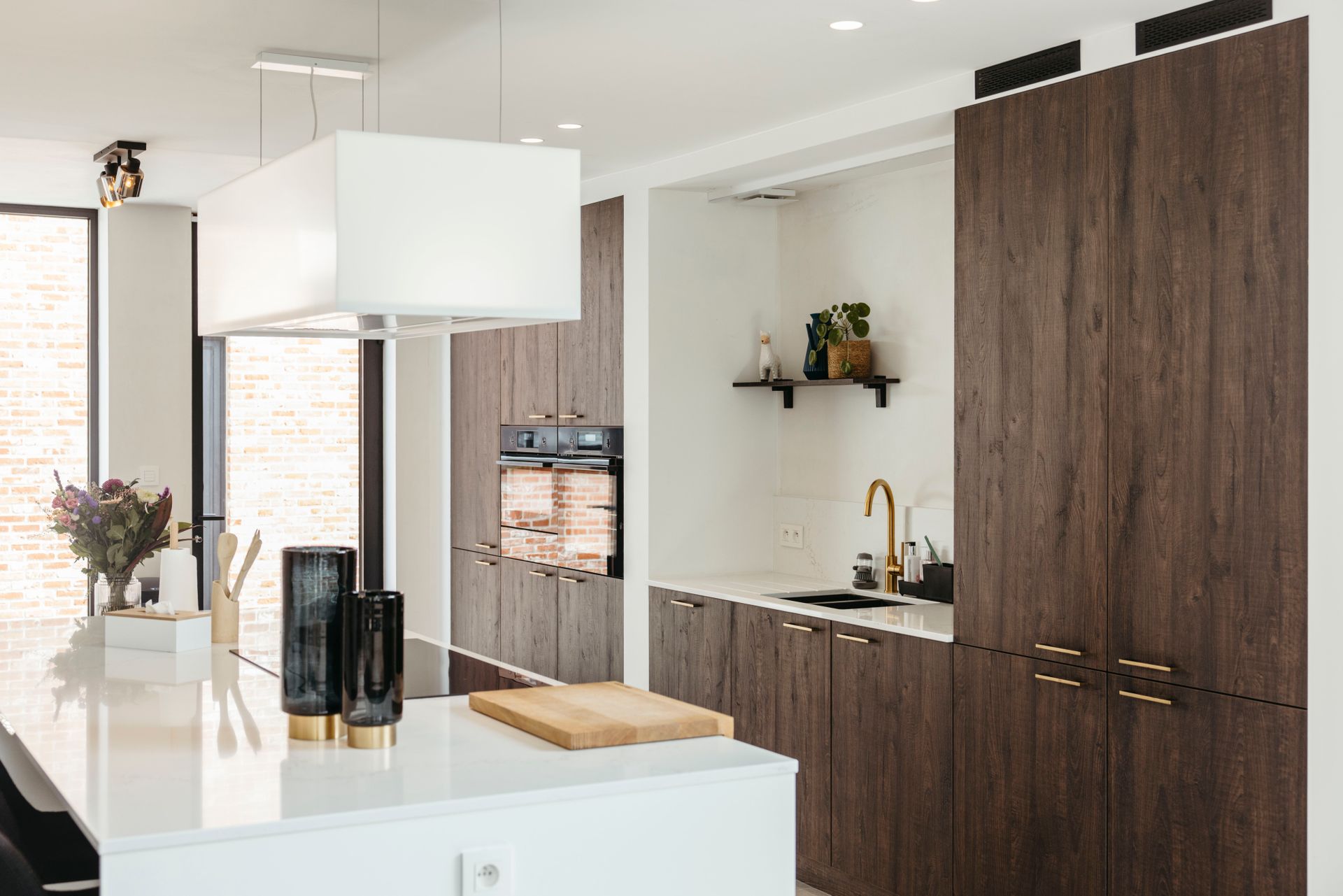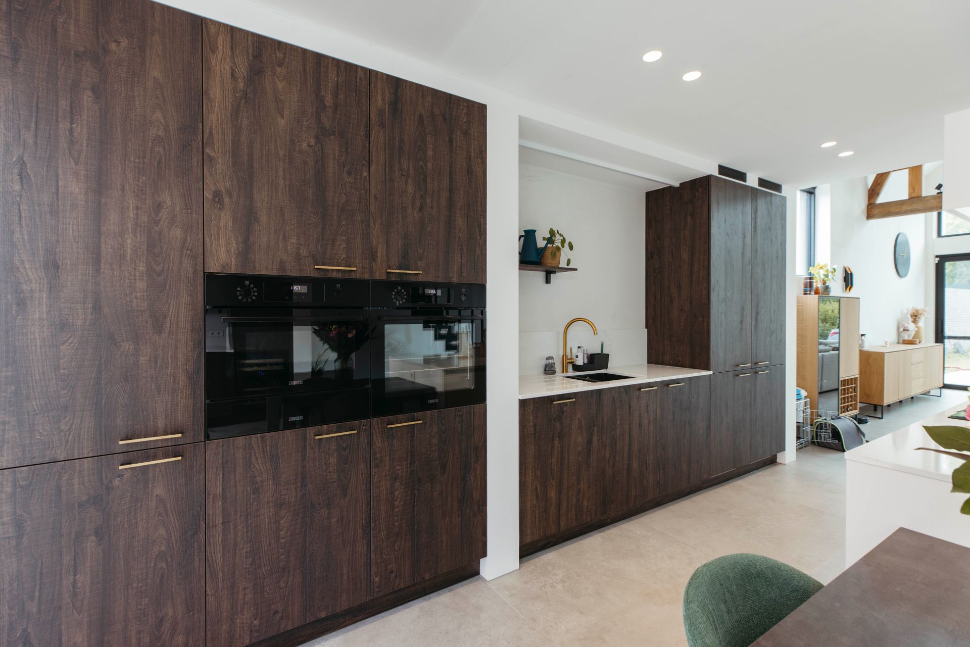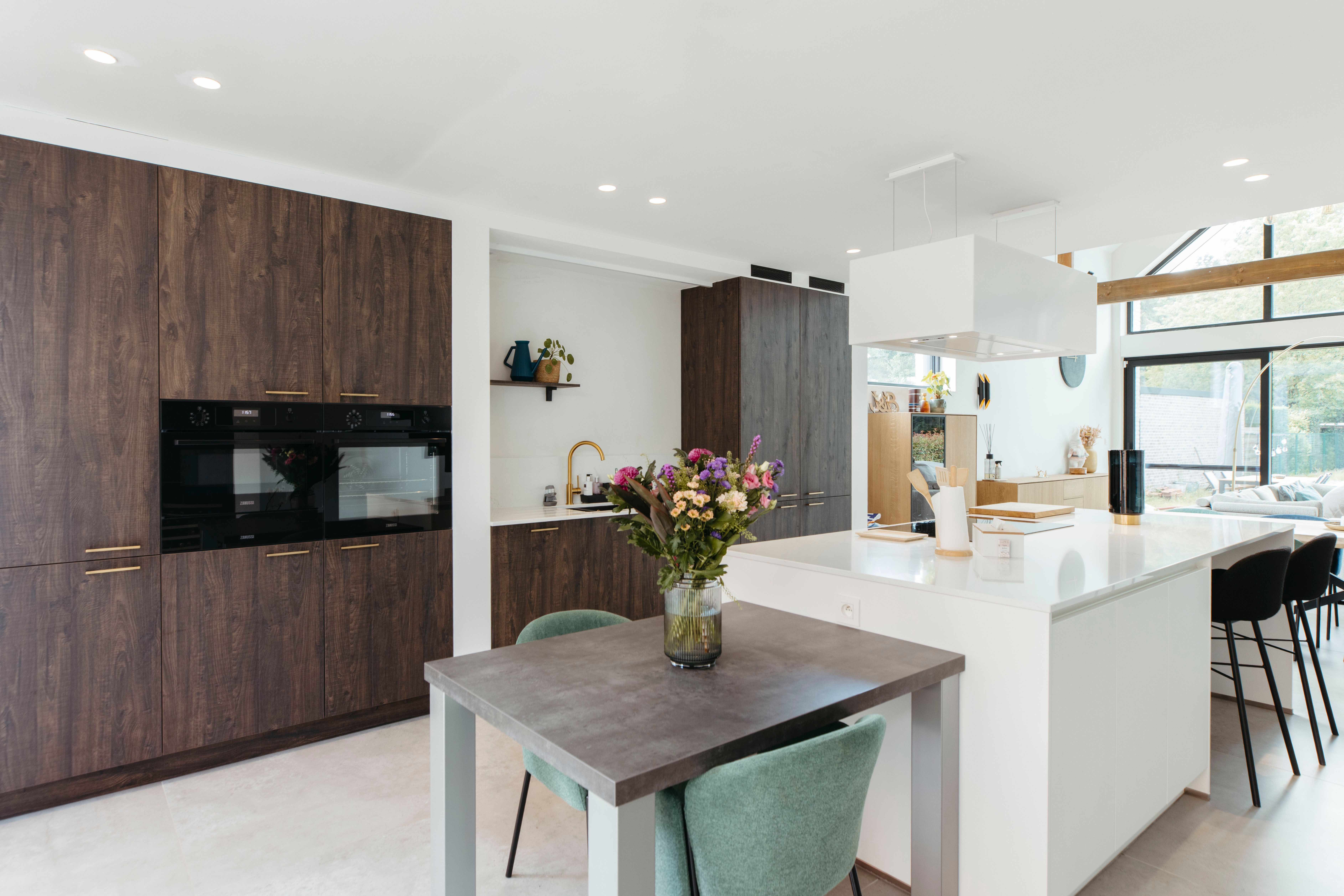 Deze moderne keuken ademt warmte en stijl. Donkerhouten fronten lopen harmonieus over in een composiet werkblad, terwijl de gouden kraan en zwarte spoelbak een prachtig contrast vormen. Gouden grepen geven het geheel een luxueus accent.