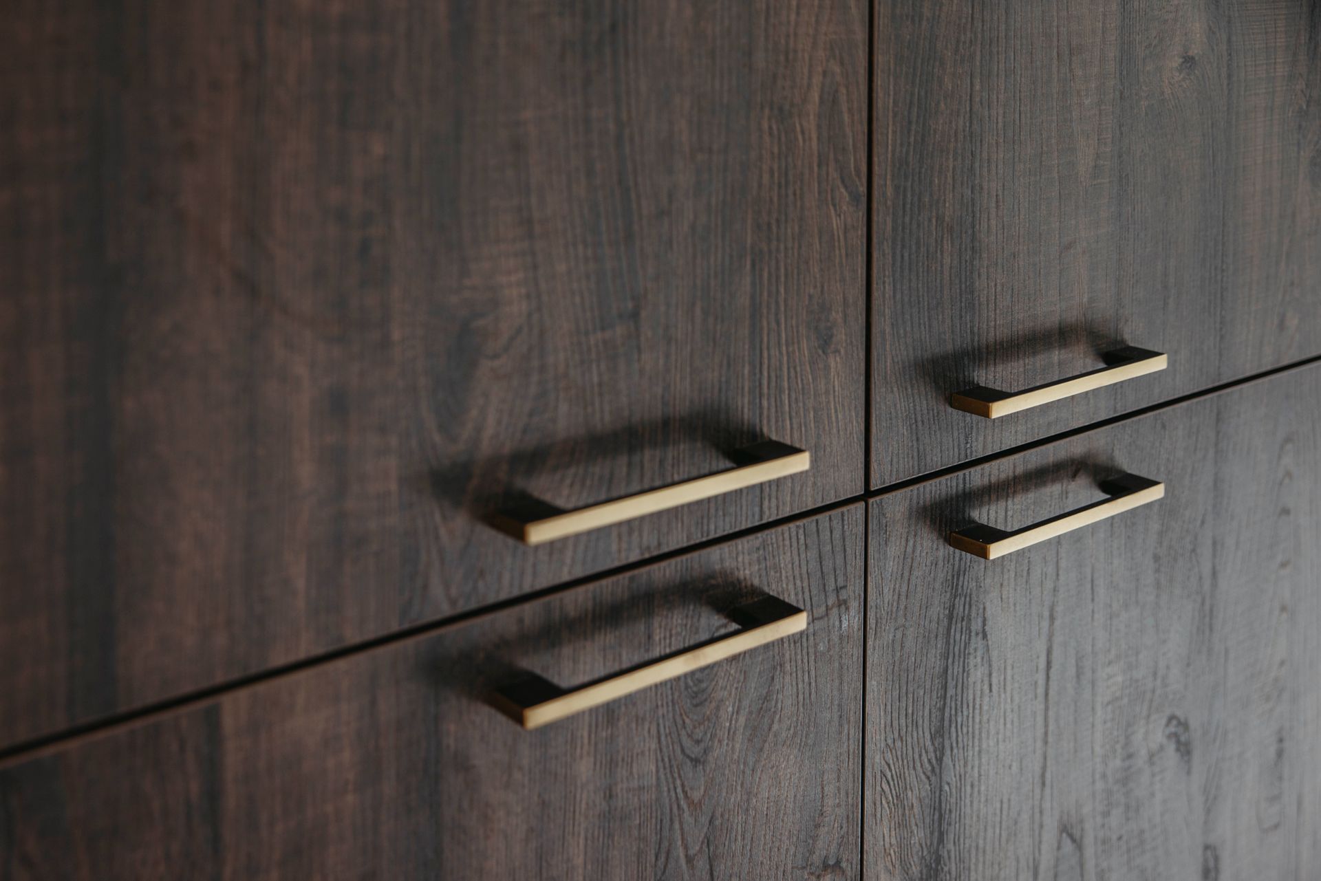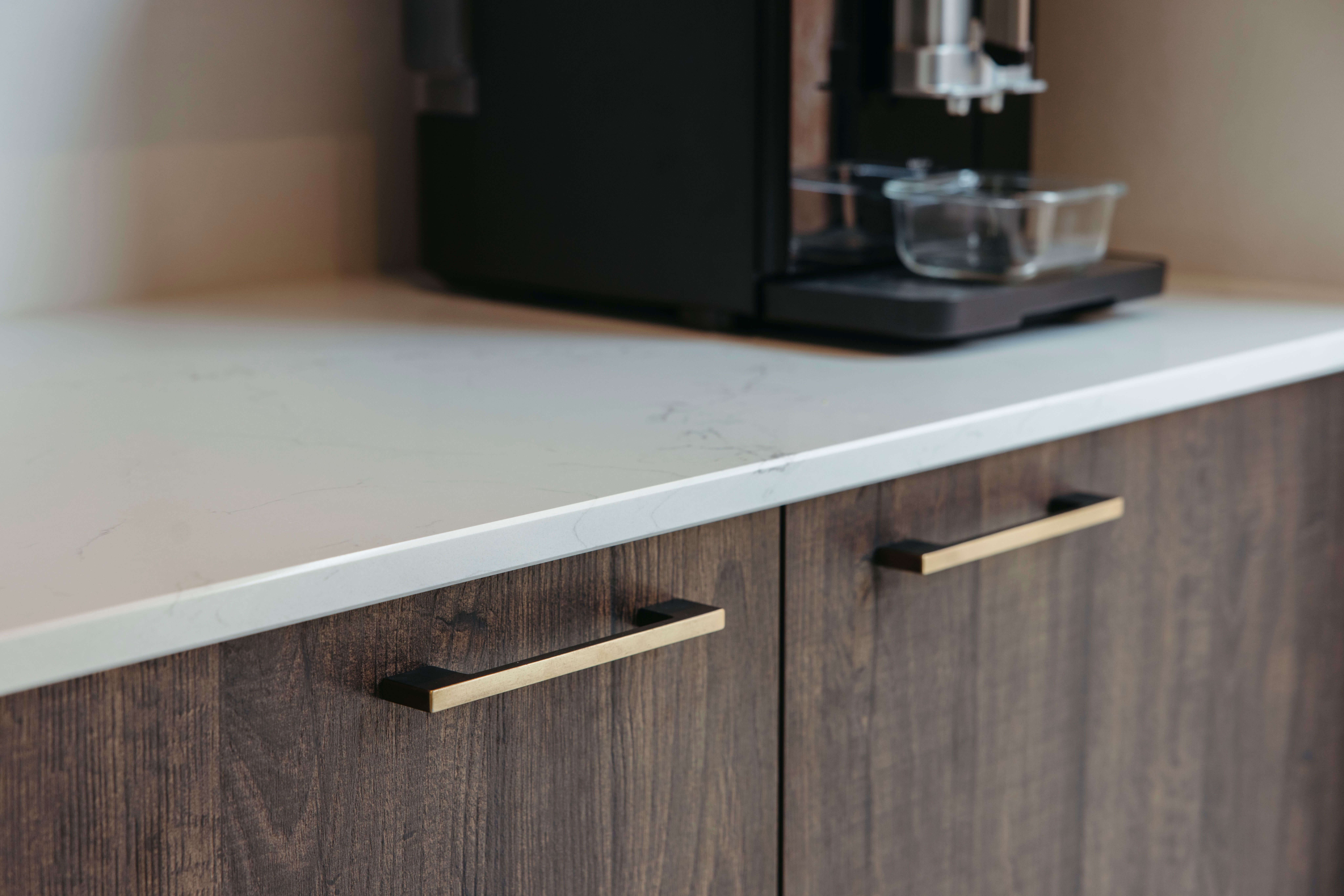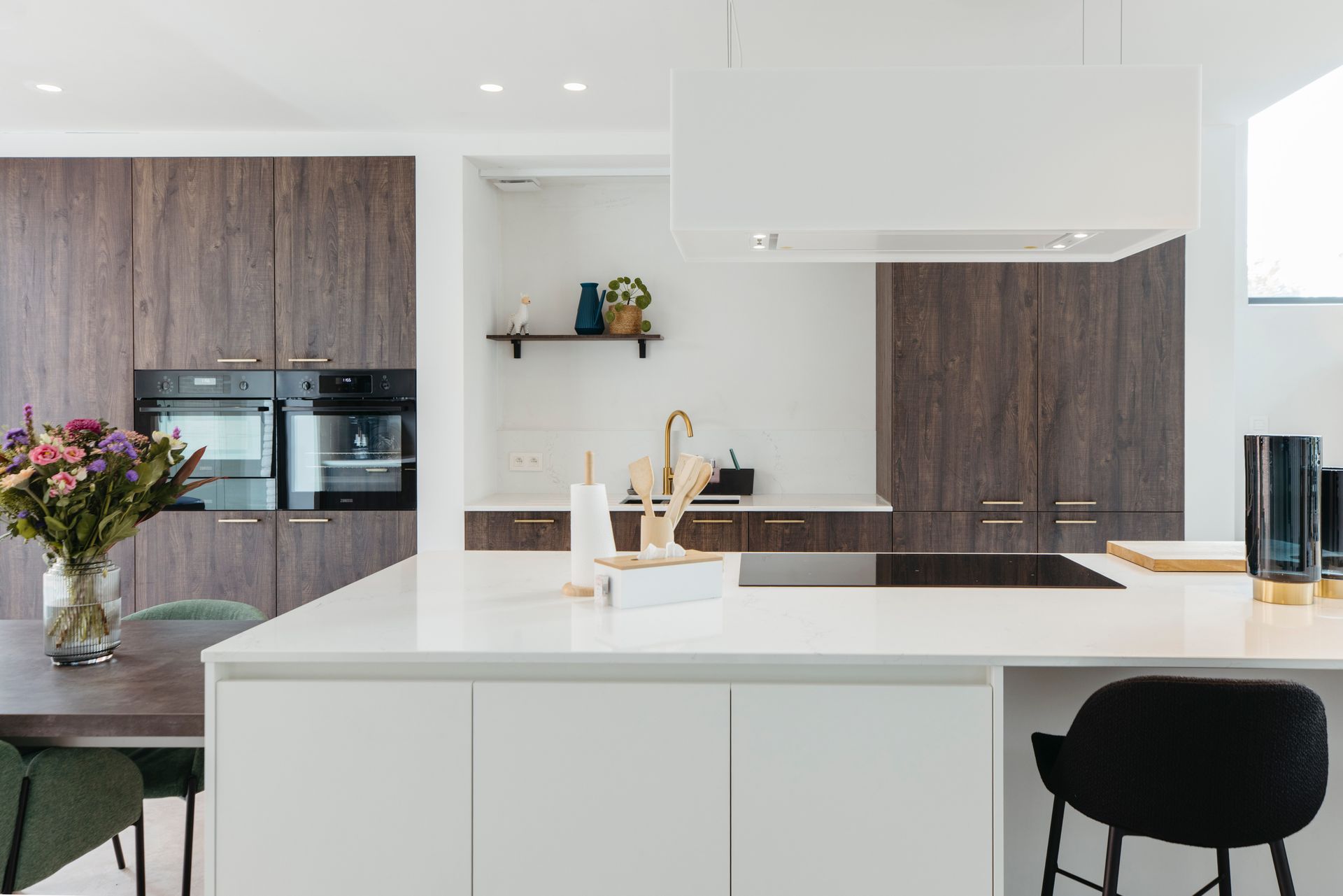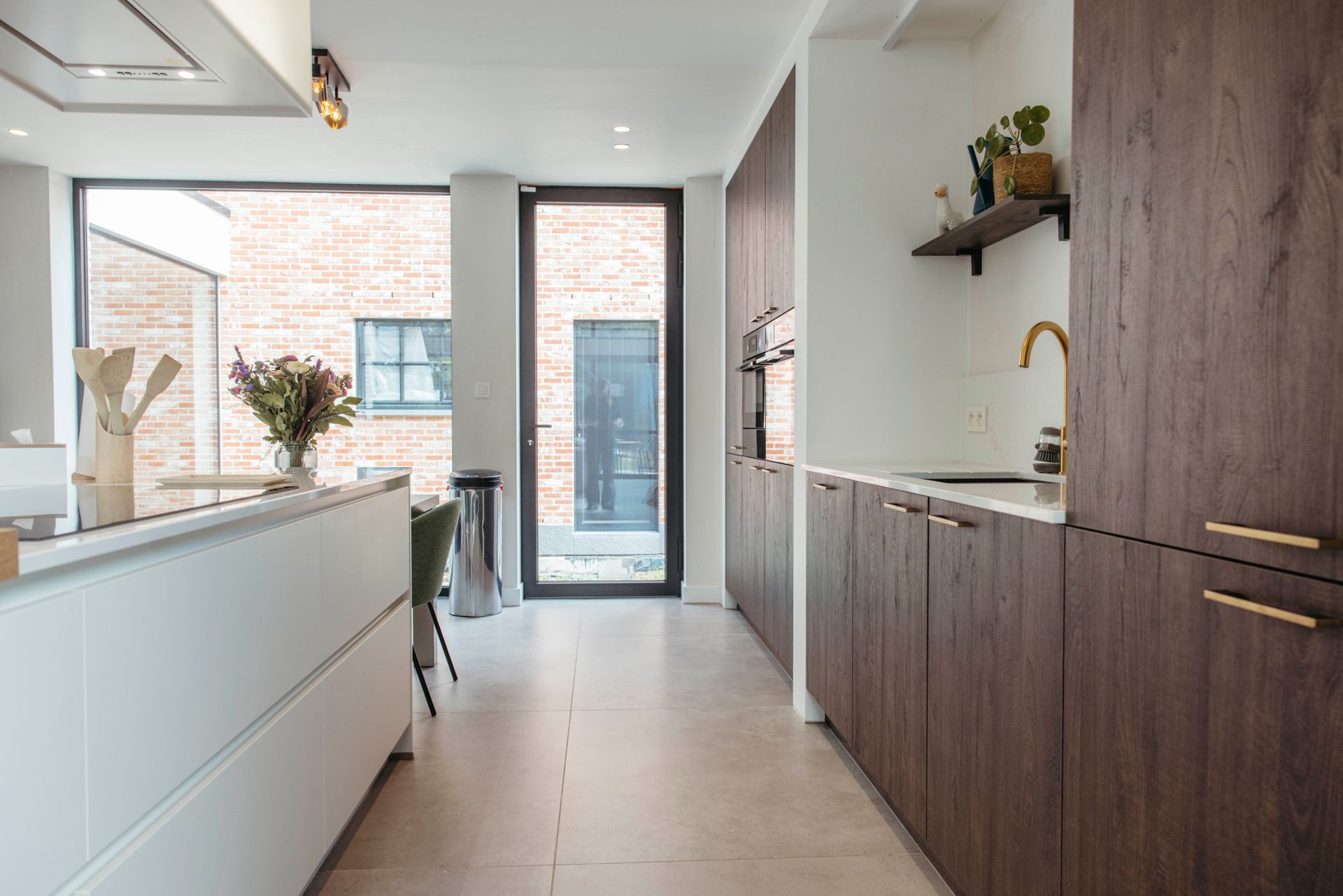Deze moderne keuken ademt warmte en stijl. Donkerhouten fronten lopen harmonieus over in een composiet werkblad, terwijl de gouden kraan en zwarte spoelbak een prachtig contrast vormen. Gouden grepen geven het geheel een luxueus accent.