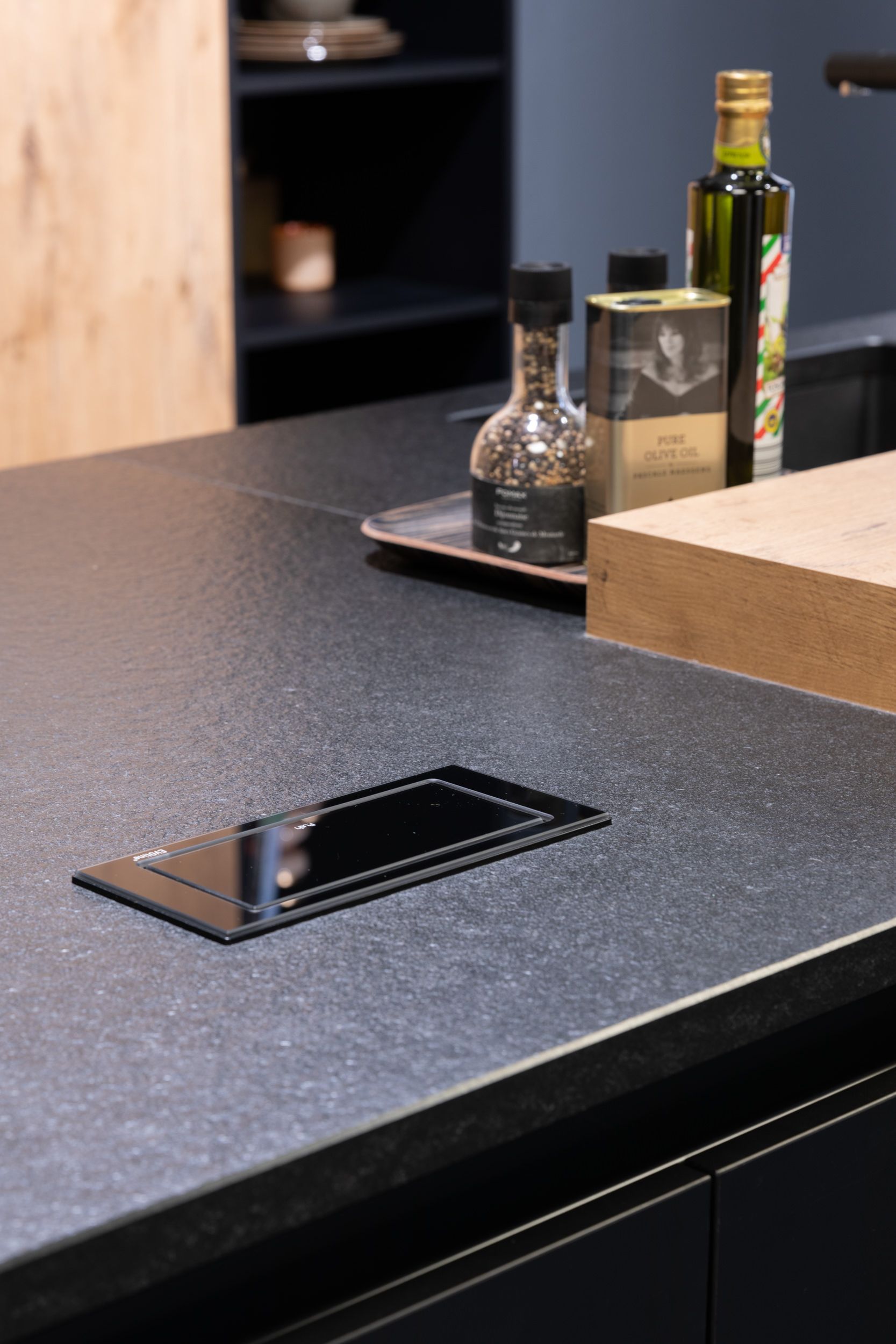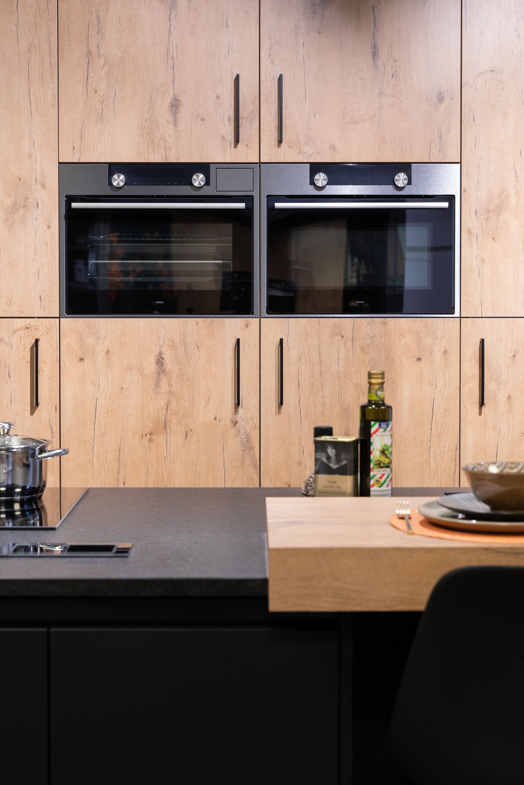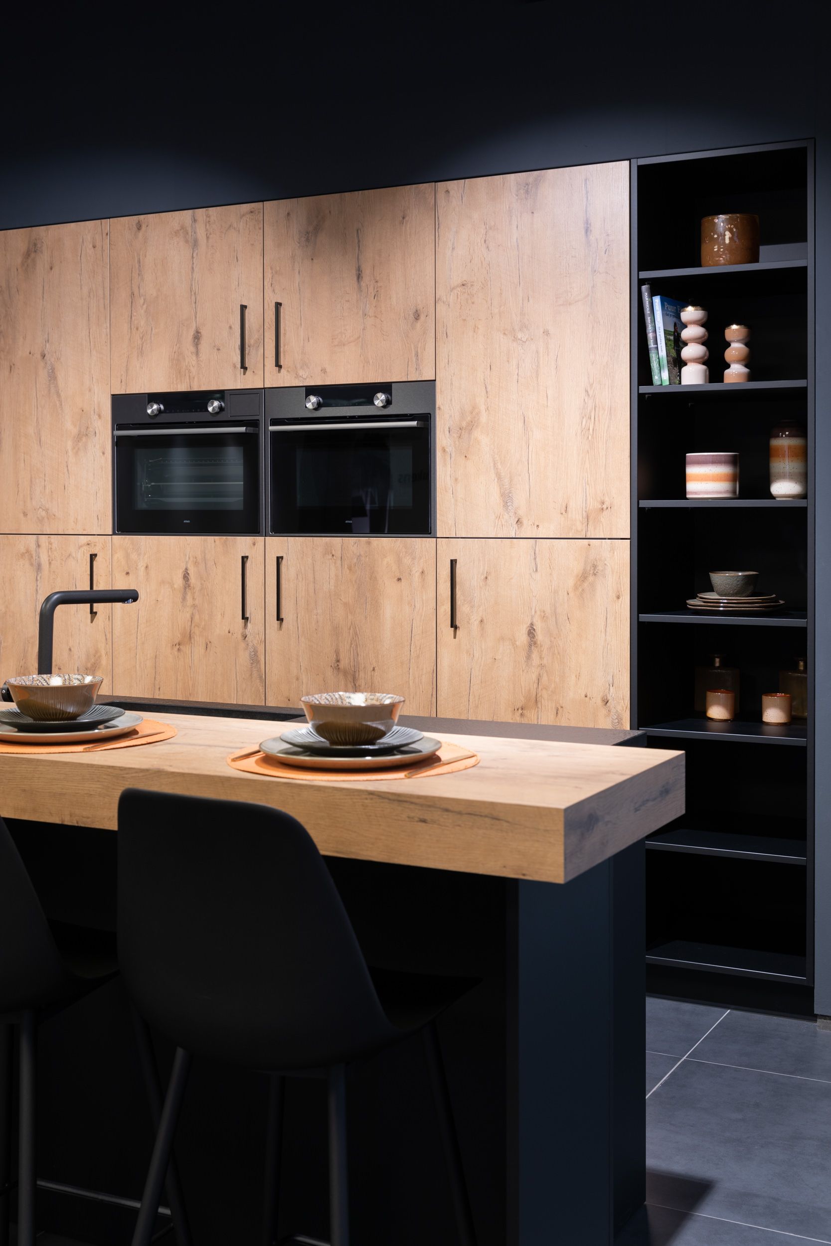 Keuken Bali is een moderne keuken waar zwart en hout centraal staan. Het zwart werkblad en de zwarte kasten vormen een prachtig geheel met het houten tafelblad en de houten deuren. De zitplaatsen aan het keukeneiland zorgen voor extra gezelligheid. Zo vormt keuken Bali een prachtige, moderne keuken die volledig beantwoord aan de laatste keukentrends. Een zwarte keuken met hout kopen is dus een goed idee als je voor een nieuwe keuken gaat. Bovendien is deze moderne keuken volledig ingericht met kasten, Bauknecht toestellen, sanitair en eiland met zitplaatsen.