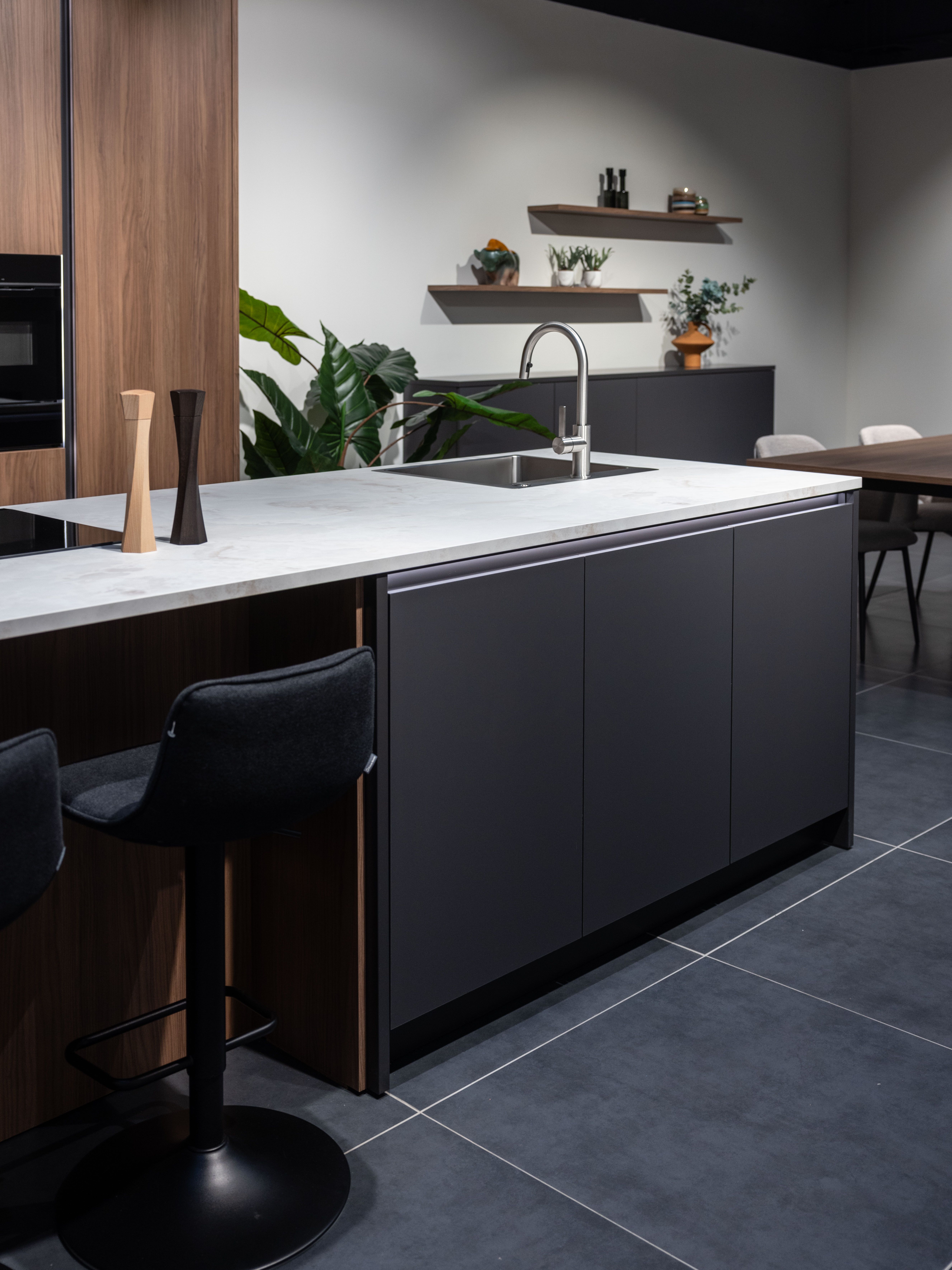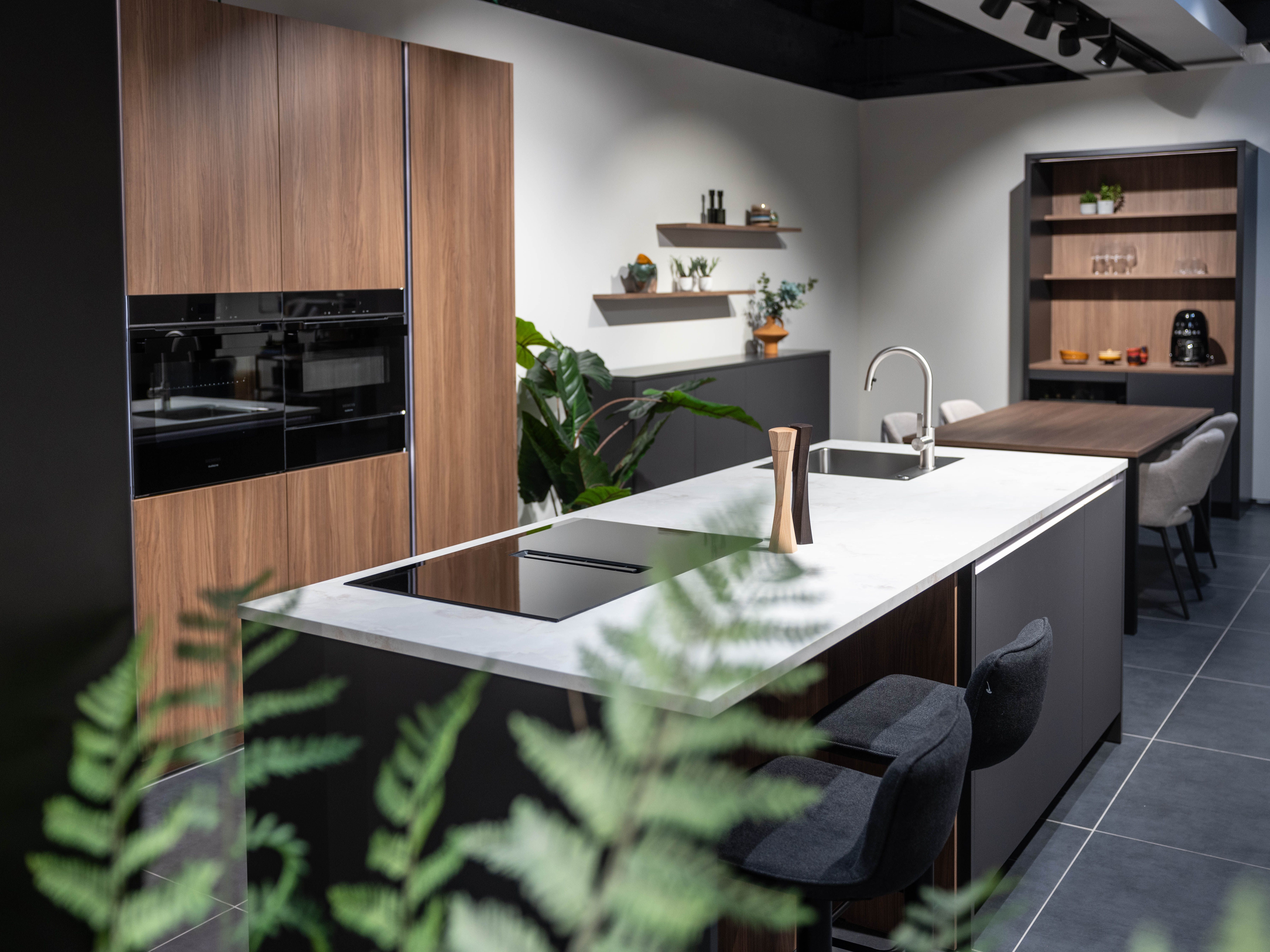 Keuken Vigo combineert notelaar met matlak anti-fingerprint voor een verfijnde en onderhoudsvriendelijke look. De greeplijsten met verlichting zorgen voor een subtiele, moderne touch.