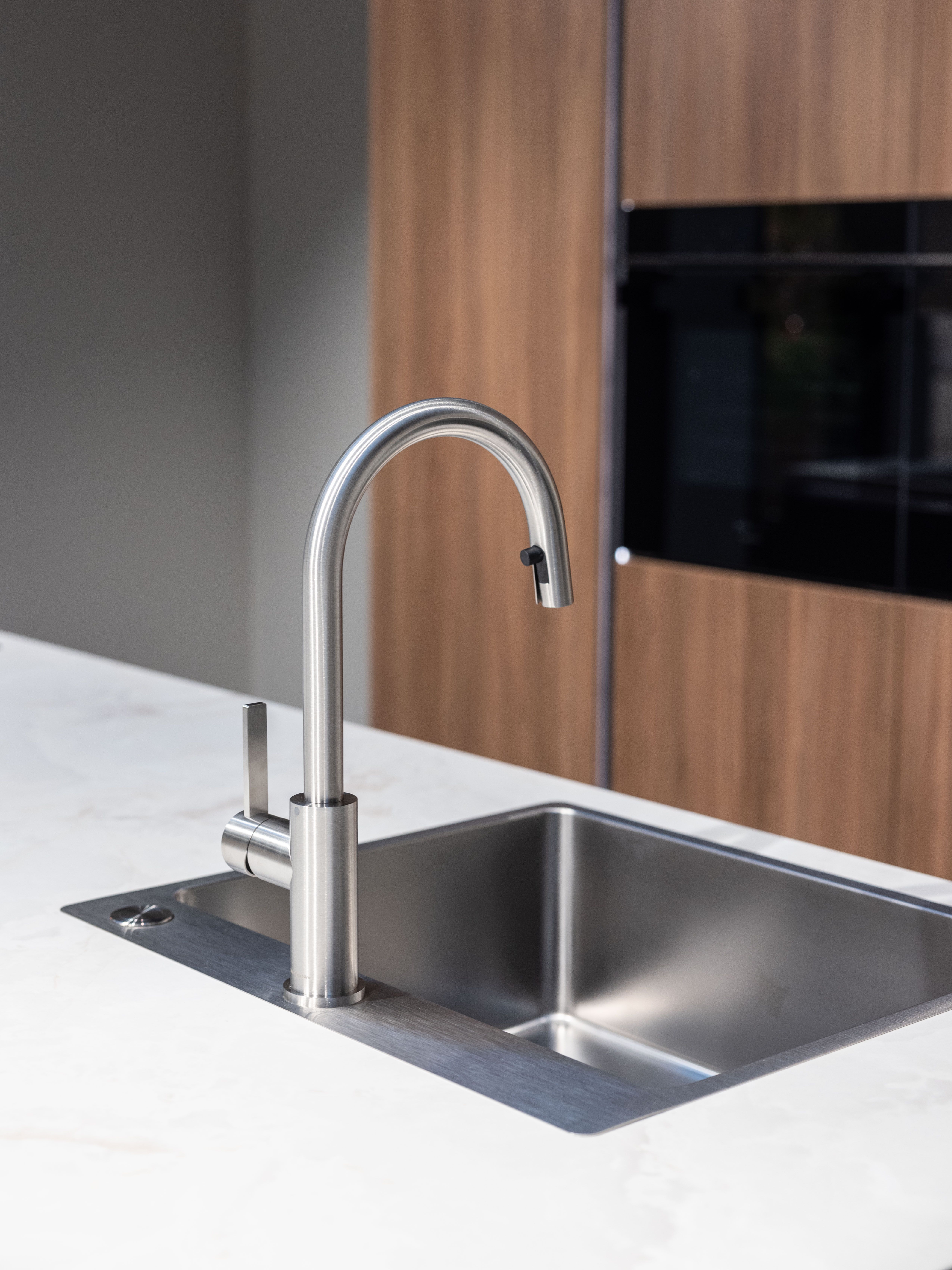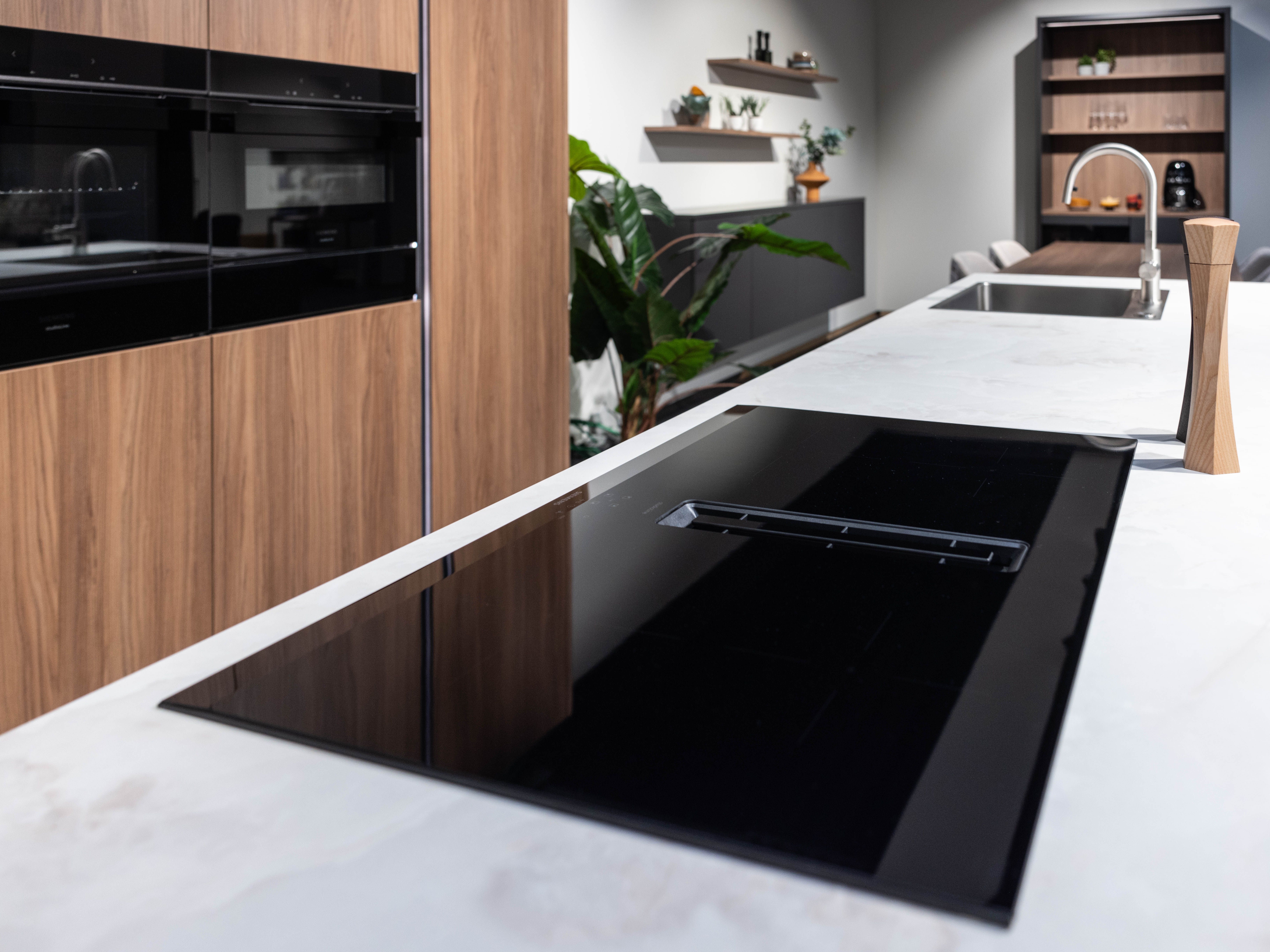 Dankzij de inductiekookplaat met afzuiging, oven, combi-oven en warmhoudlade geniet je van optimaal kookcomfort. De rvs spoelbak en kraan passen perfect bij het laminaat werkblad in marmerdecor.