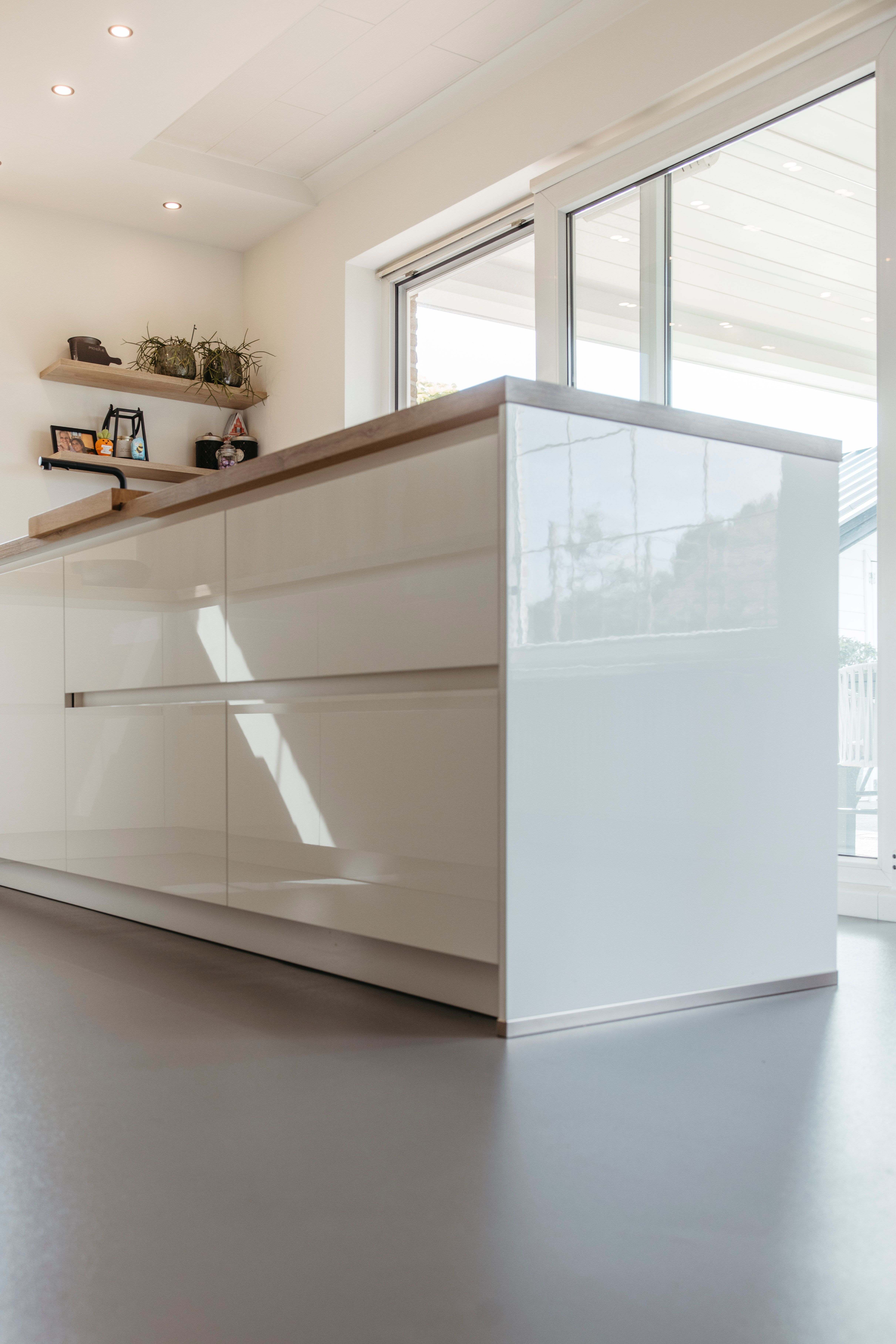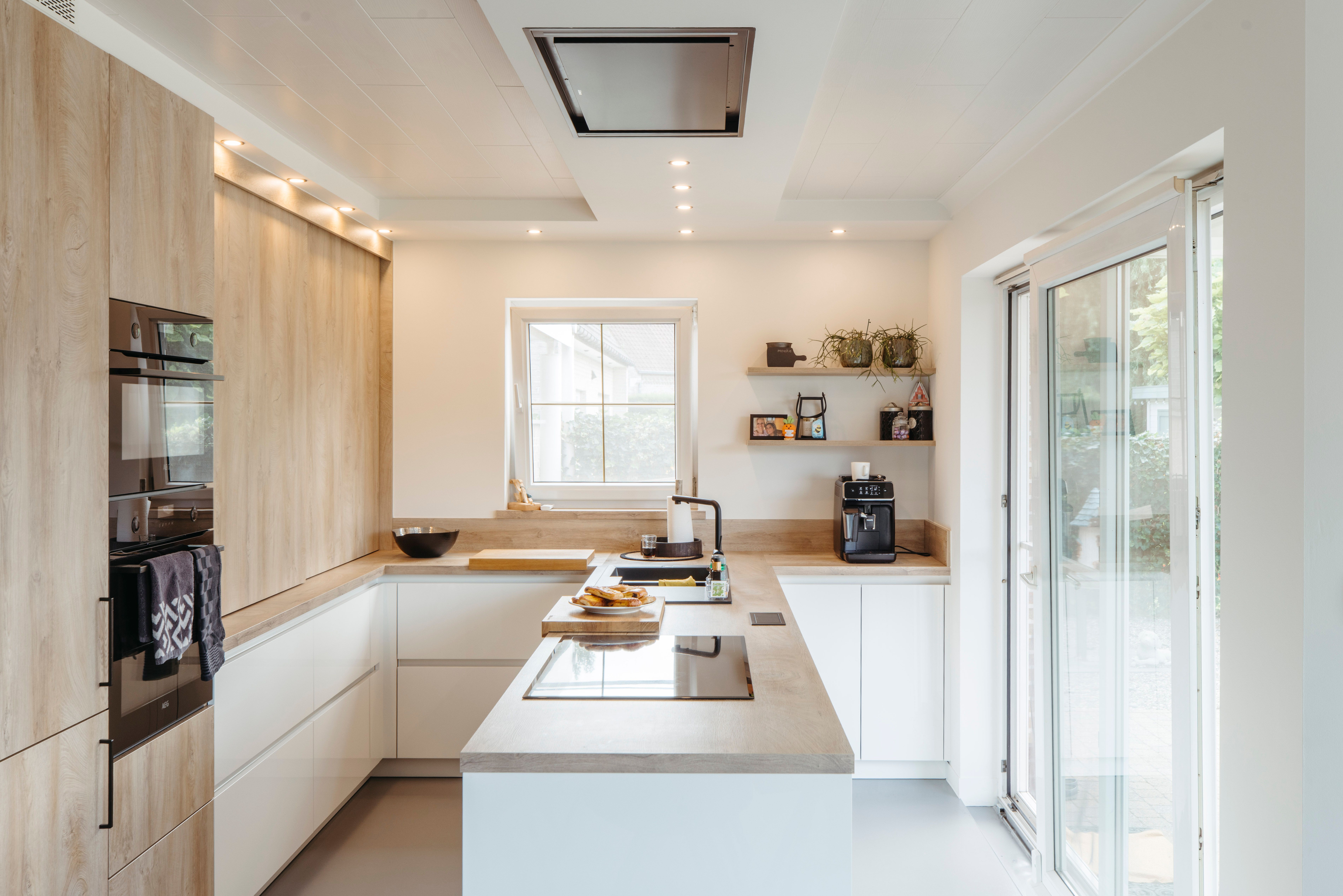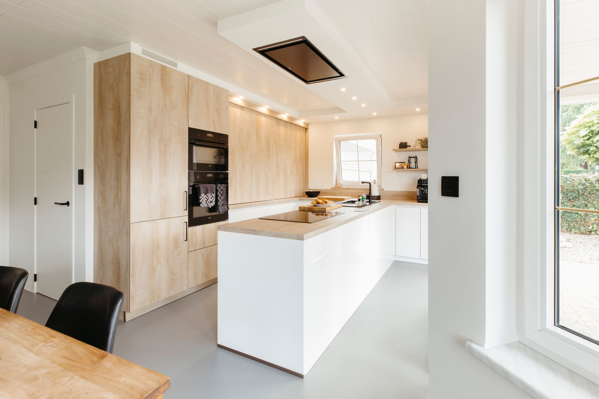 Deze greeploze keuken in hoogglans lak wordt prachtig gecombineerd met warm houtdecor. Het geheel straalt een strak en tijdloos design uit, terwijl de natuurlijke materialen zorgen voor een huiselijke sfeer.