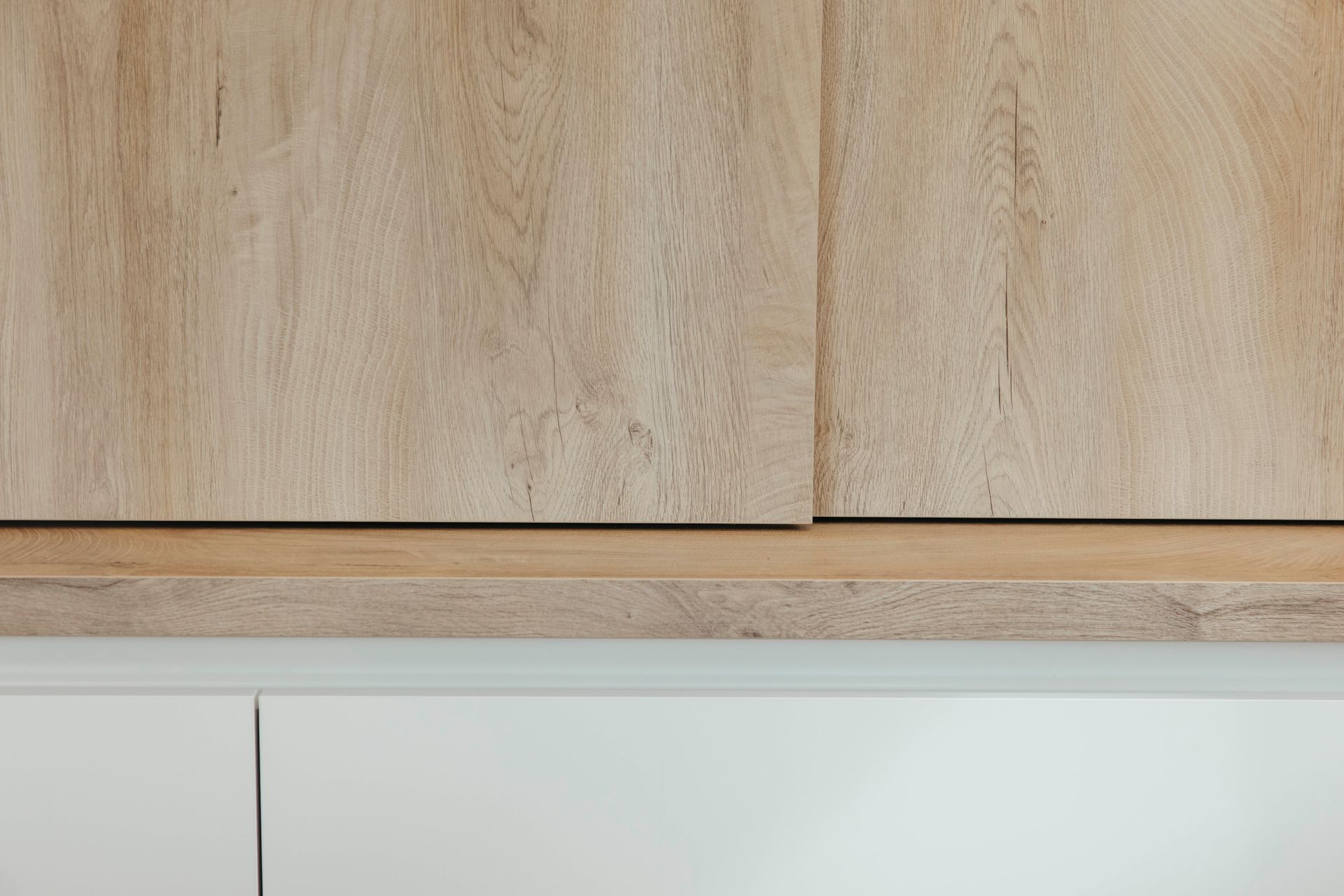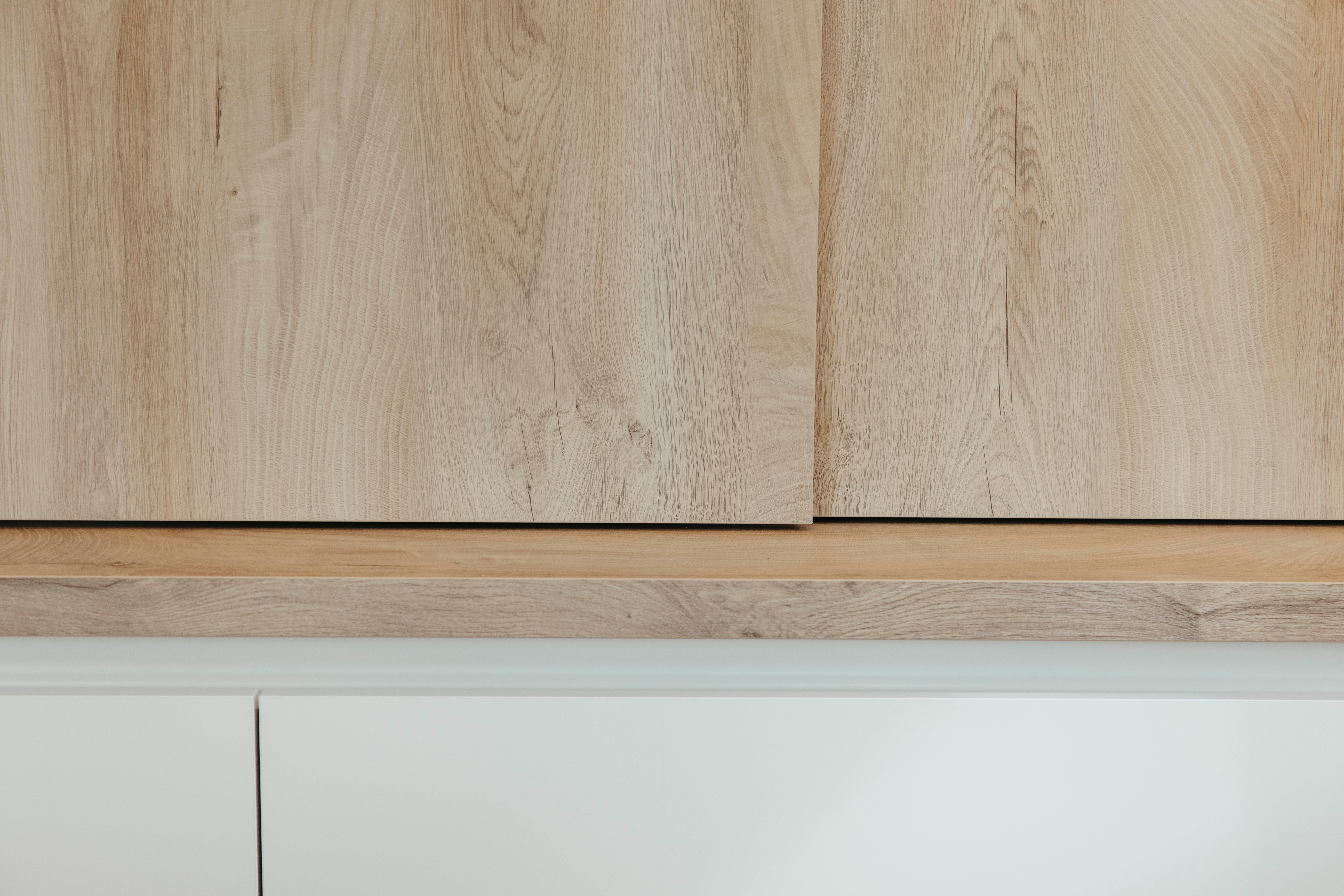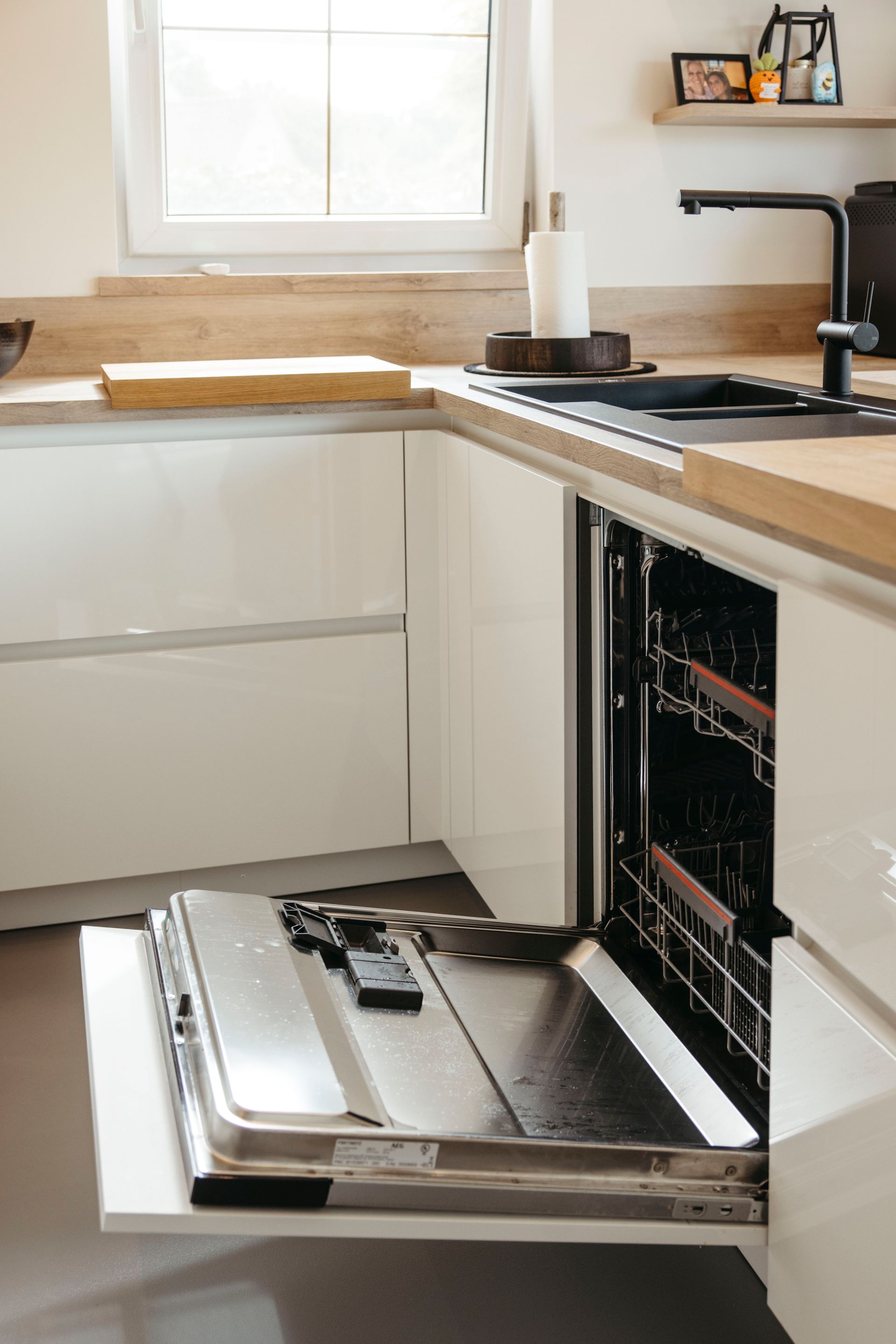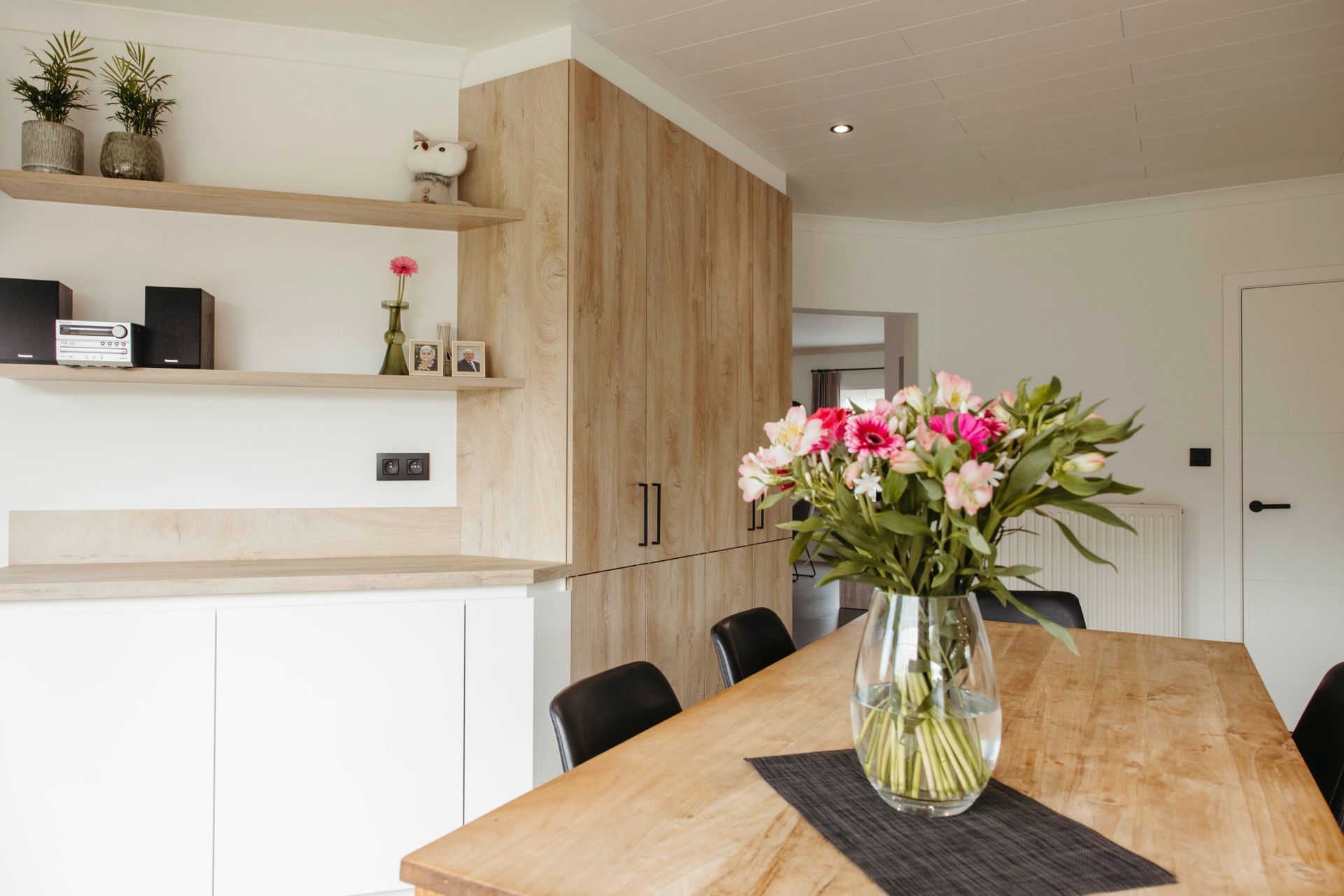 Deze greeploze keuken in hoogglans lak wordt prachtig gecombineerd met warm houtdecor. Het geheel straalt een strak en tijdloos design uit, terwijl de natuurlijke materialen zorgen voor een huiselijke sfeer.