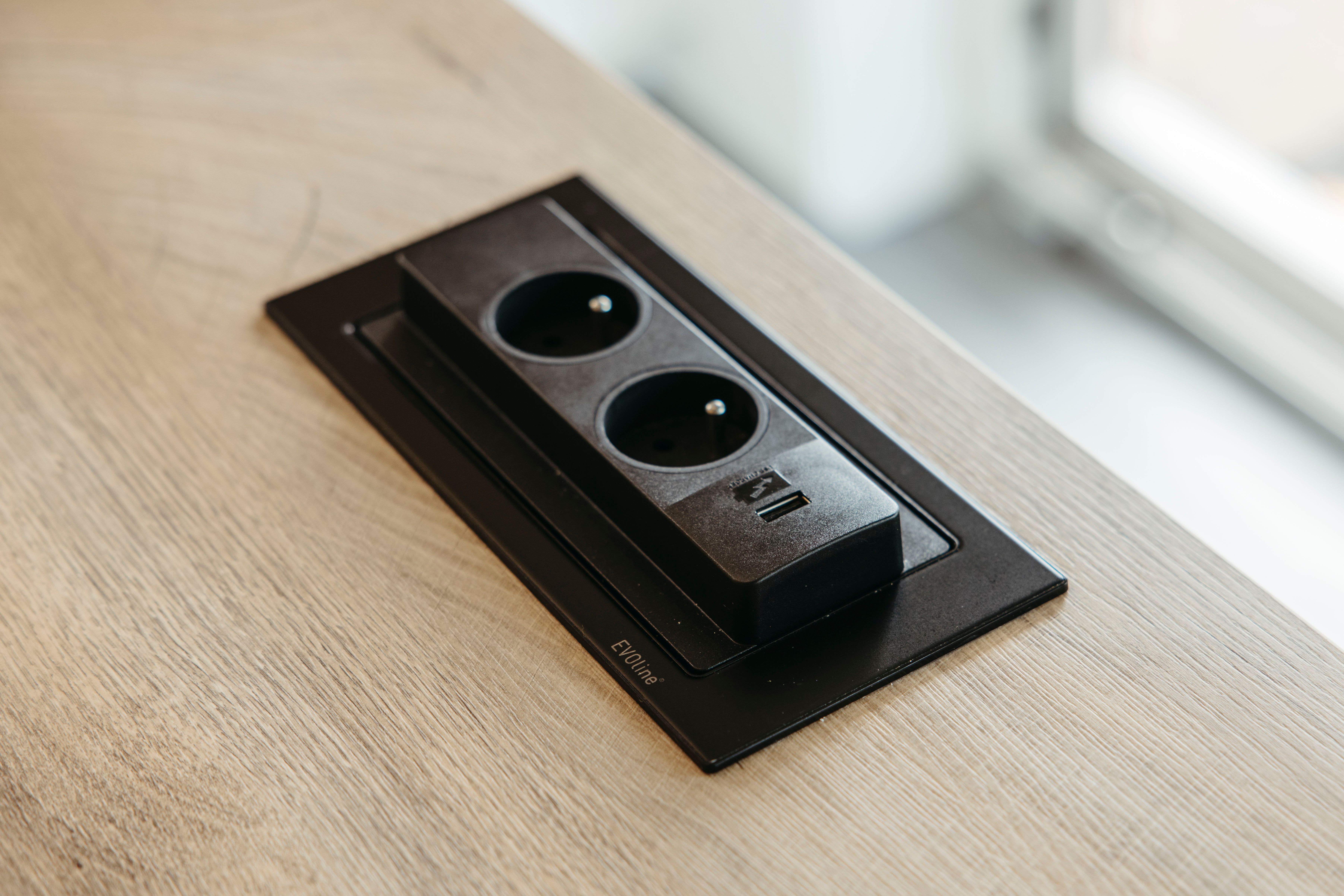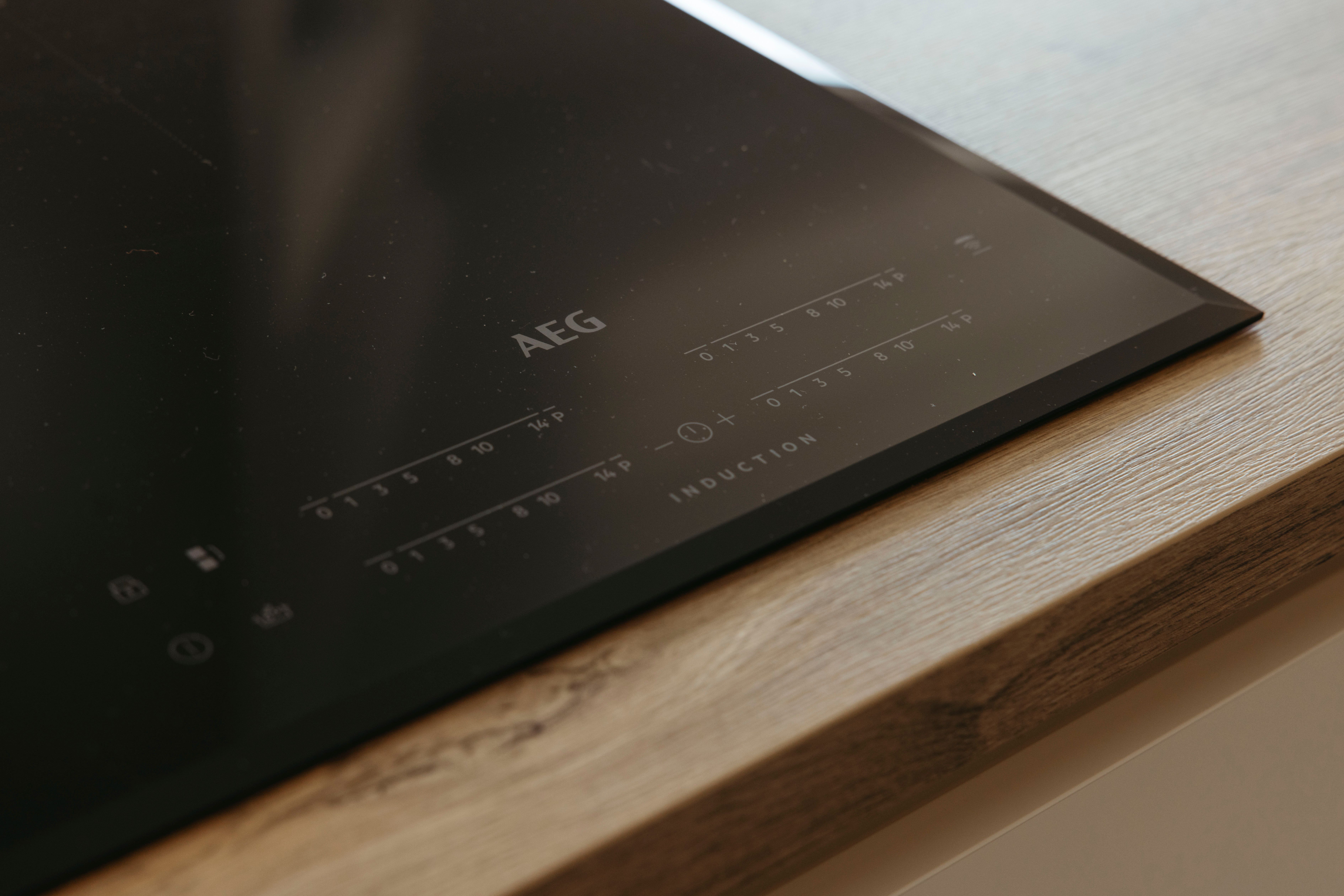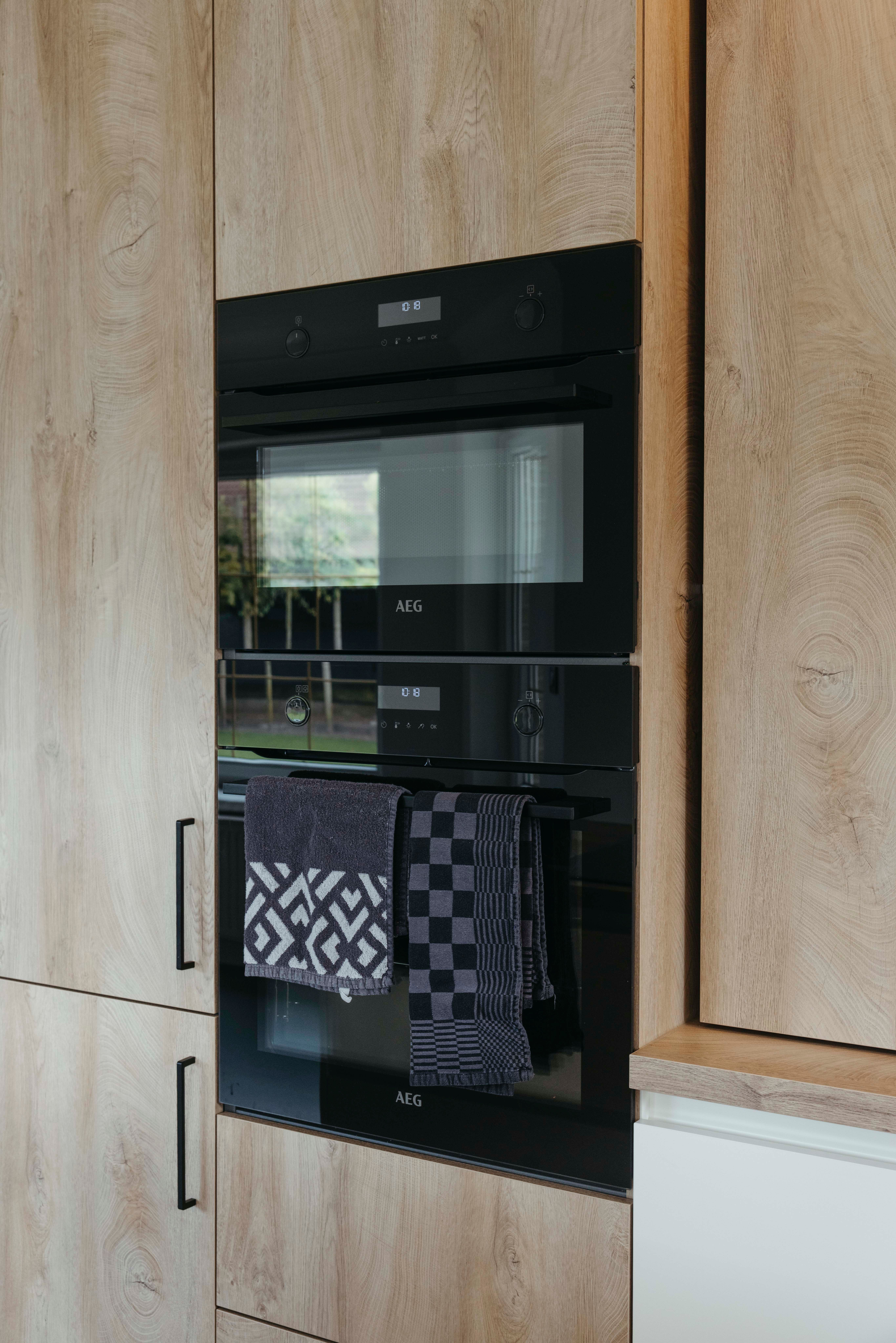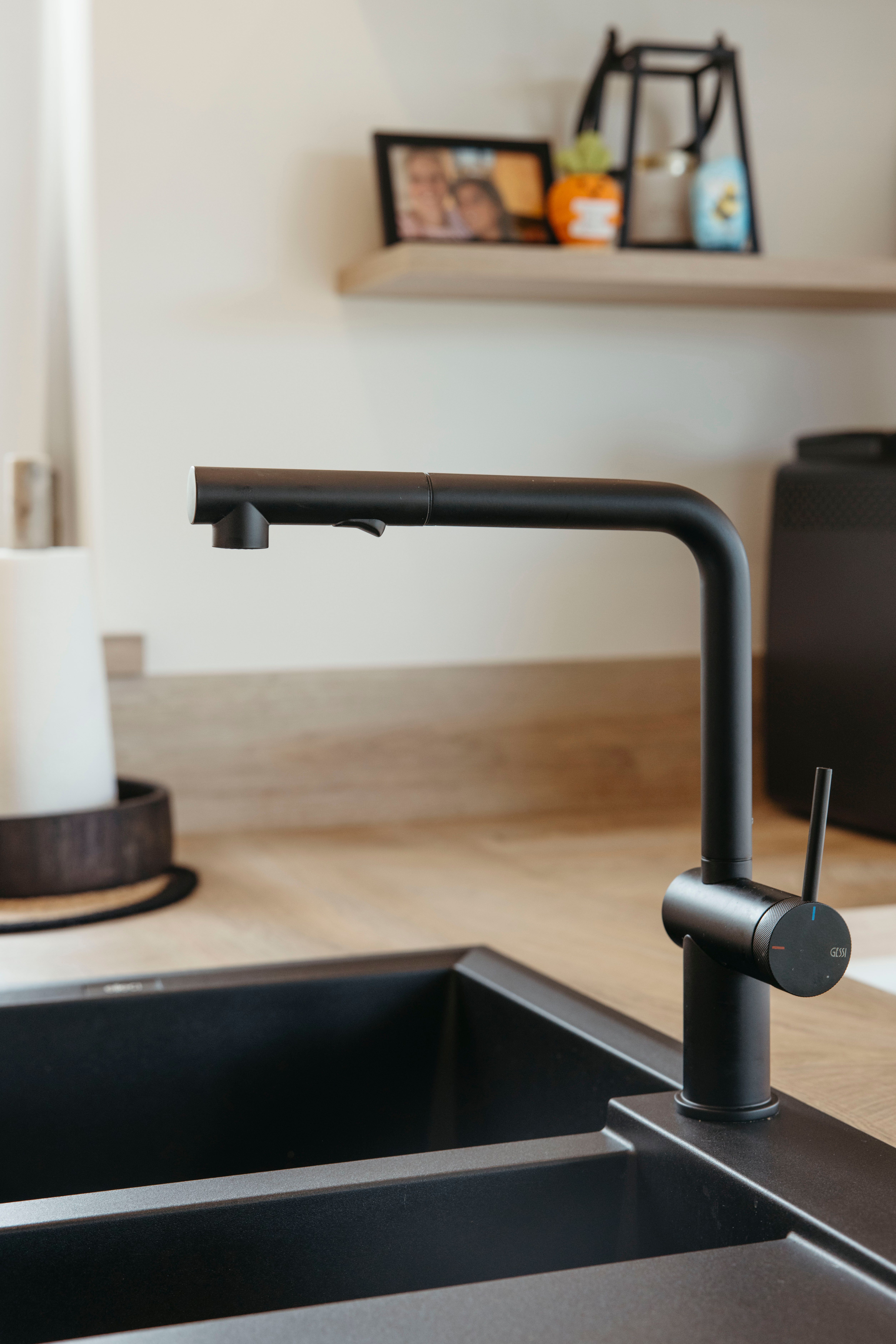 De zwarte, matte kraan en de spoelbak in zwart composiet geven de keuken een stijlvolle en moderne toets. Dankzij de open opstelling en de royale werkbladen is er alle ruimte om samen te koken, te genieten en momenten te delen.
