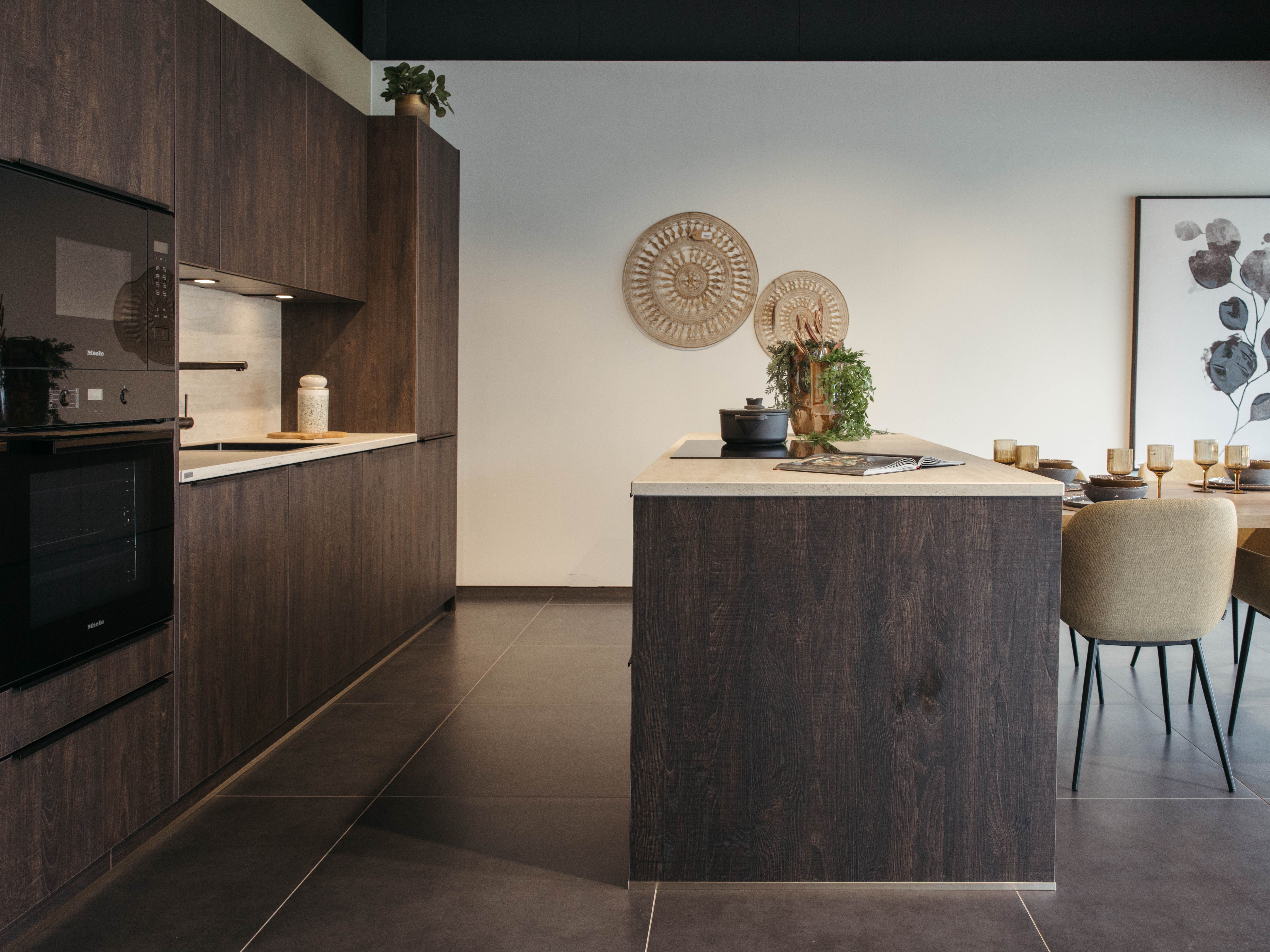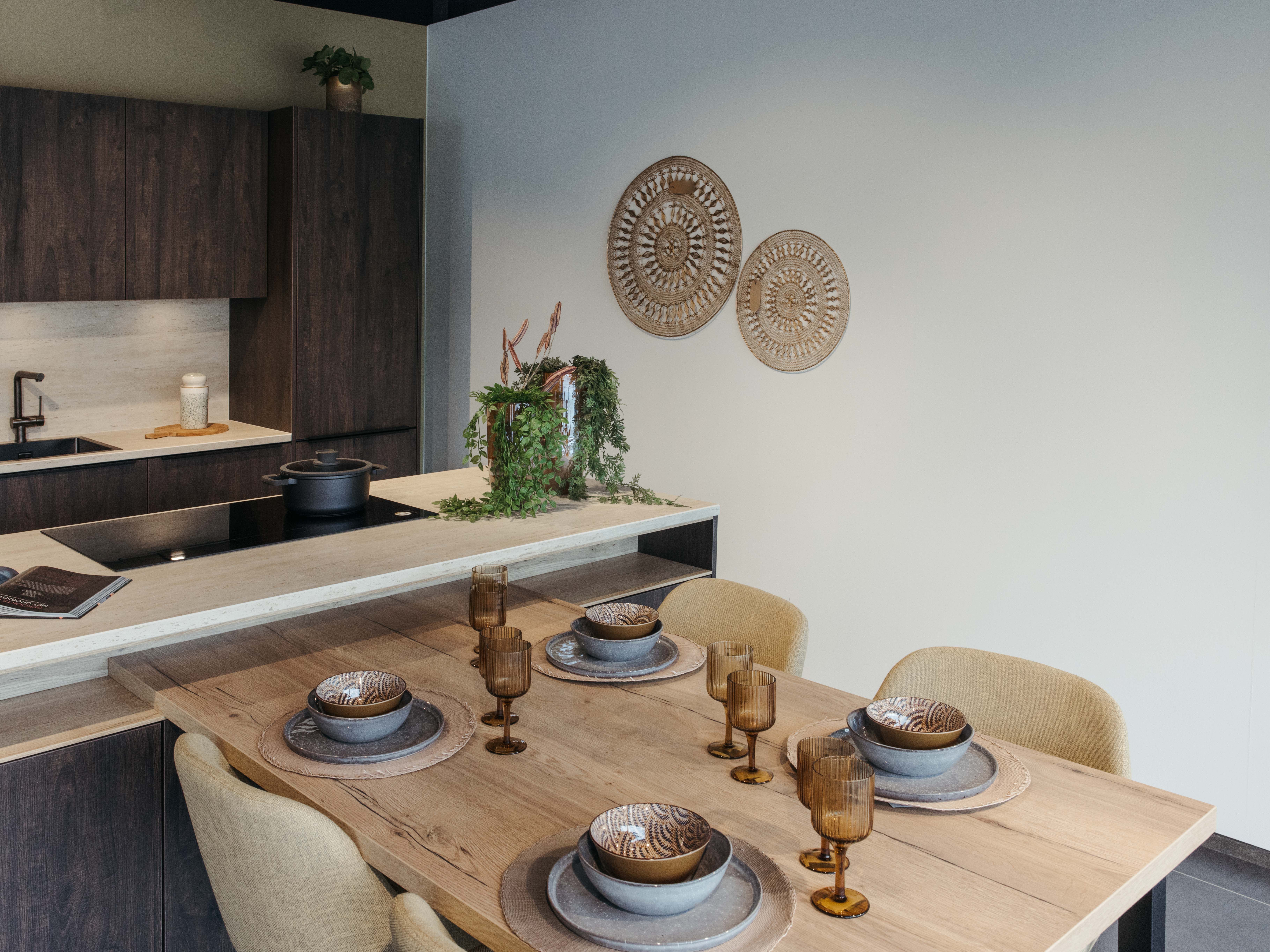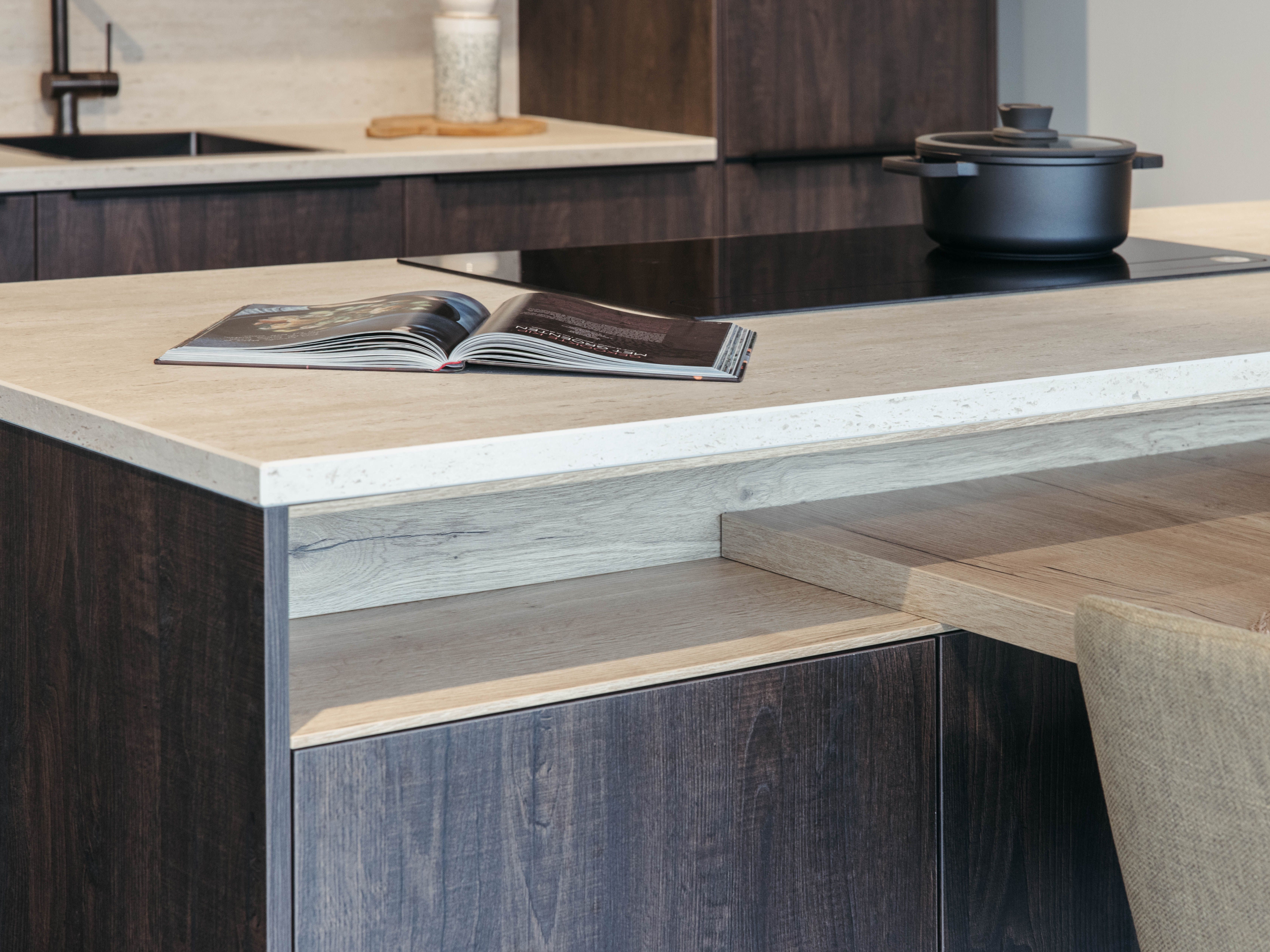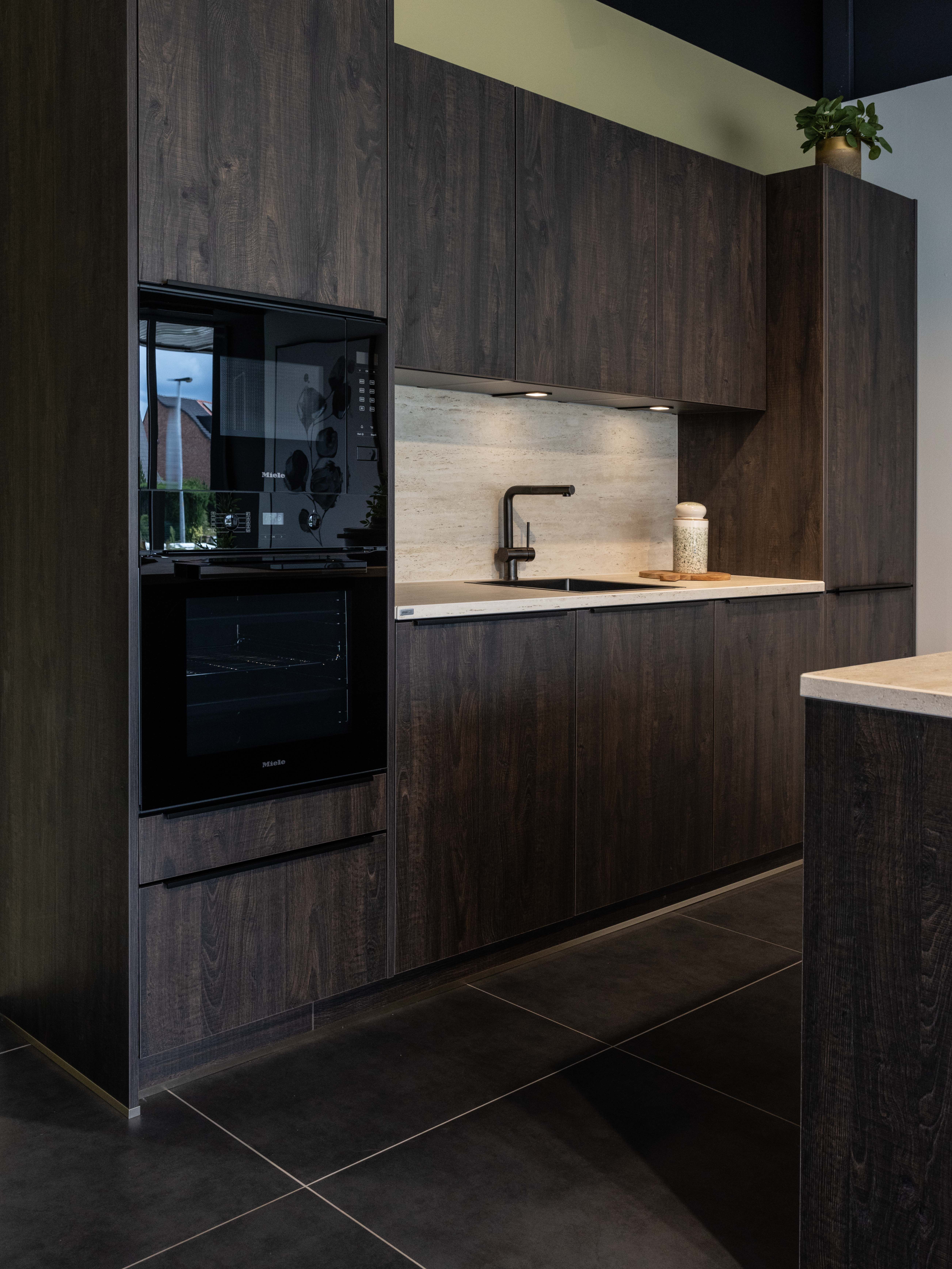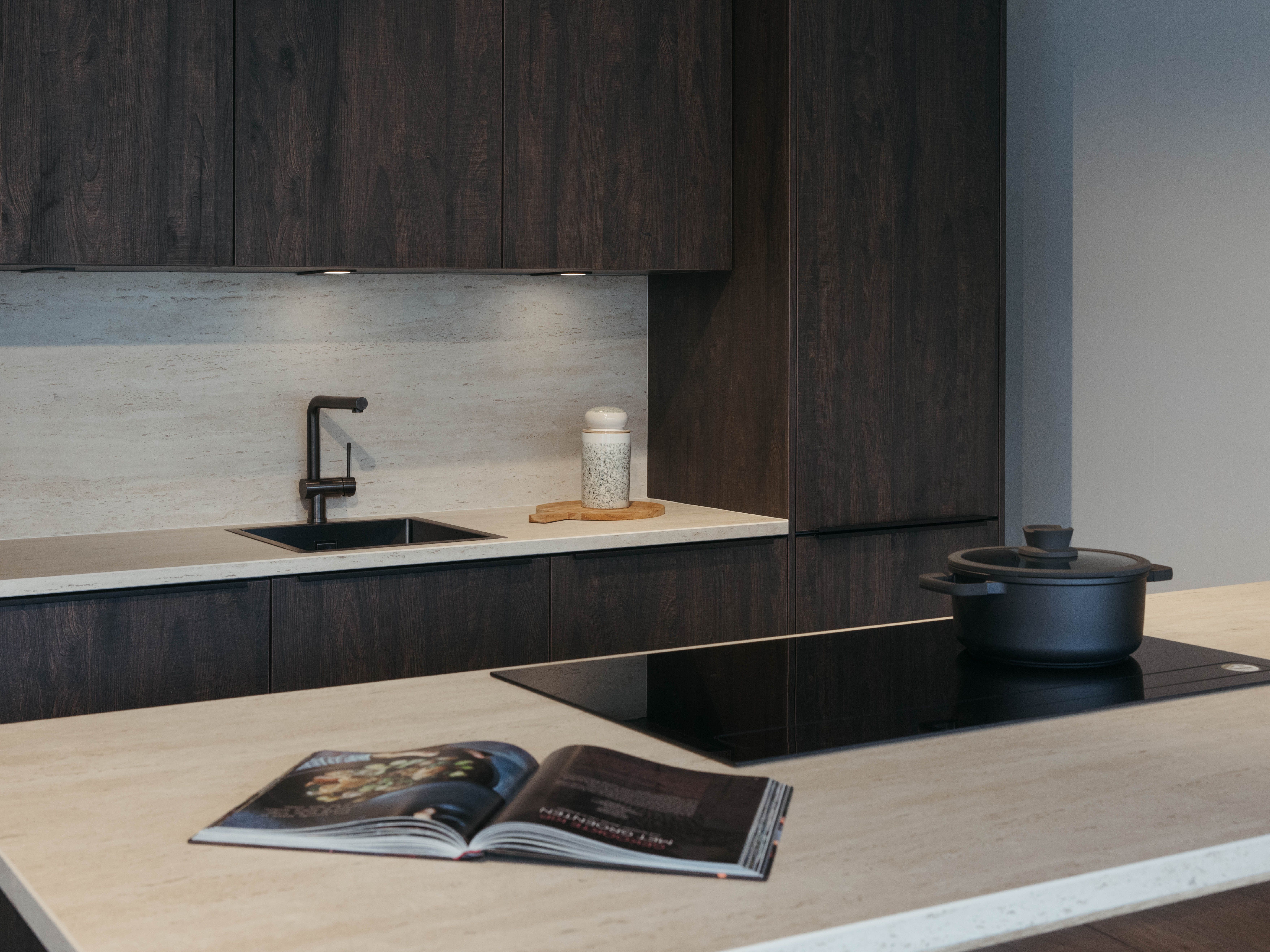 Keuken Sofia is afgewerkt met een donkere houtstructuur, zowel voor de keukenkasten als voor het eiland. Een mooi contrasterend werkblad in keramiek travertin en bijpassende spatwand in composiet zorgen voor een uniform geheel. De uittrekbare kraan en spoelbak in gunmetal versterken het stoere karakter van deze moderne keuken. Het eiland met tafel creëert extra opbergruimte én zitplaatsen. In het eiland werd een panorama kookvuur met geïntegreerde dampkap geïnstalleerd, voor een open gevoel en extra gebruiksgemak. Zo maak je altijd deel uit van het gezinsleven, ook als je een heerlijk menu aan het voorbereiden bent.