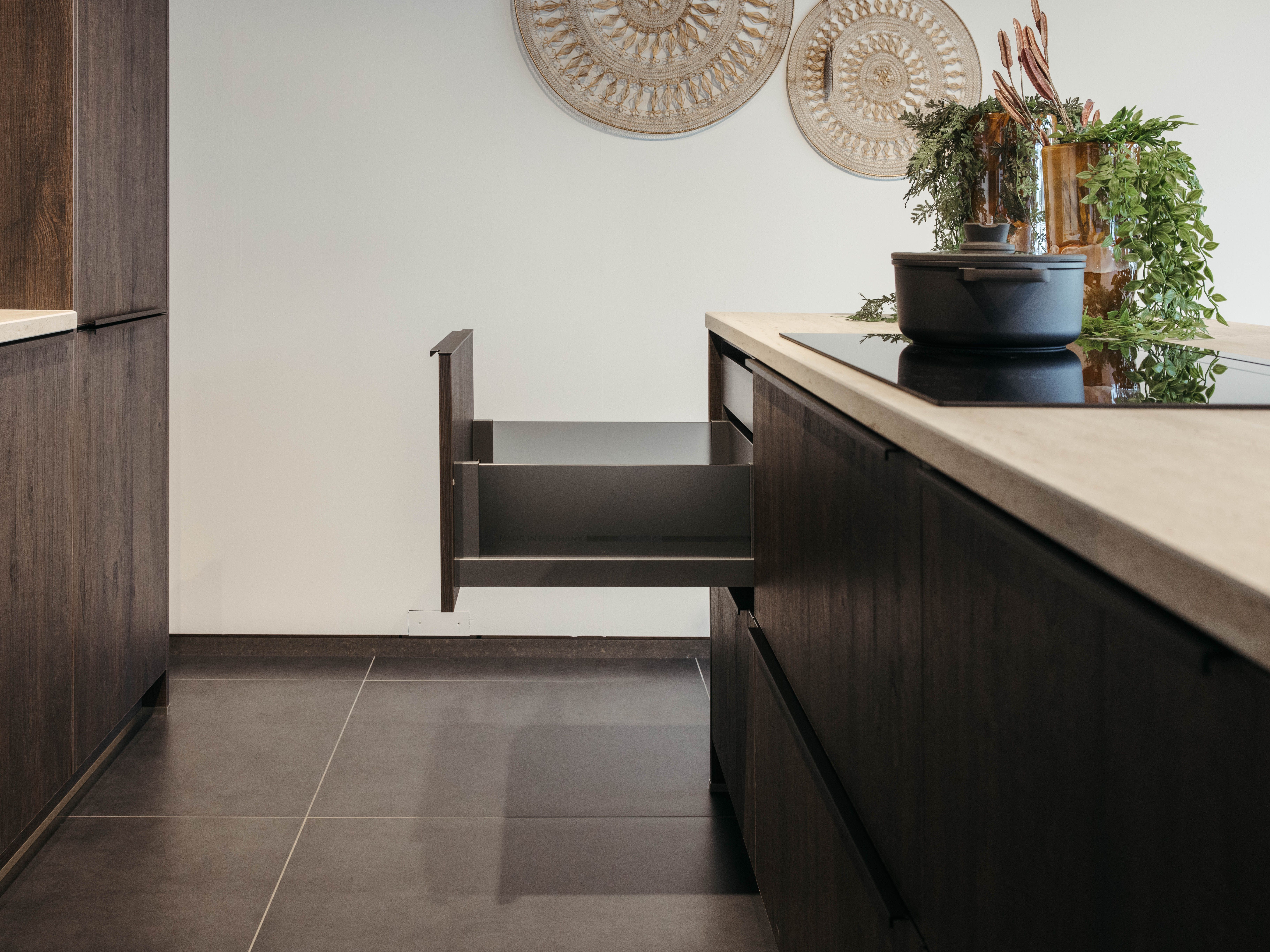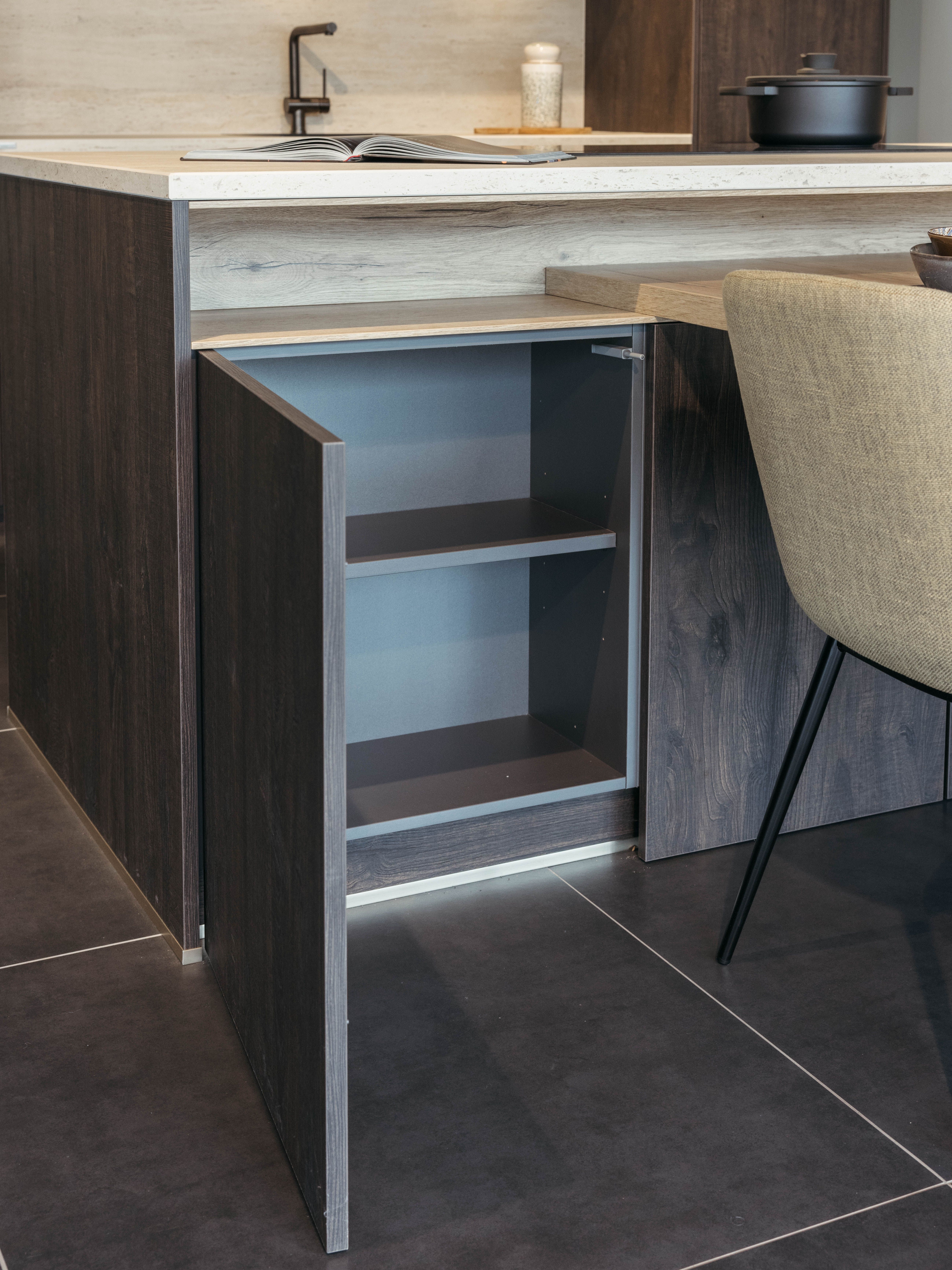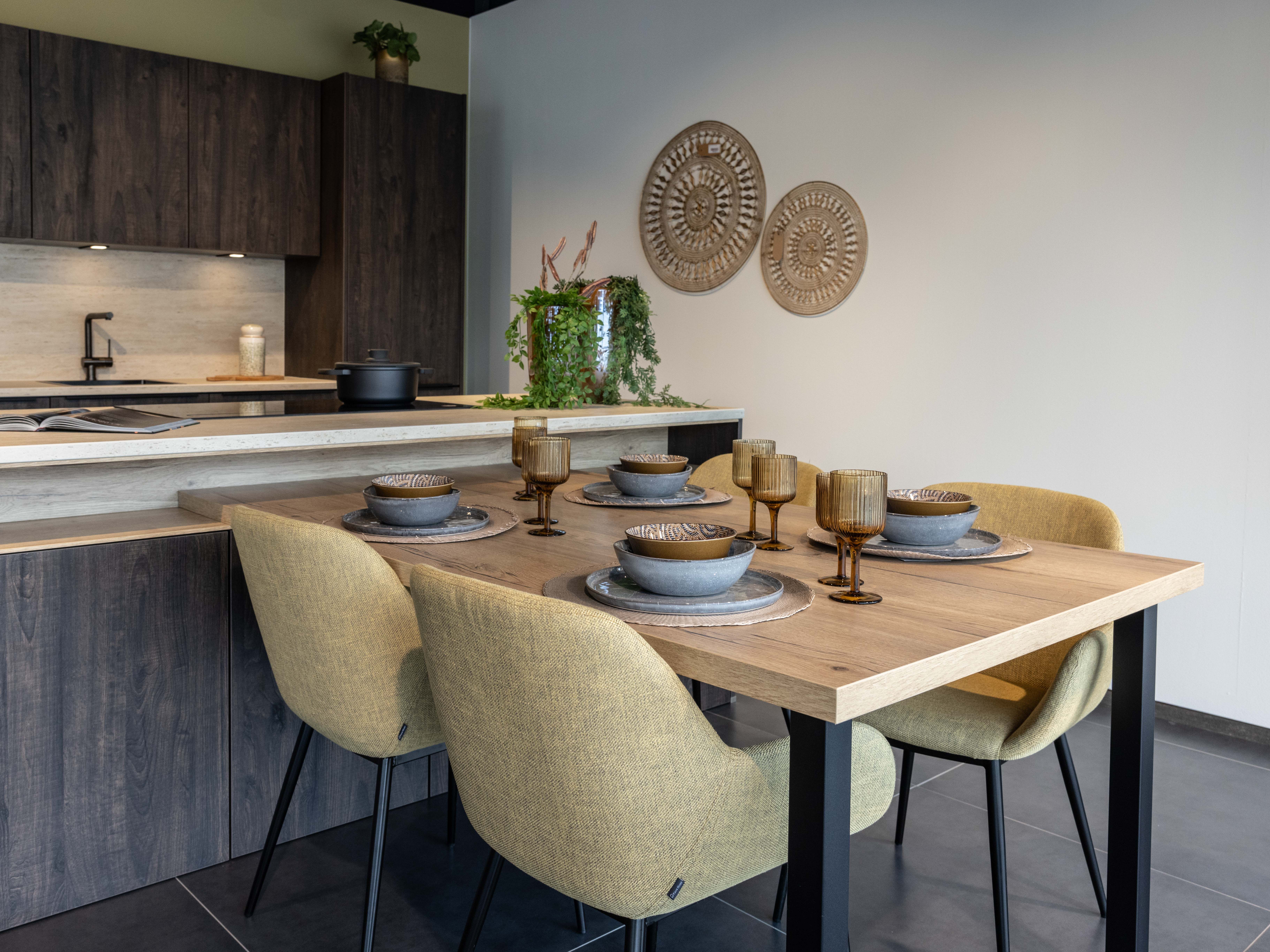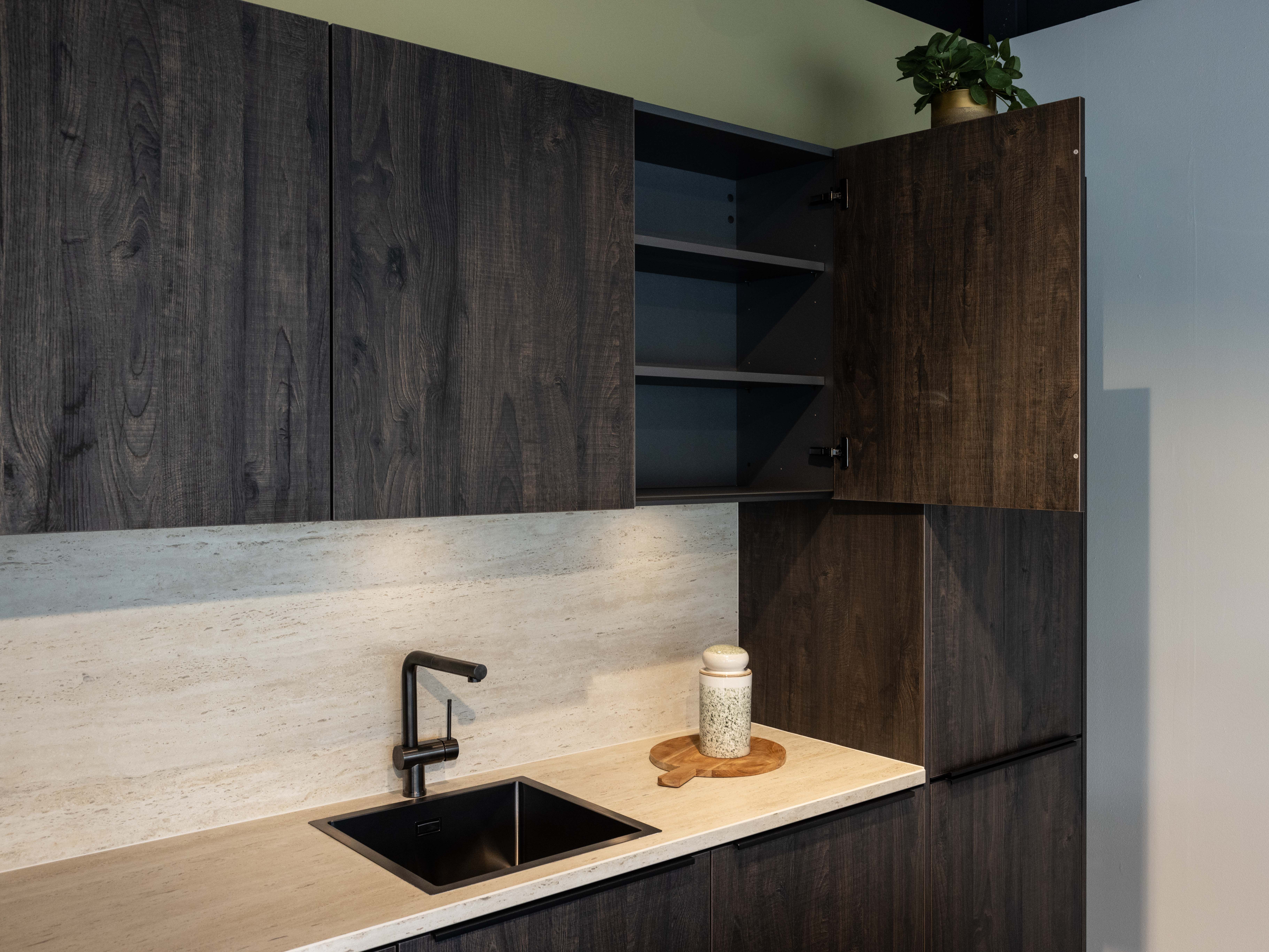 Keuken Sofia is afgewerkt met een donkere houtstructuur, zowel voor de keukenkasten als voor het eiland. Een mooi contrasterend werkblad in keramiek travertin en bijpassende spatwand in composiet zorgen voor een uniform geheel. De uittrekbare kraan en spoelbak in gunmetal versterken het stoere karakter van deze moderne keuken. Het eiland met tafel creëert extra opbergruimte én zitplaatsen. In het eiland werd een panorama kookvuur met geïntegreerde dampkap geïnstalleerd, voor een open gevoel en extra gebruiksgemak. Zo maak je altijd deel uit van het gezinsleven, ook als je een heerlijk menu aan het voorbereiden bent.