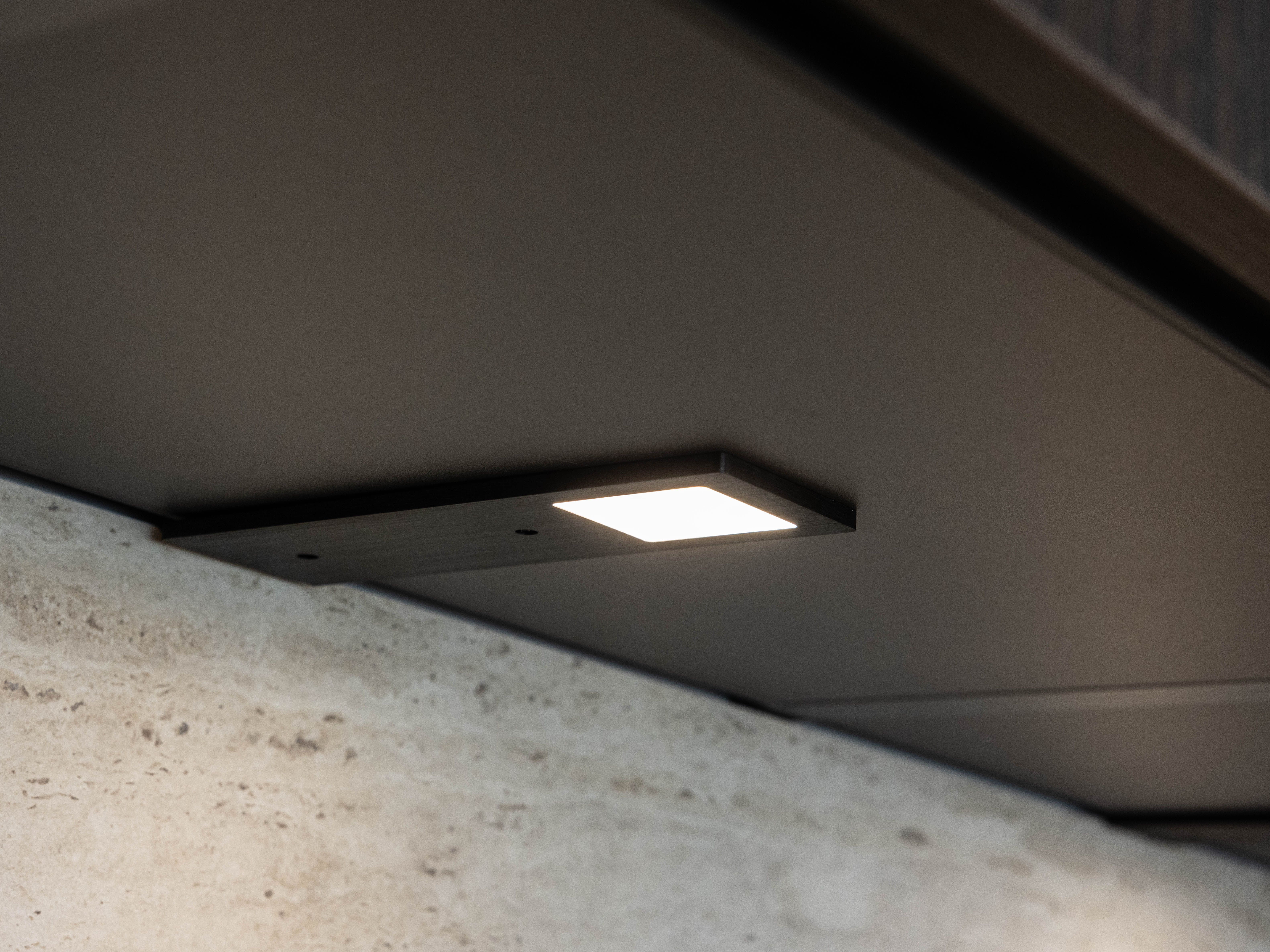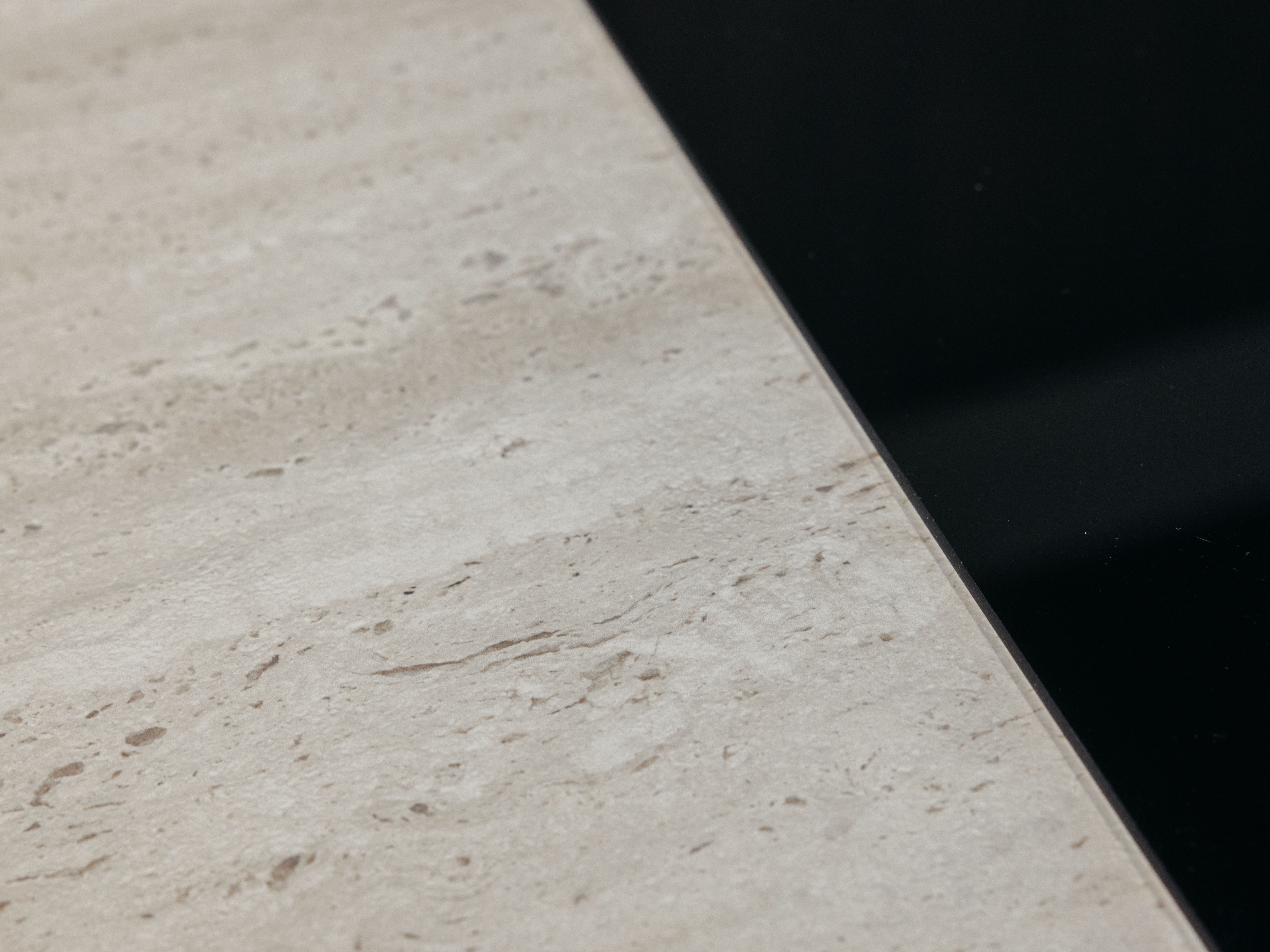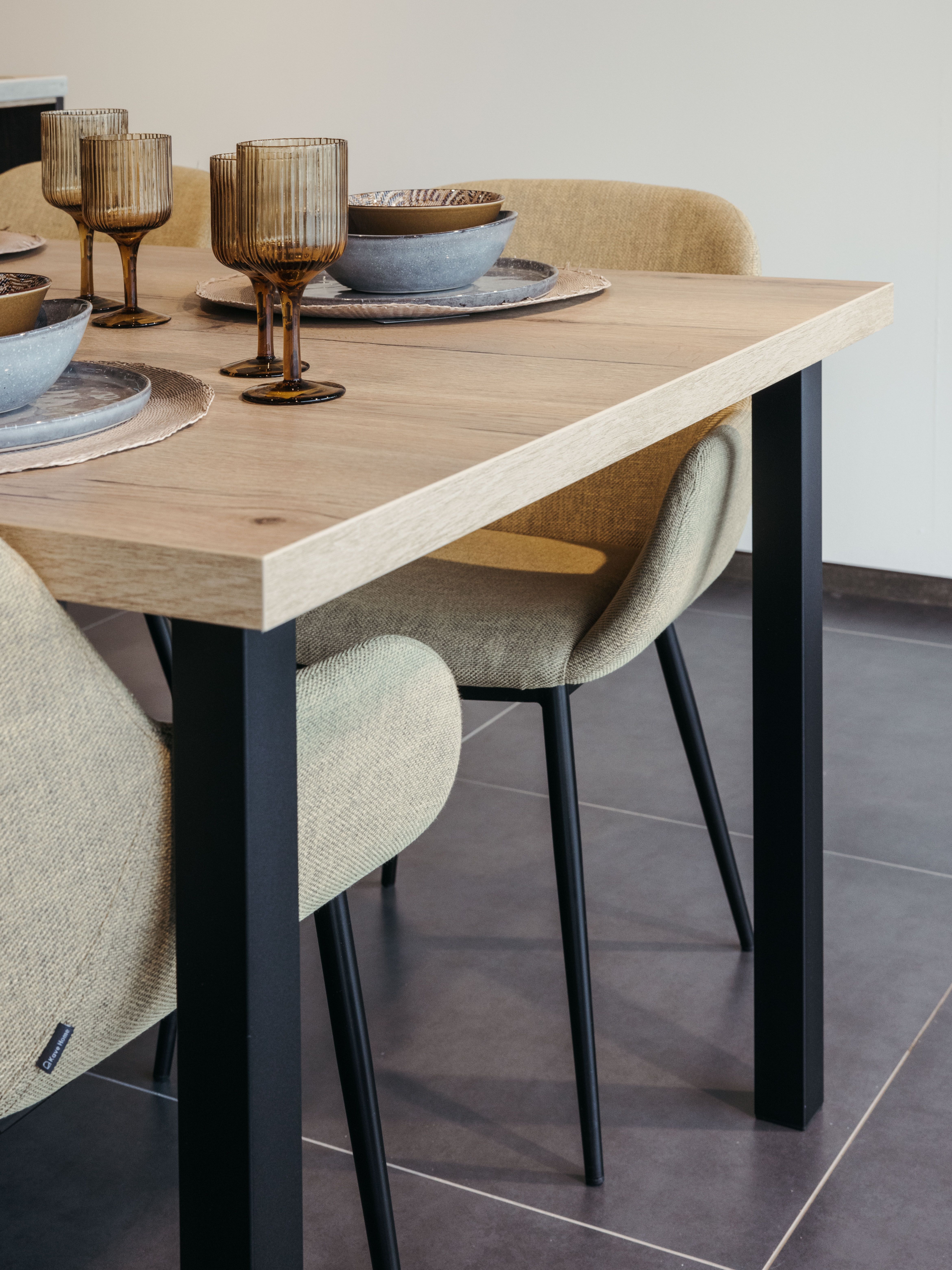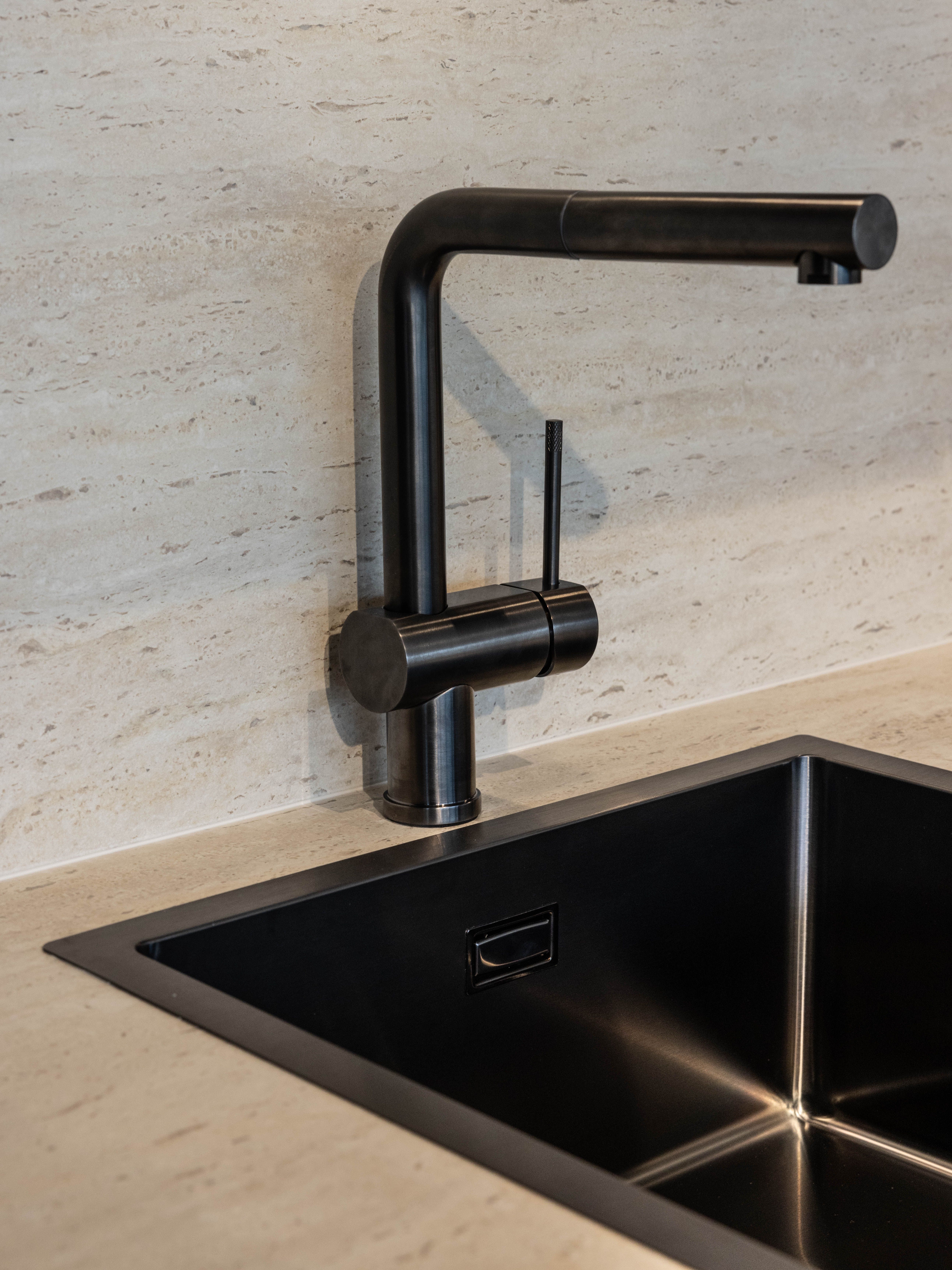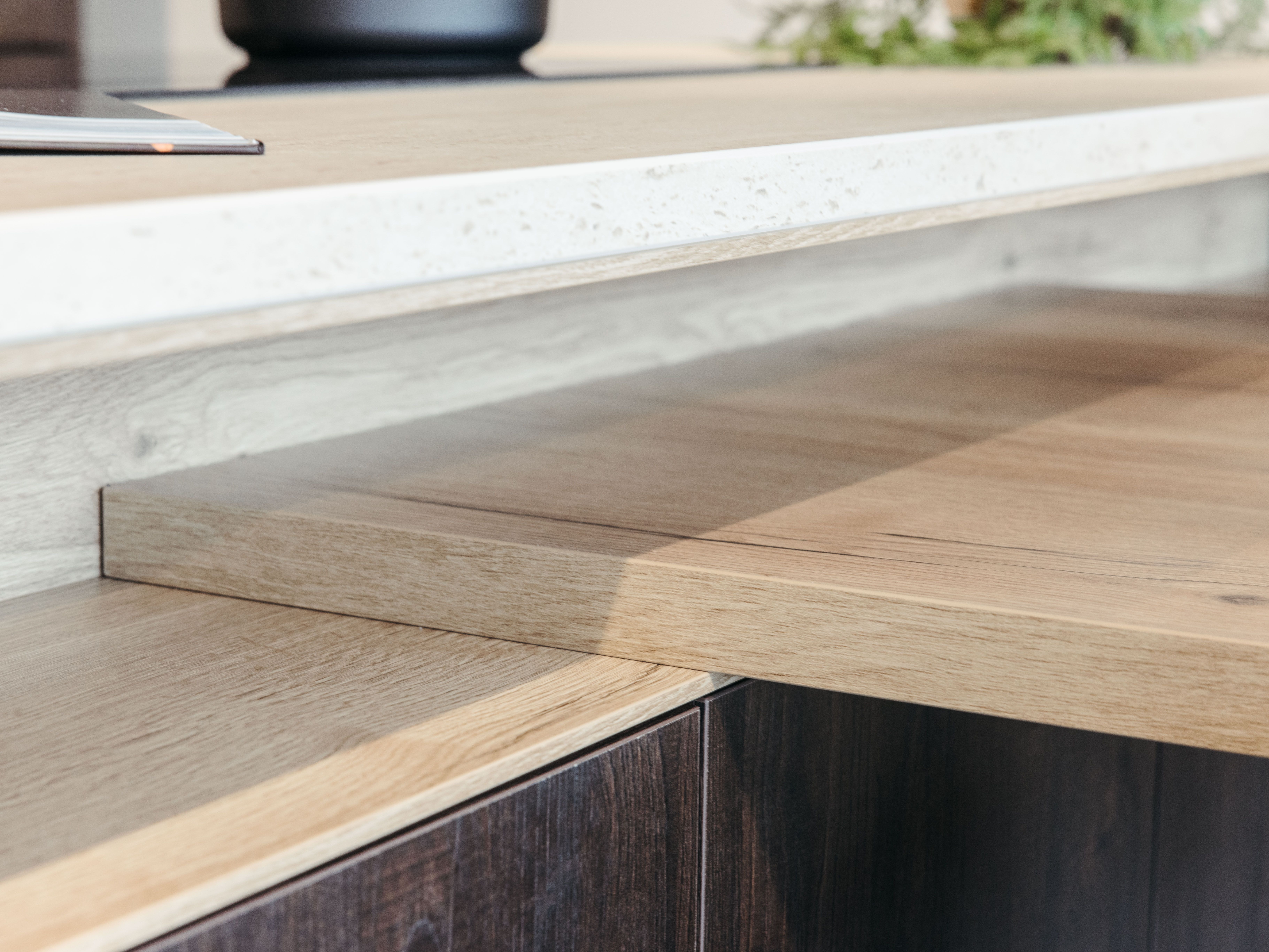 Keuken Sofia is afgewerkt met een donkere houtstructuur, zowel voor de keukenkasten als voor het eiland. Een mooi contrasterend werkblad in keramiek travertin en bijpassende spatwand in composiet zorgen voor een uniform geheel. De uittrekbare kraan en spoelbak in gunmetal versterken het stoere karakter van deze moderne keuken. Het eiland met tafel creëert extra opbergruimte én zitplaatsen. In het eiland werd een panorama kookvuur met geïntegreerde dampkap geïnstalleerd, voor een open gevoel en extra gebruiksgemak. Zo maak je altijd deel uit van het gezinsleven, ook als je een heerlijk menu aan het voorbereiden bent.