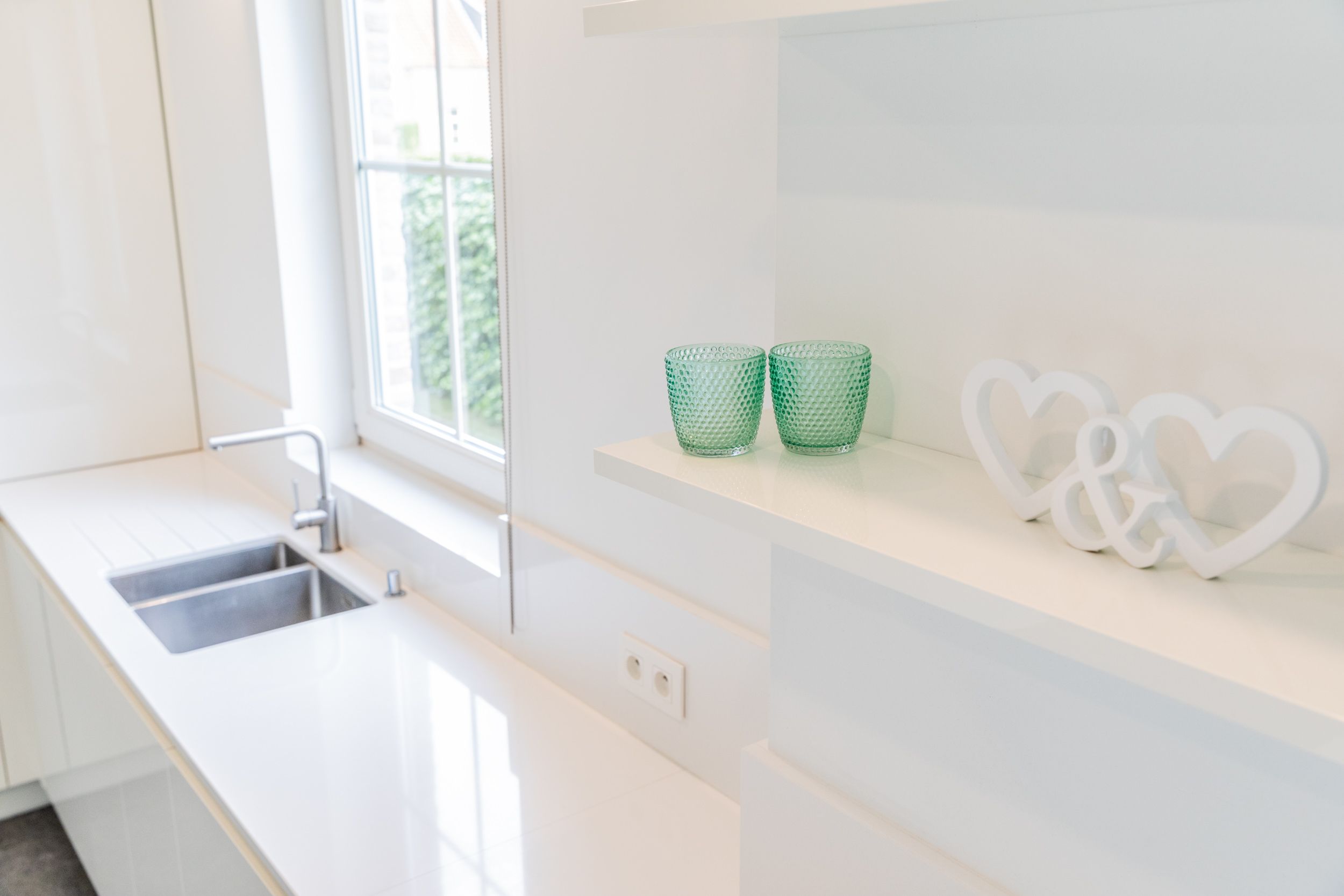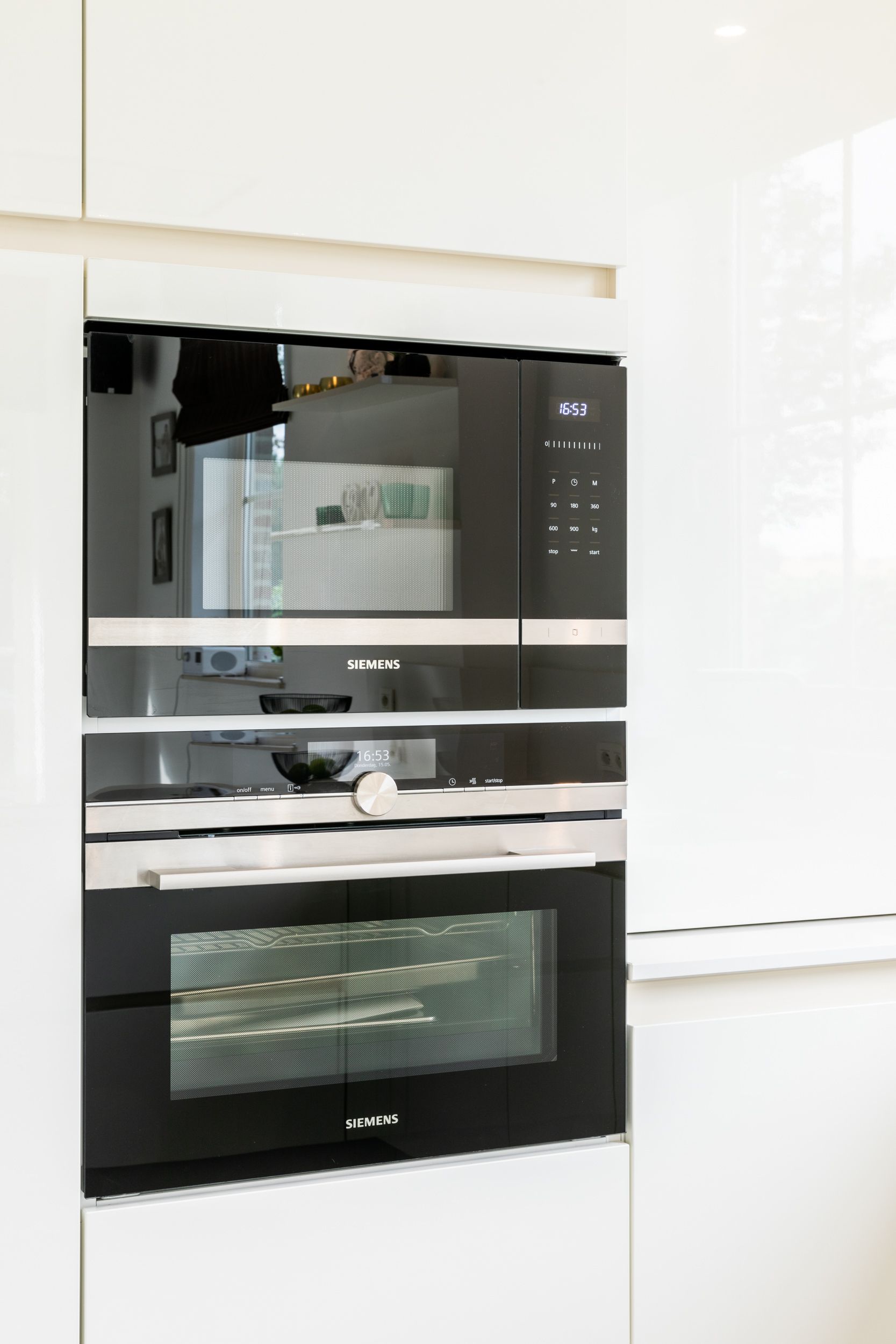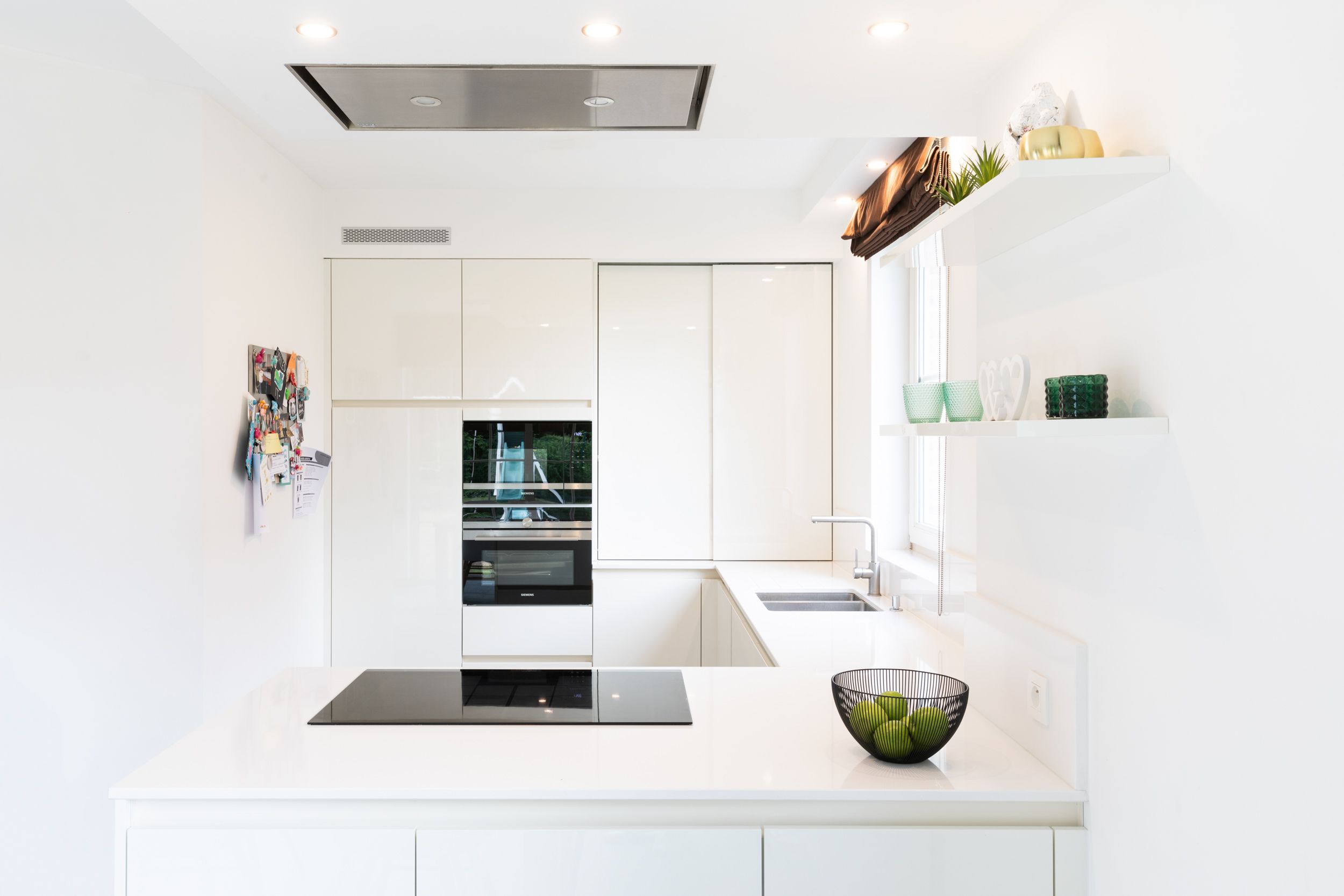 Deze moderne keuken met strak design is een compacte keuken die praktisch is ingericht. Er is goed nagedacht over de inrichting van deze keuken. Alles kreeg de perfecte plaats om het koken vlot en gestroomlijnd te laten verlopen. In deze moderne keuken werd gebruik gemaakt van witte fronten met een hoogglans afwerking. Dit zorgt voor een licht gevoel in de ruimte.