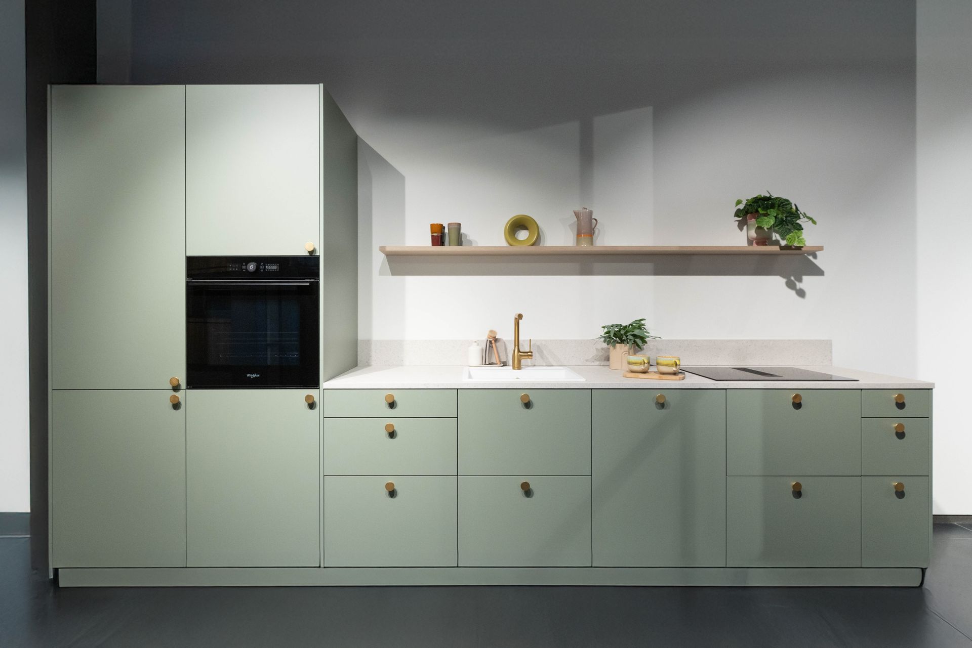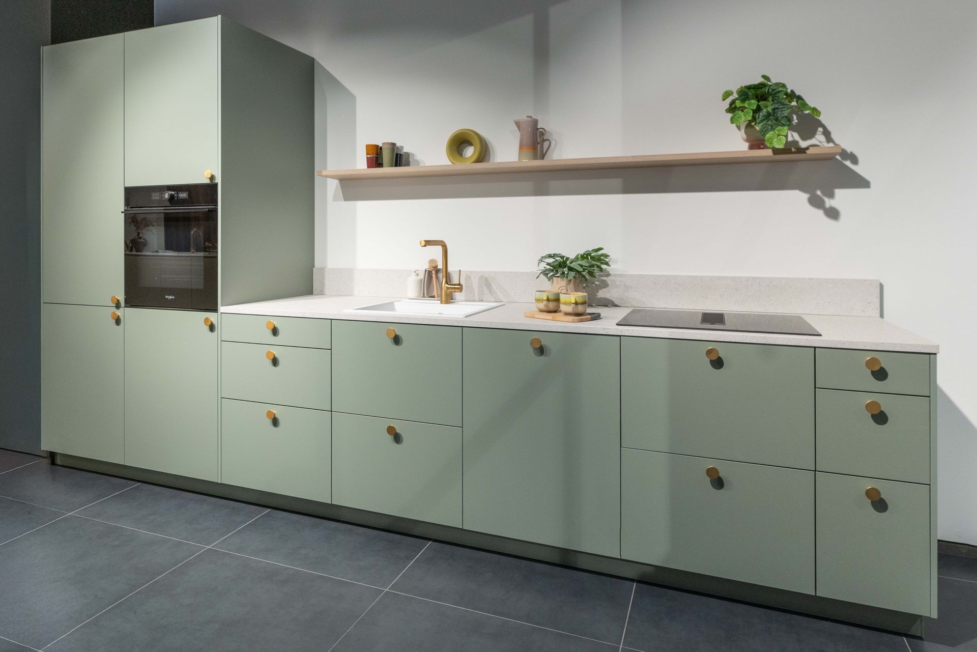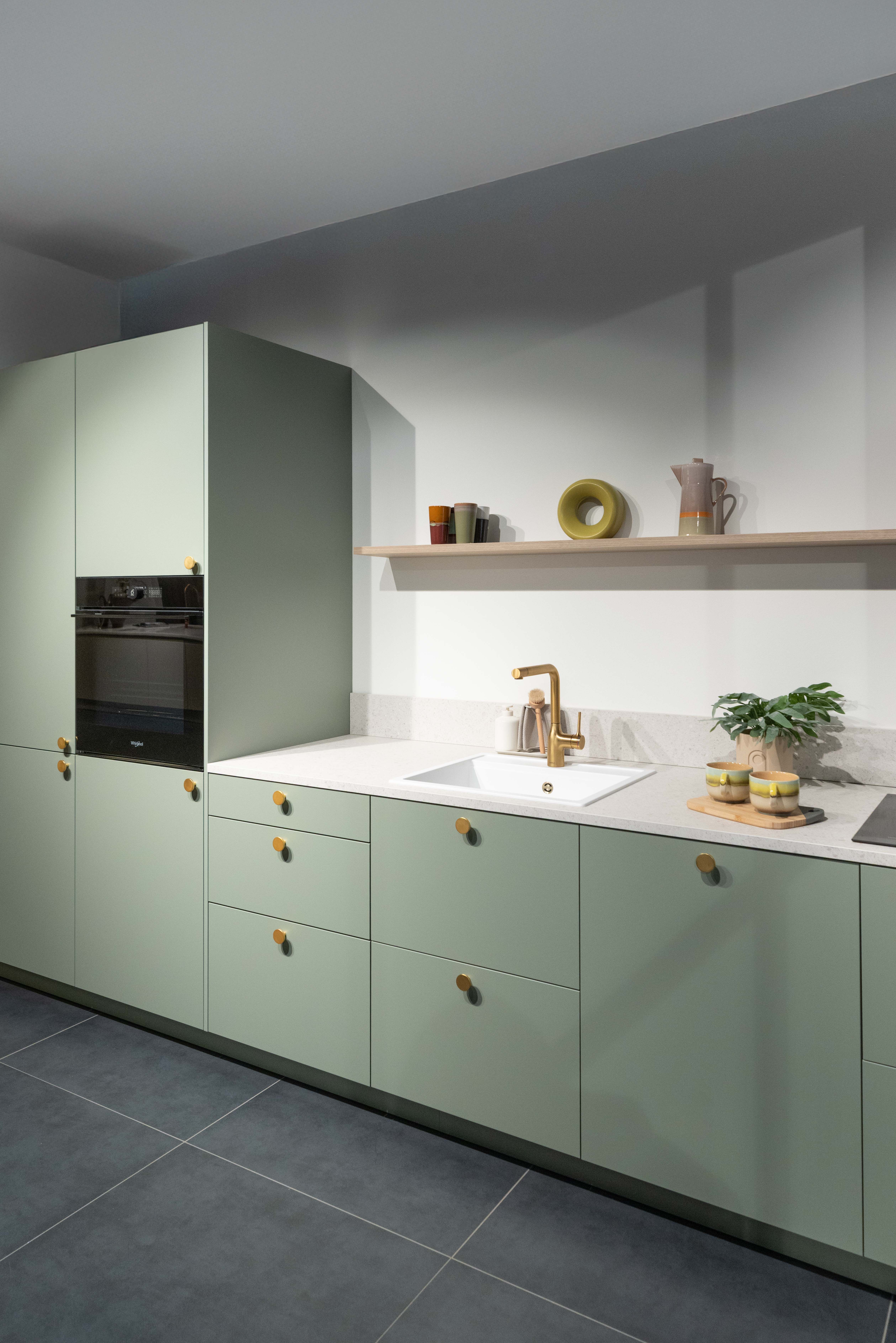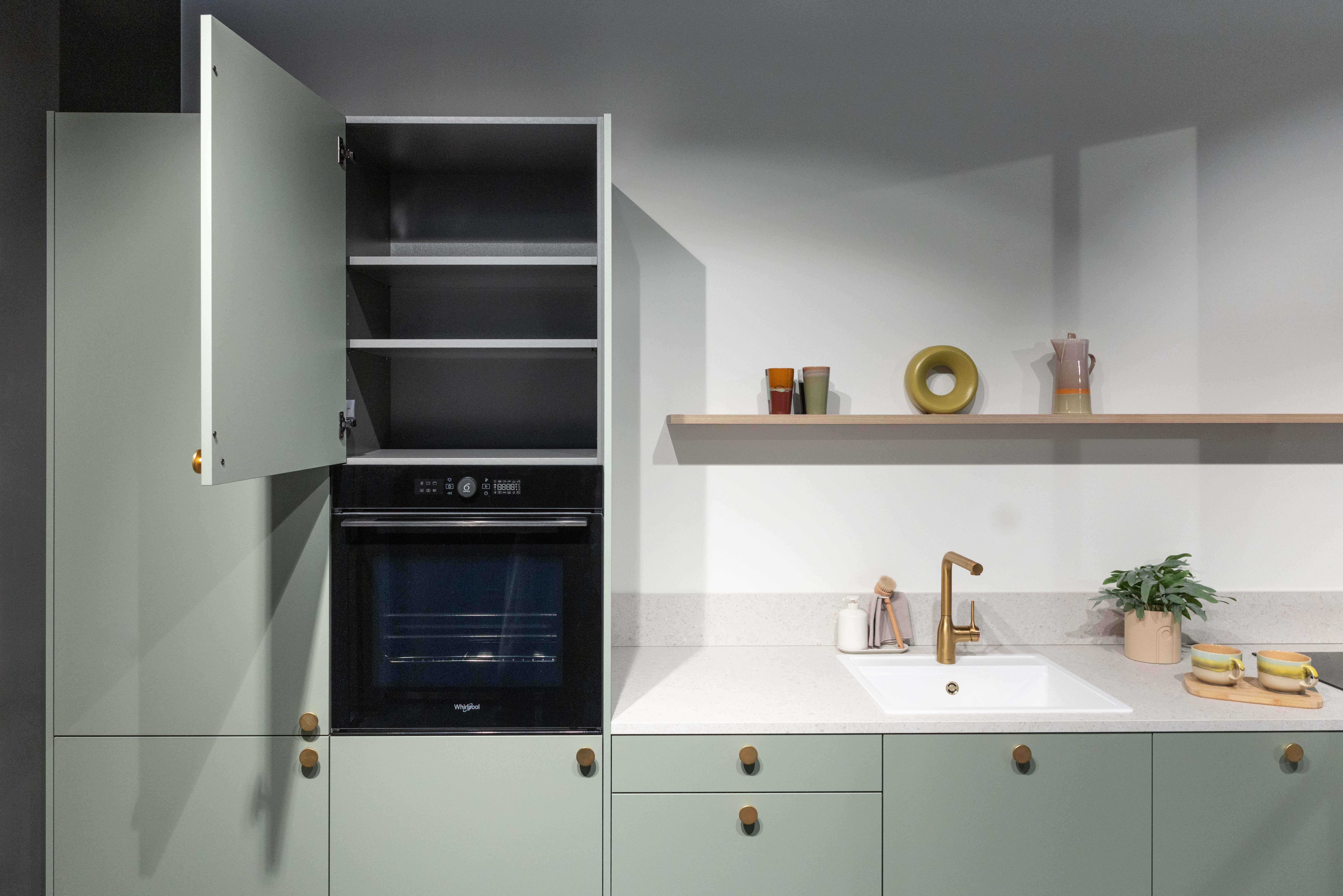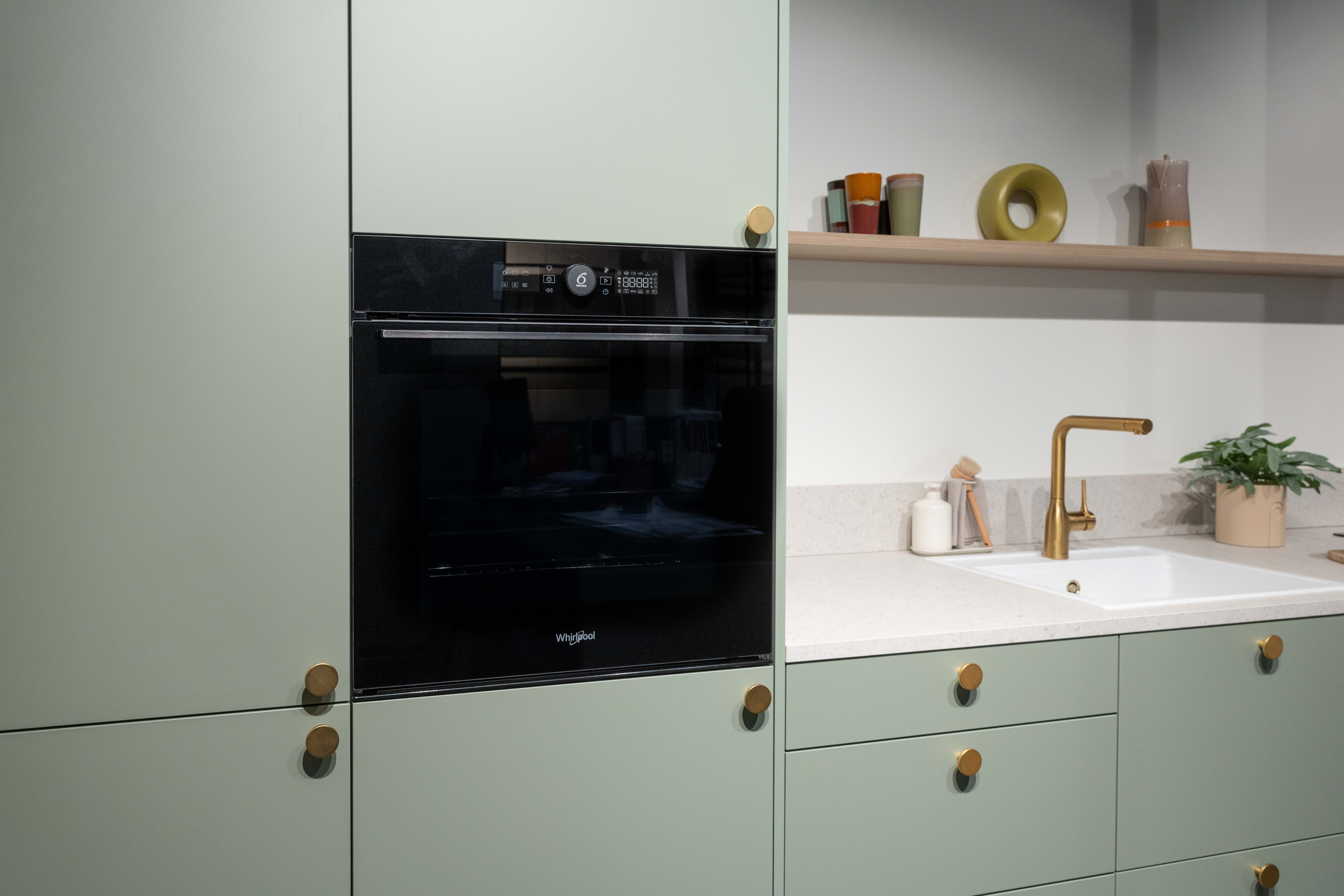 Deze moderne keuken combineert een zachte kleur met stijlvolle details. De zijdematte kunststofdeuren in saliegroen zorgen voor een rustige, eigentijdse uitstraling, terwijl de ronde grepen in messing een warm en elegant accent toevoegen. Het terrazzo laminaat werkblad geeft het geheel een speelse en karaktervolle toets. De witte composiet spoelbak met matte messing kraan vormt een mooie blikvanger en past perfect bij het lichte kleurenpalet. Met de Whirlpool oven en de inductiekookplaat met geïntegreerde dampkap is deze keuken niet alleen stijlvol, maar ook bijzonder praktisch in gebruik.