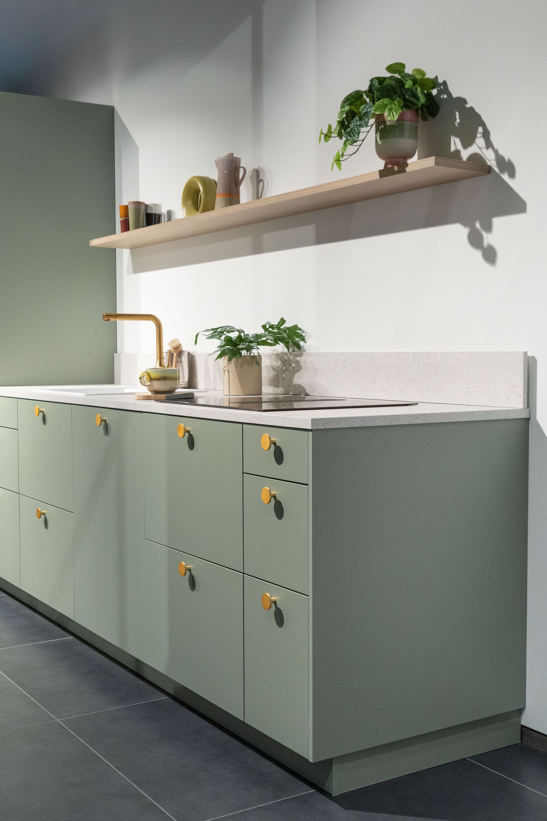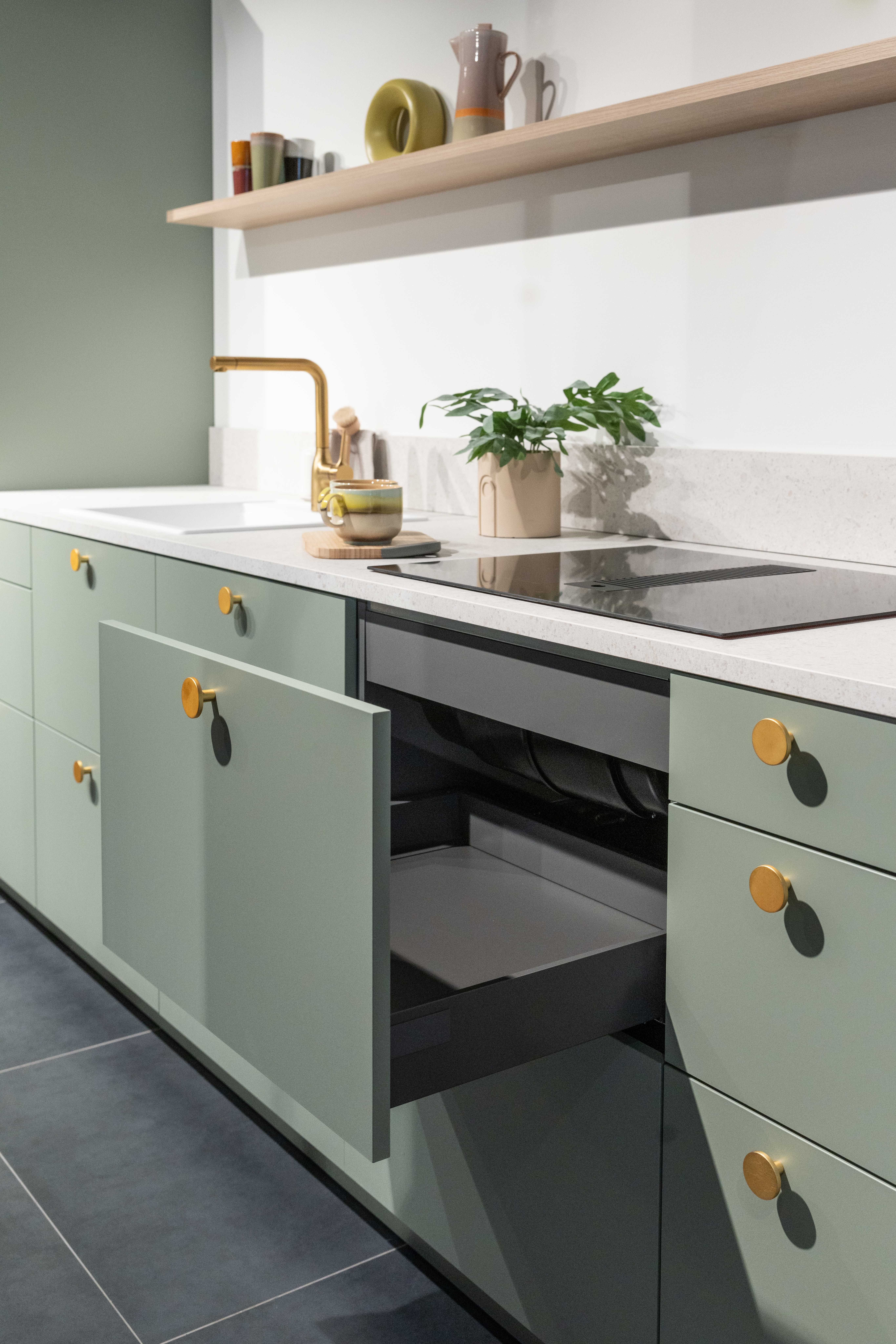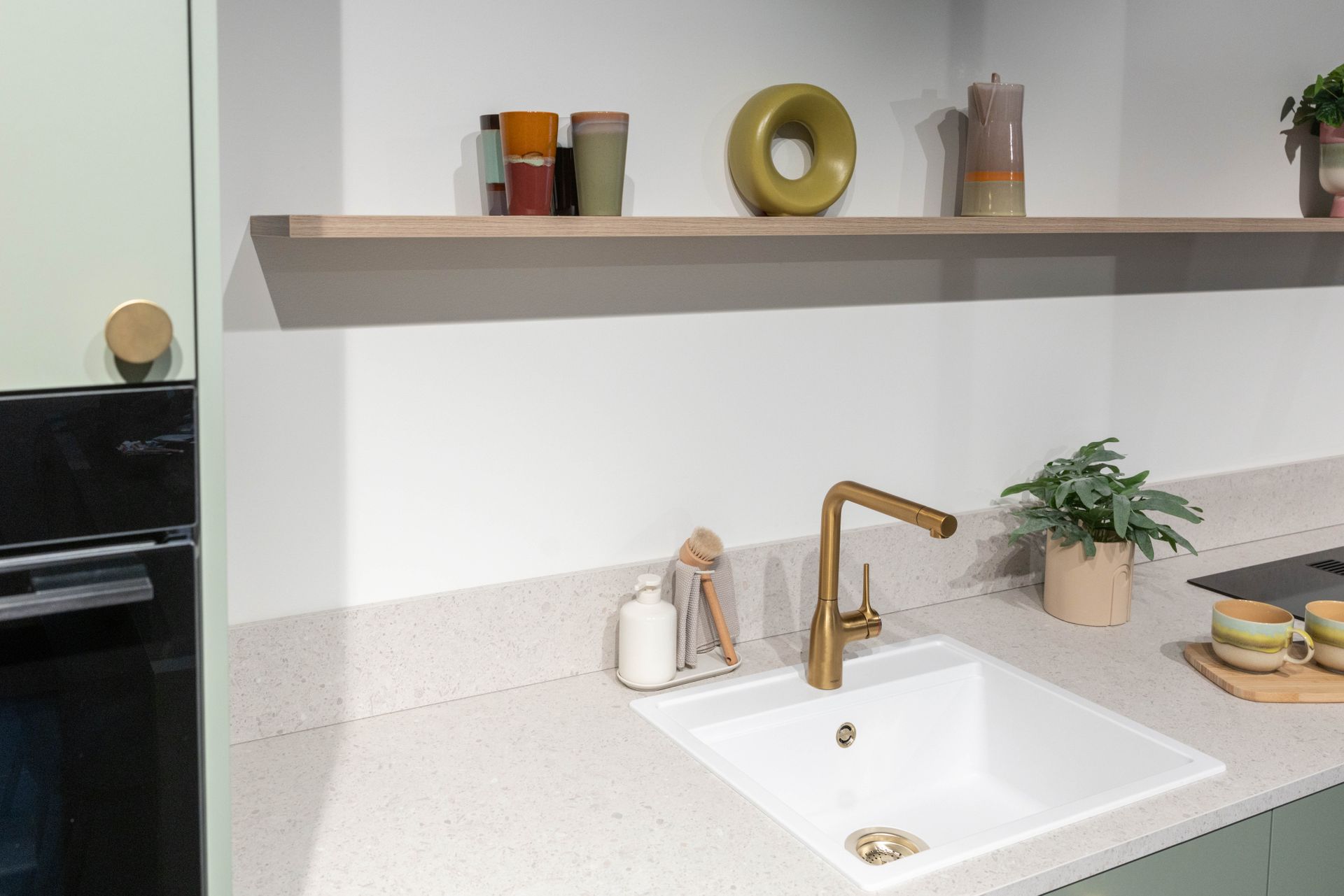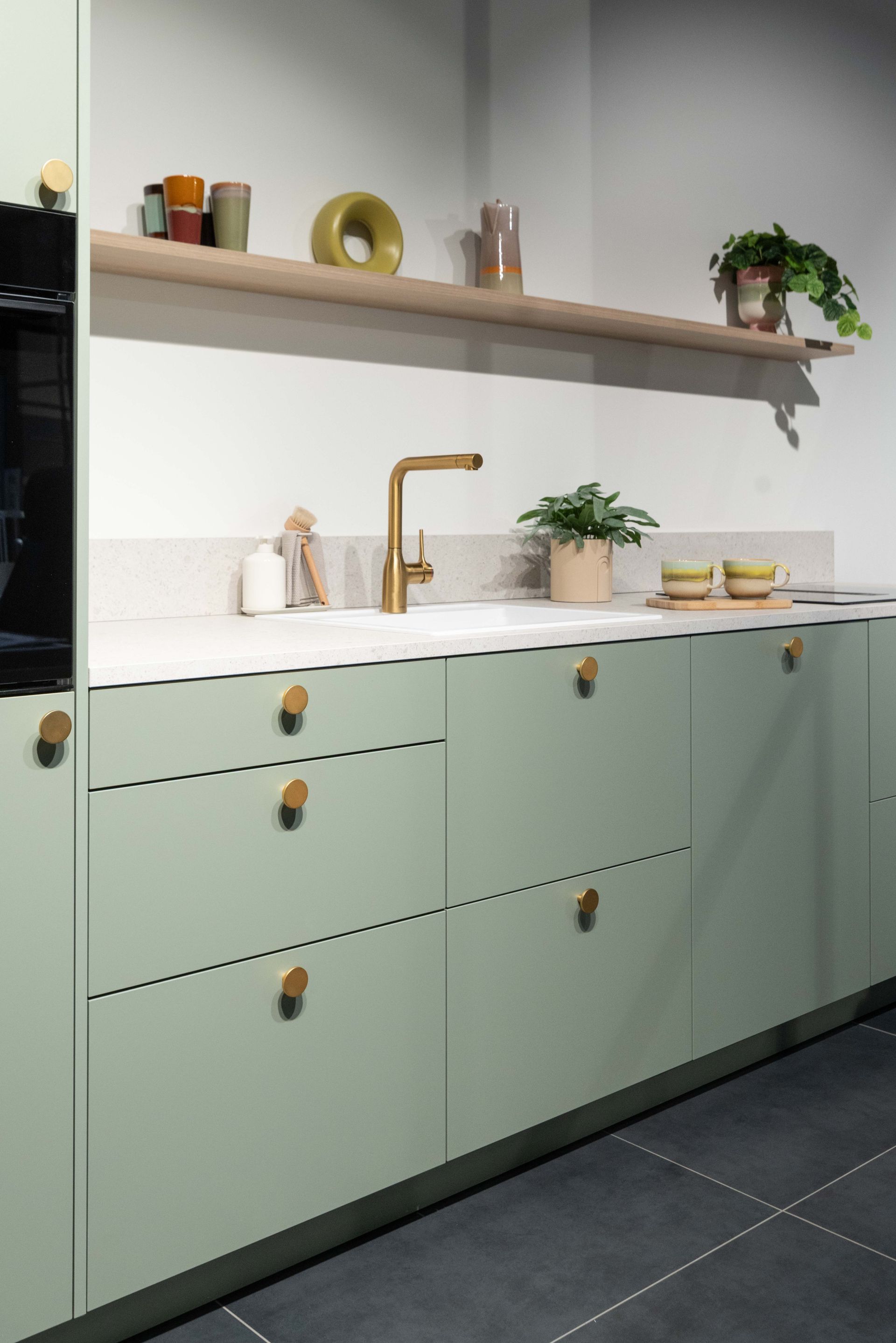 Deze moderne keuken combineert een zachte kleur met stijlvolle details. De zijdematte kunststofdeuren in saliegroen zorgen voor een rustige, eigentijdse uitstraling, terwijl de ronde grepen in messing een warm en elegant accent toevoegen. Het terrazzo laminaat werkblad geeft het geheel een speelse en karaktervolle toets. De witte composiet spoelbak met matte messing kraan vormt een mooie blikvanger en past perfect bij het lichte kleurenpalet. Met de Whirlpool oven en de inductiekookplaat met geïntegreerde dampkap is deze keuken niet alleen stijlvol, maar ook bijzonder praktisch in gebruik.