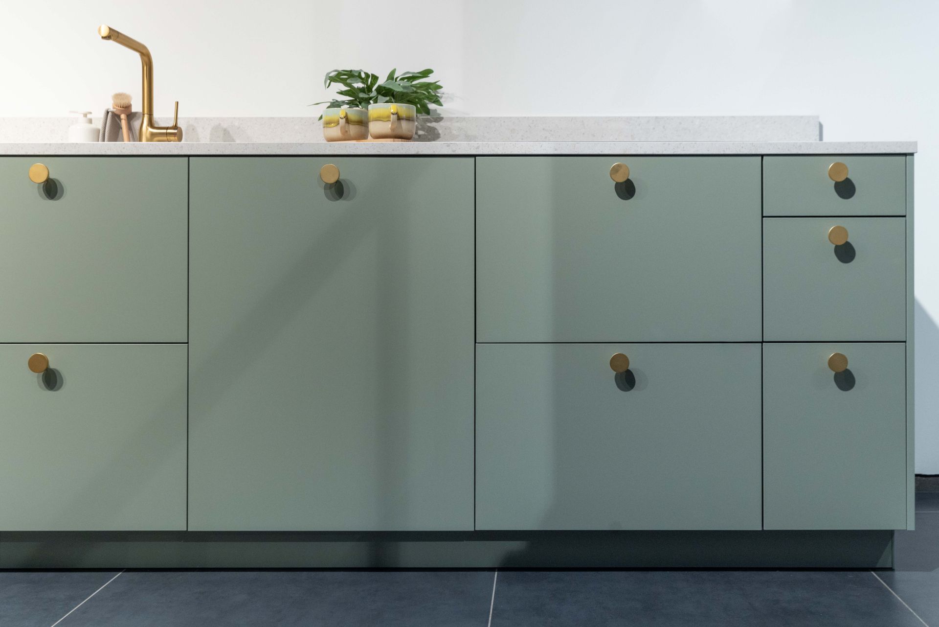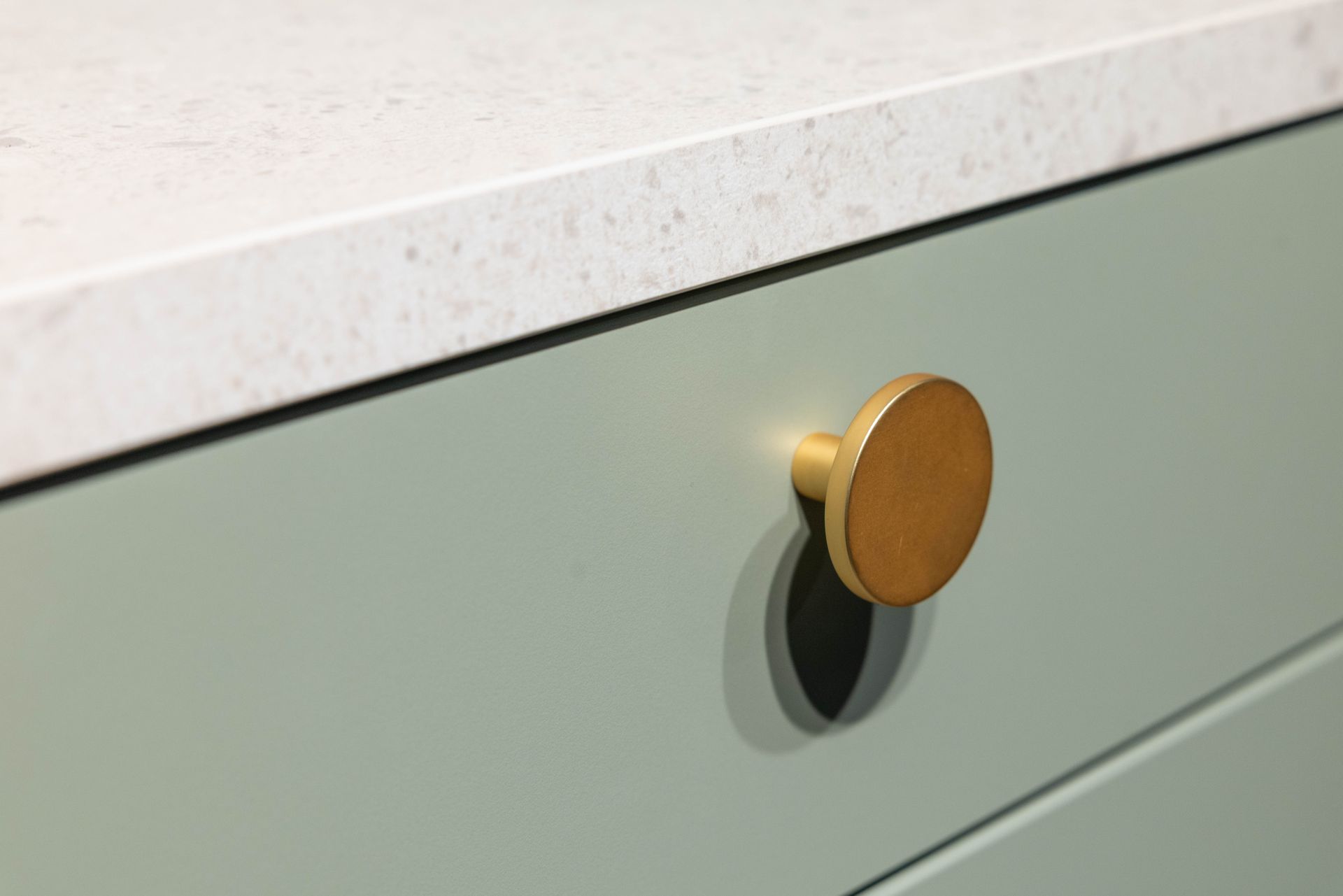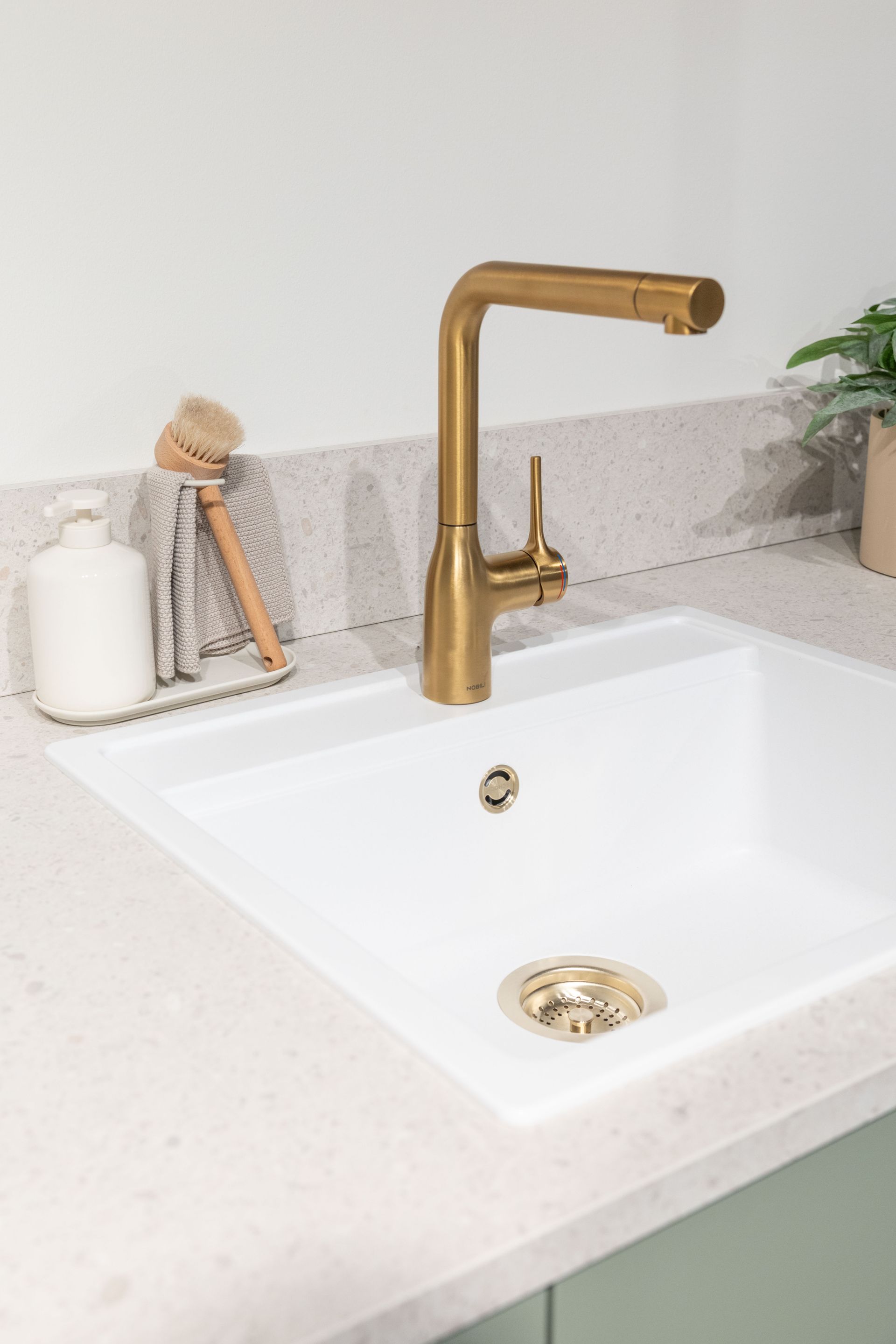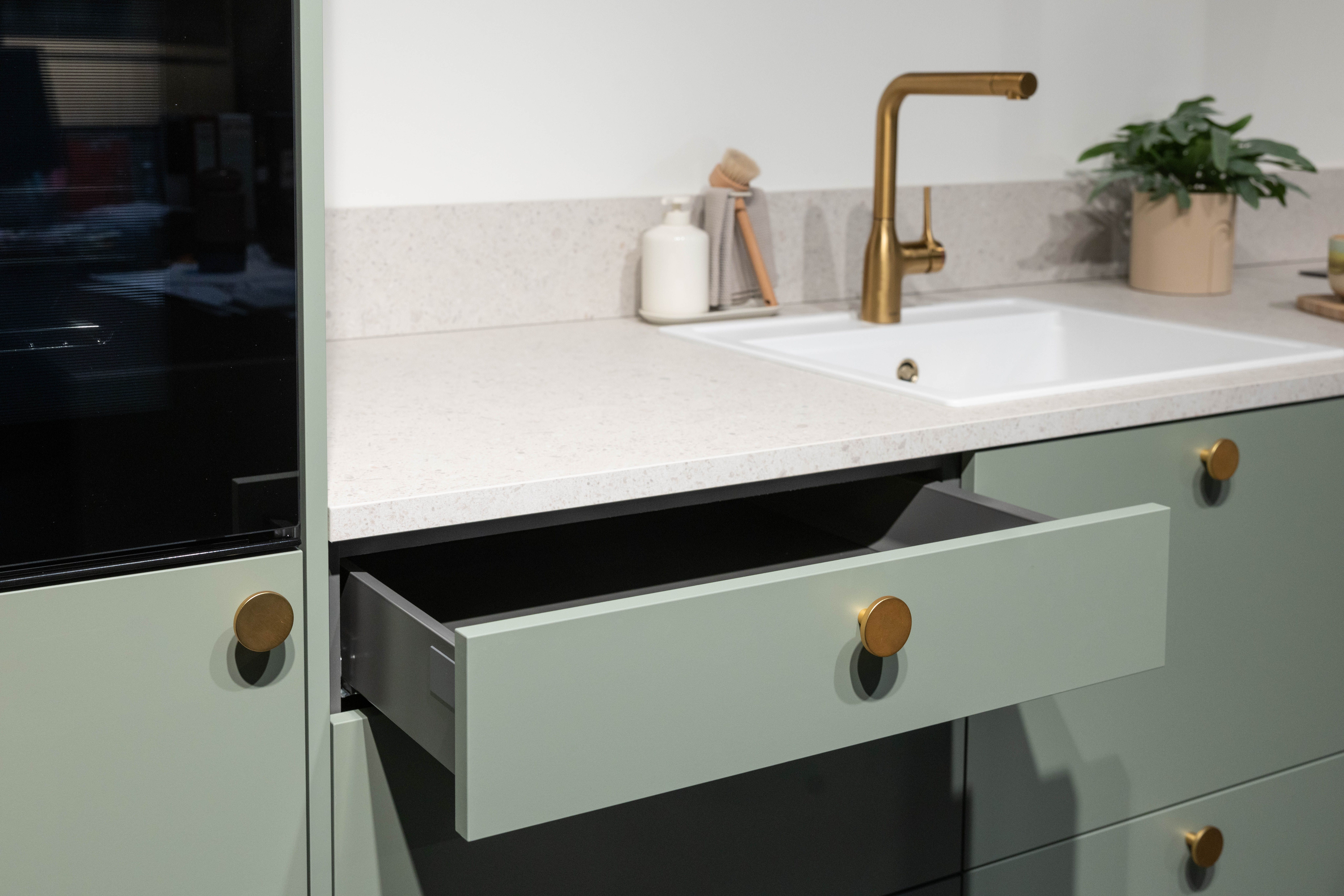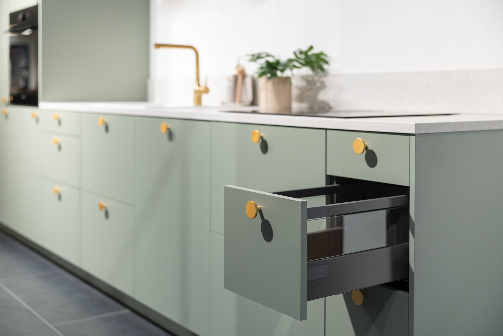 Deze moderne keuken combineert een zachte kleur met stijlvolle details. De zijdematte kunststofdeuren in saliegroen zorgen voor een rustige, eigentijdse uitstraling, terwijl de ronde grepen in messing een warm en elegant accent toevoegen. Het terrazzo laminaat werkblad geeft het geheel een speelse en karaktervolle toets. De witte composiet spoelbak met matte messing kraan vormt een mooie blikvanger en past perfect bij het lichte kleurenpalet. Met de Whirlpool oven en de inductiekookplaat met geïntegreerde dampkap is deze keuken niet alleen stijlvol, maar ook bijzonder praktisch in gebruik.