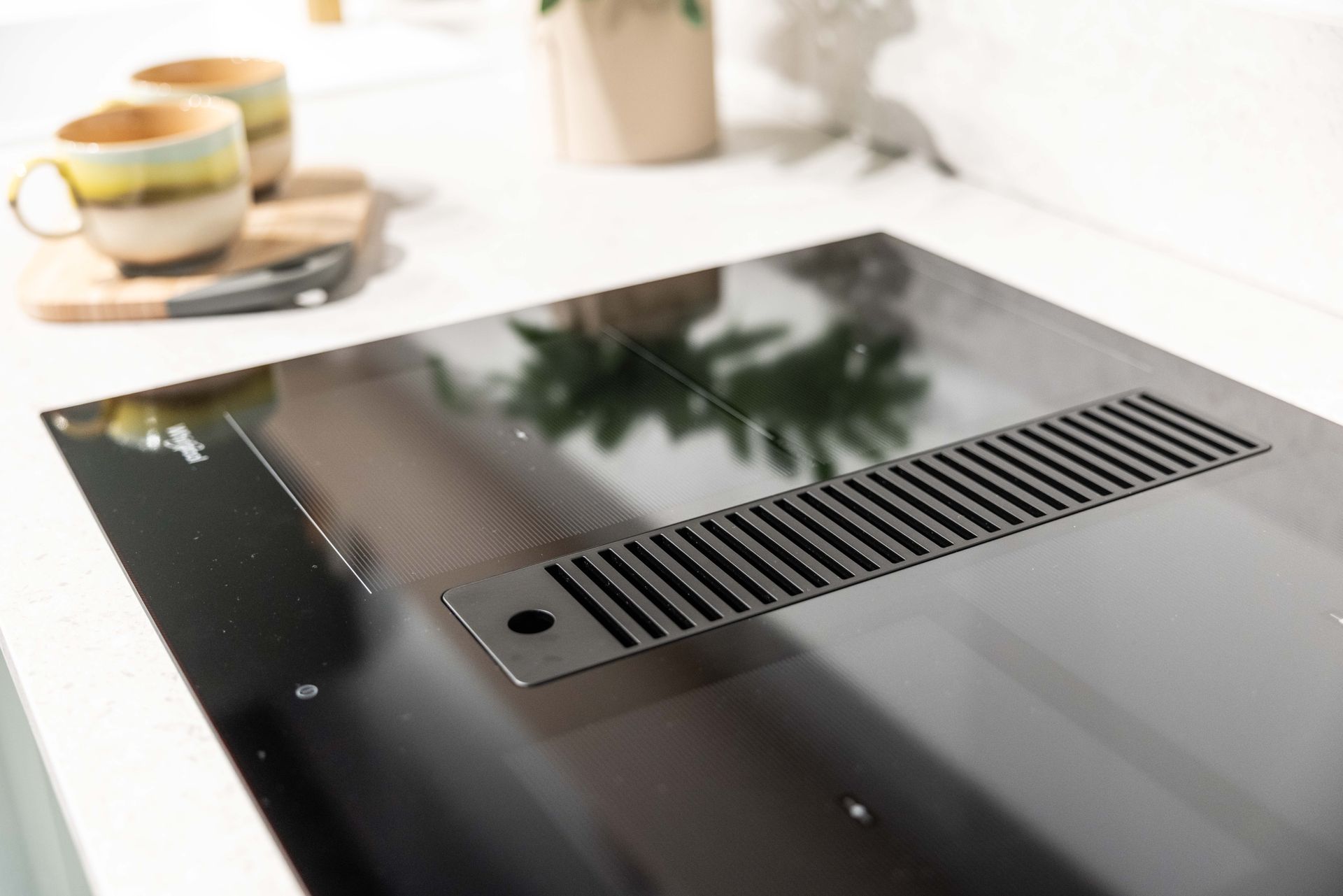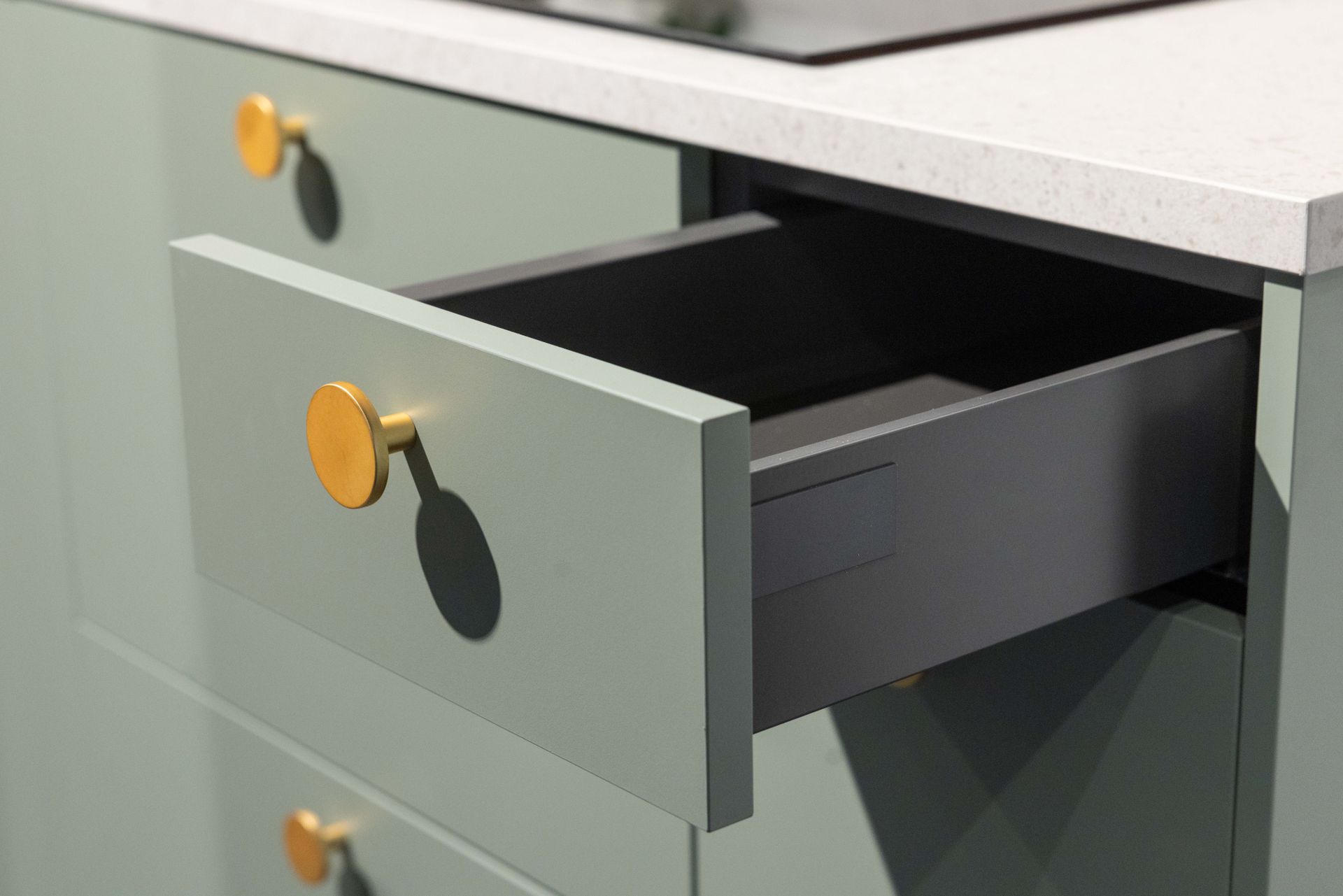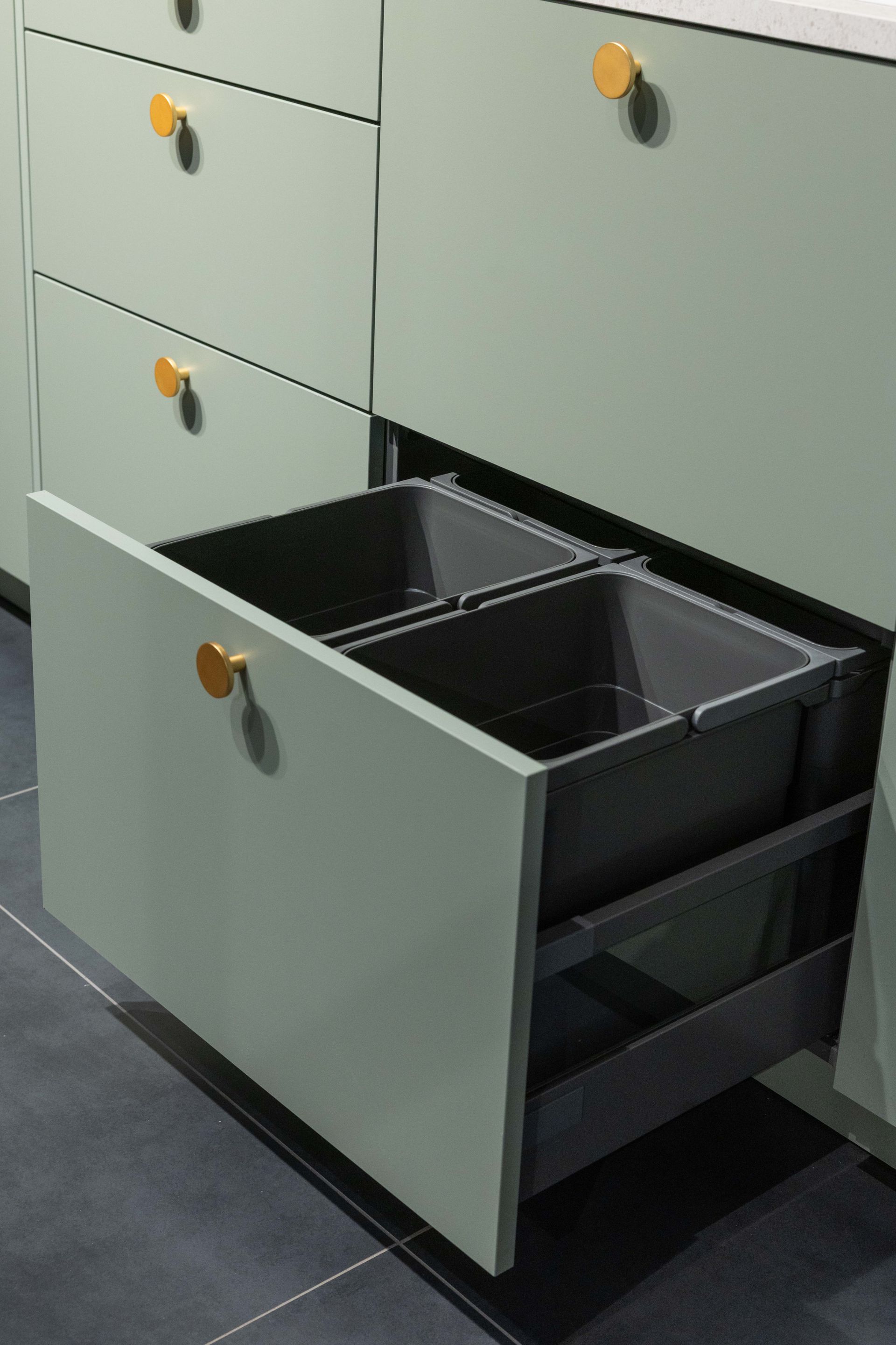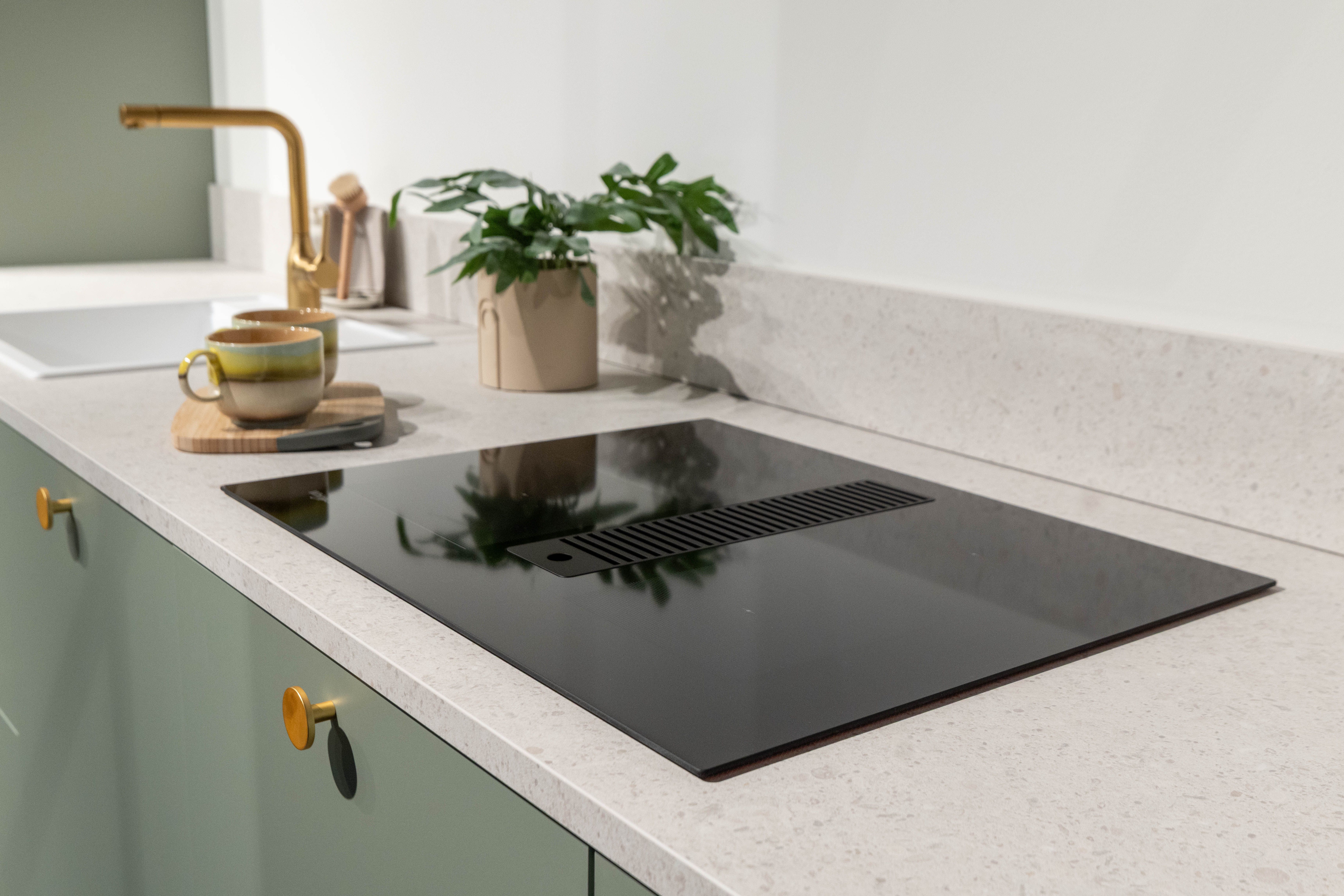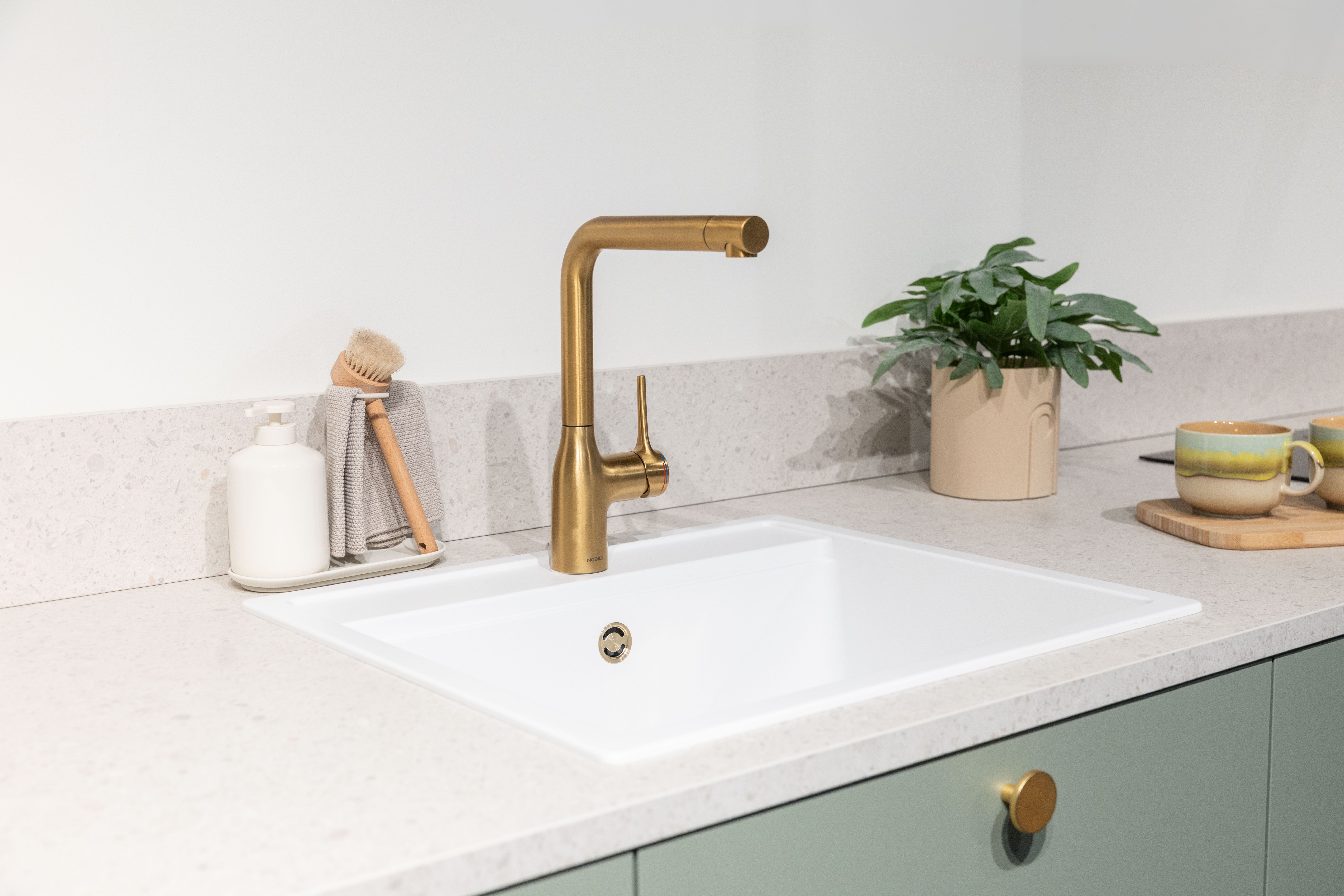 Deze moderne keuken combineert een zachte kleur met stijlvolle details. De zijdematte kunststofdeuren in saliegroen zorgen voor een rustige, eigentijdse uitstraling, terwijl de ronde grepen in messing een warm en elegant accent toevoegen. Het terrazzo laminaat werkblad geeft het geheel een speelse en karaktervolle toets. De witte composiet spoelbak met matte messing kraan vormt een mooie blikvanger en past perfect bij het lichte kleurenpalet. Met de Whirlpool oven en de inductiekookplaat met geïntegreerde dampkap is deze keuken niet alleen stijlvol, maar ook bijzonder praktisch in gebruik.