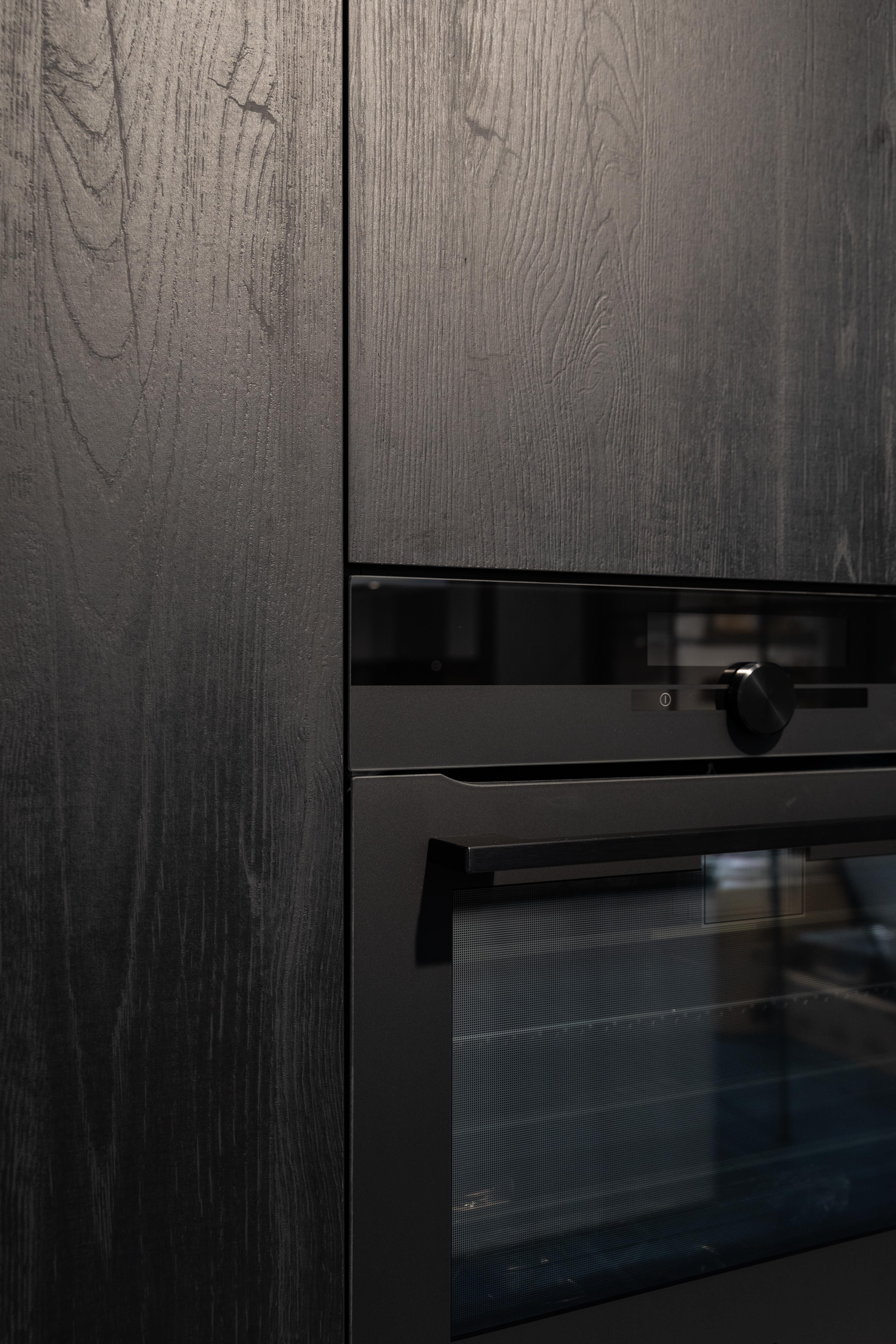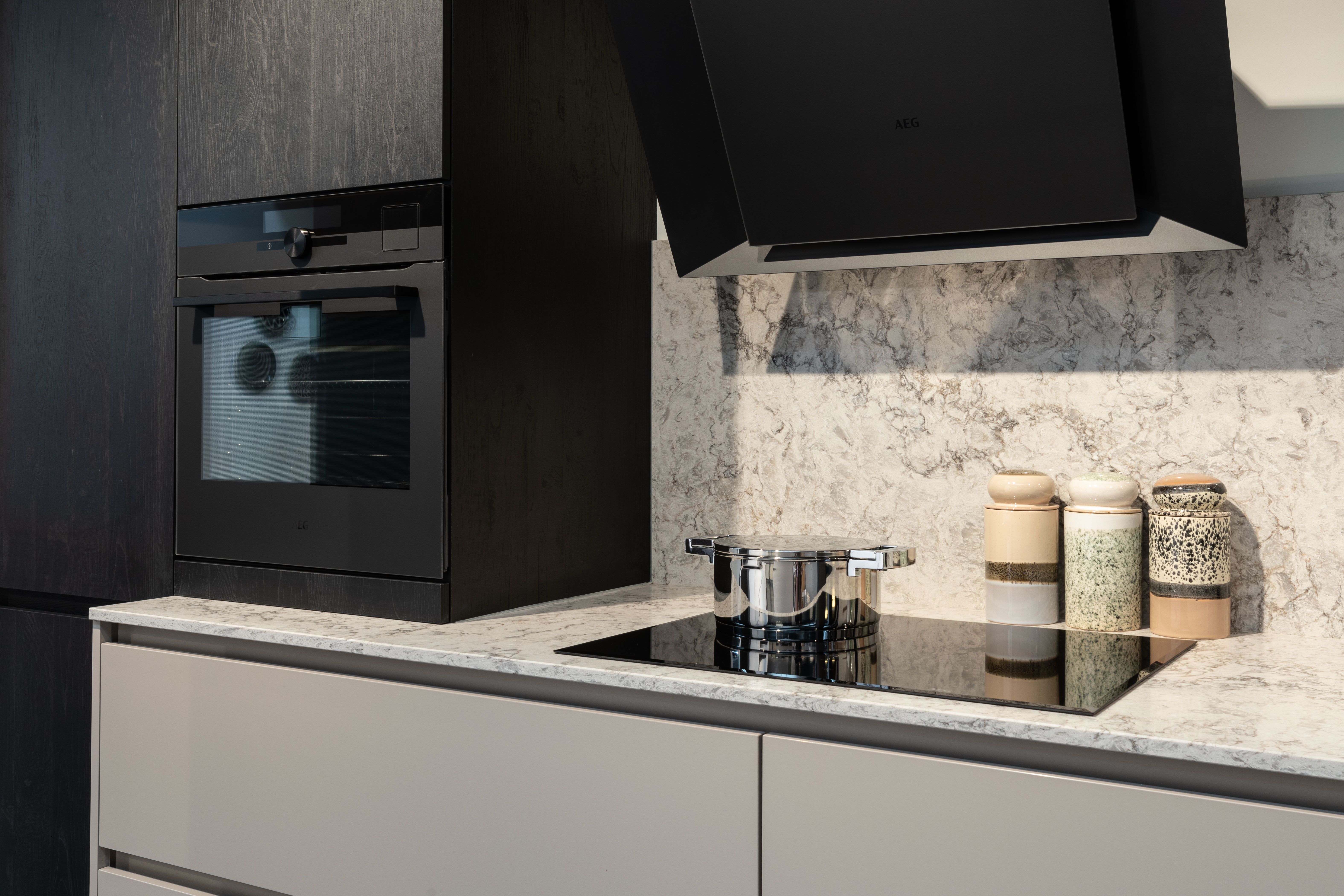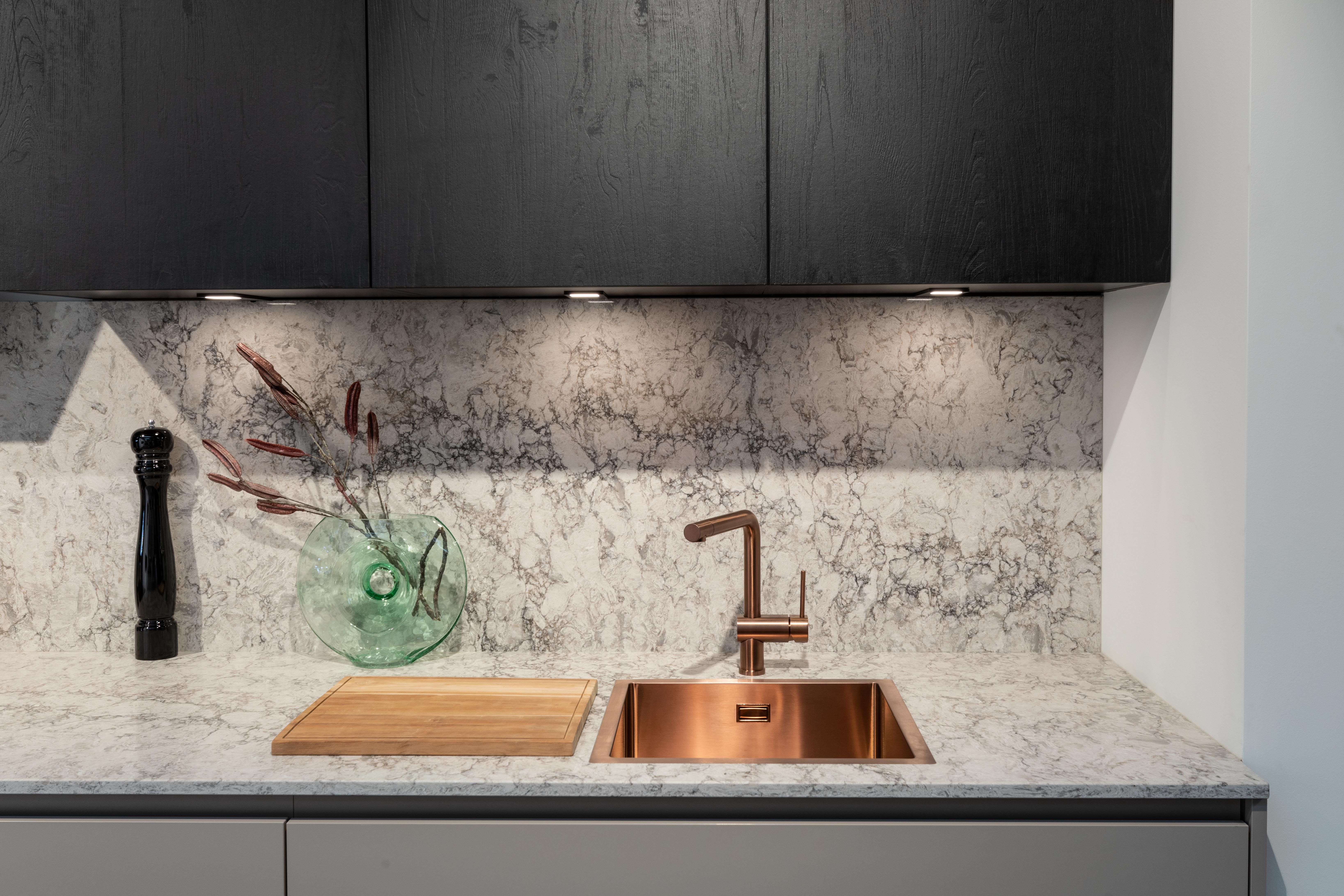 Een moderne keuken met een prachtige combinatie aan materialen en kleuren. Zo krijg je met keuken New York een strakke, elegante en hedendaagse uitstraling. Het werkblad in composiet komt in een warme marmeren kleur, terwijl de kasten in zwart hout en een taupe betonkleur komen.