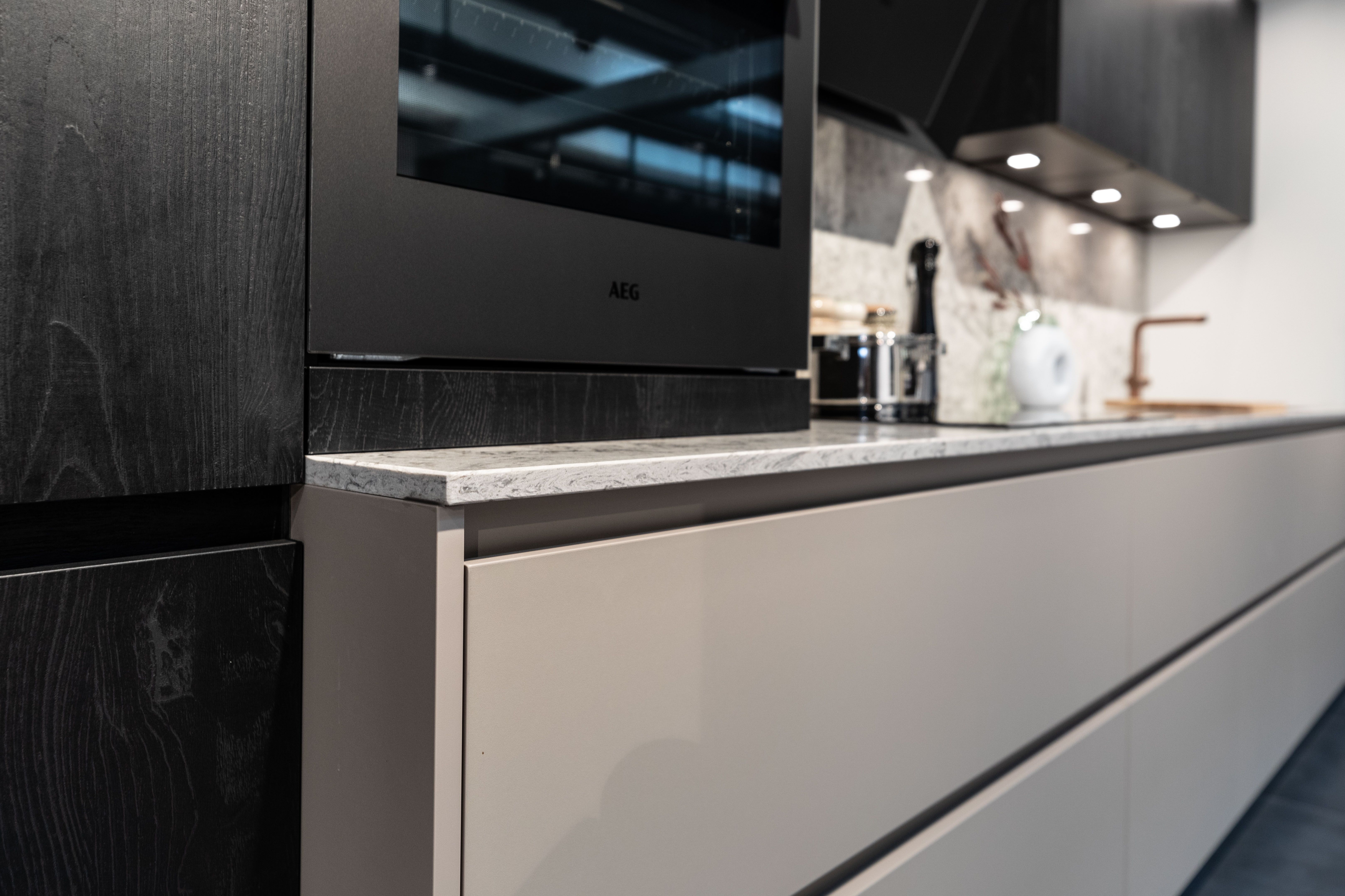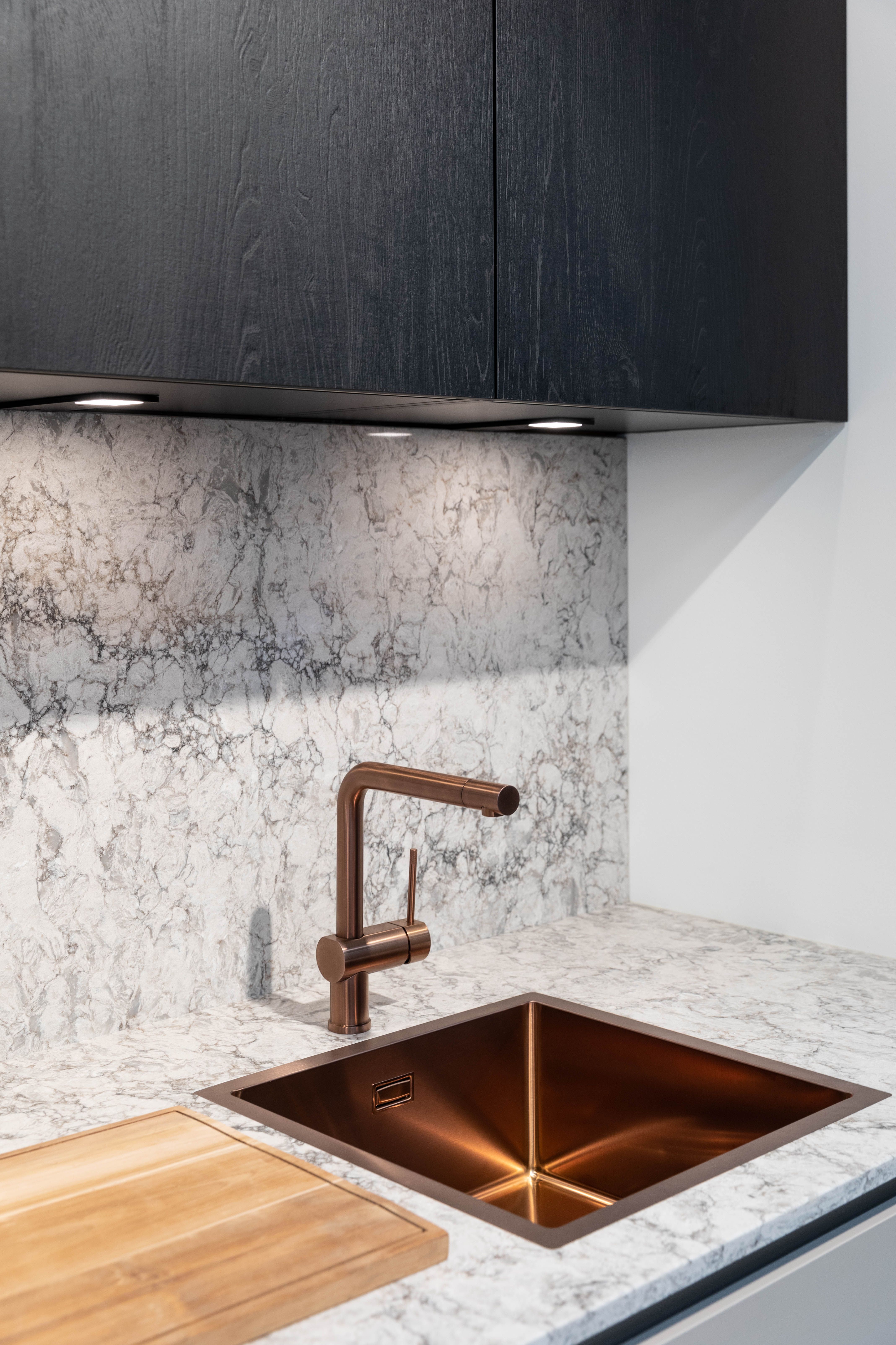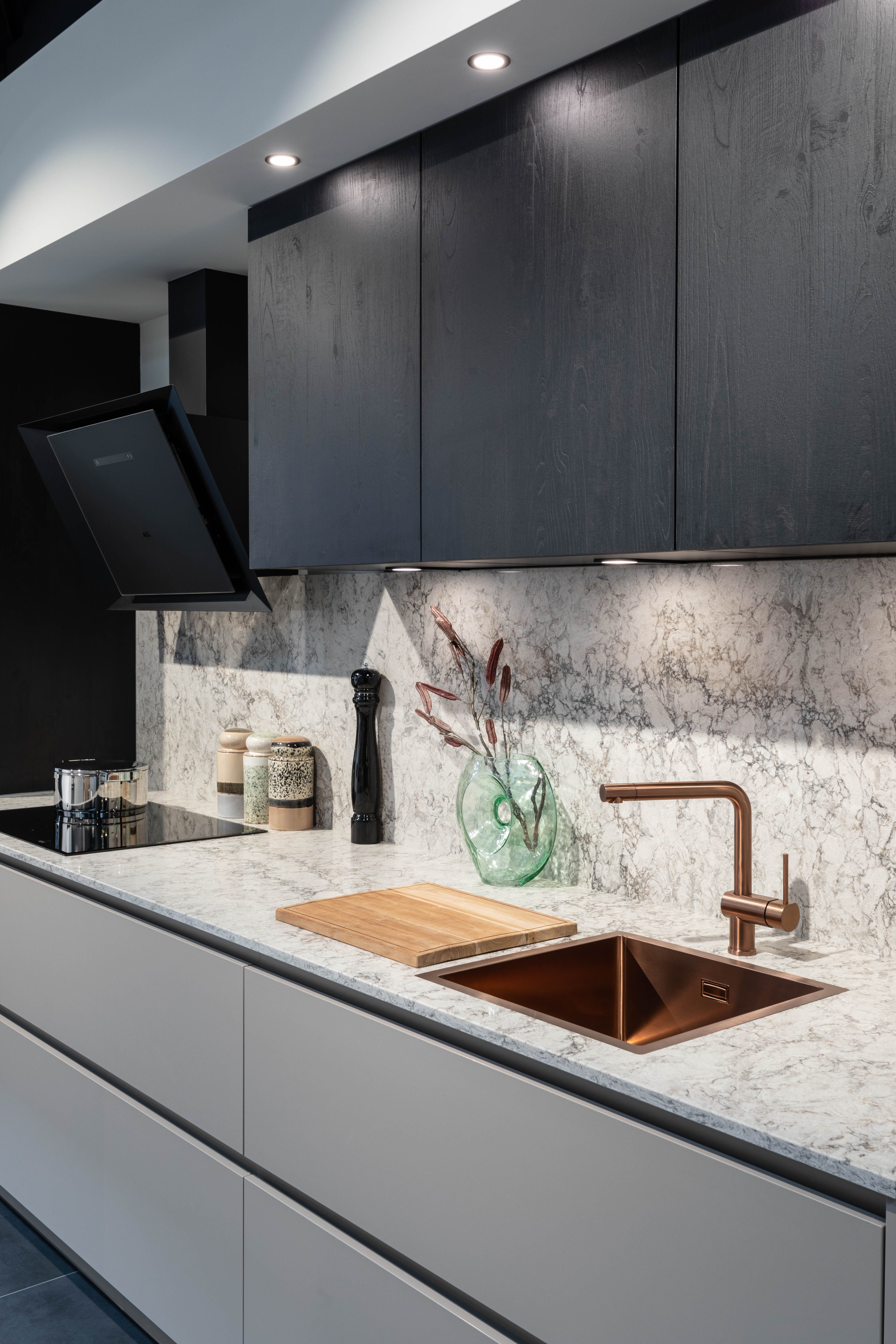 Deze nieuwe keukenwand bevat ook een aantal opvallende details zoals de koper gelakte kraan en spoelbak. De toestellen van AEG verzekeren je van een functionele keuken, naast enkel het design. De mat zwarte (schuine!) wanddampkap, de combi stoomoven en zwarte kookplaat met touch bediening beantwoorden aan al je wensen. Ook sfeerverlichting is mogelijk hier.