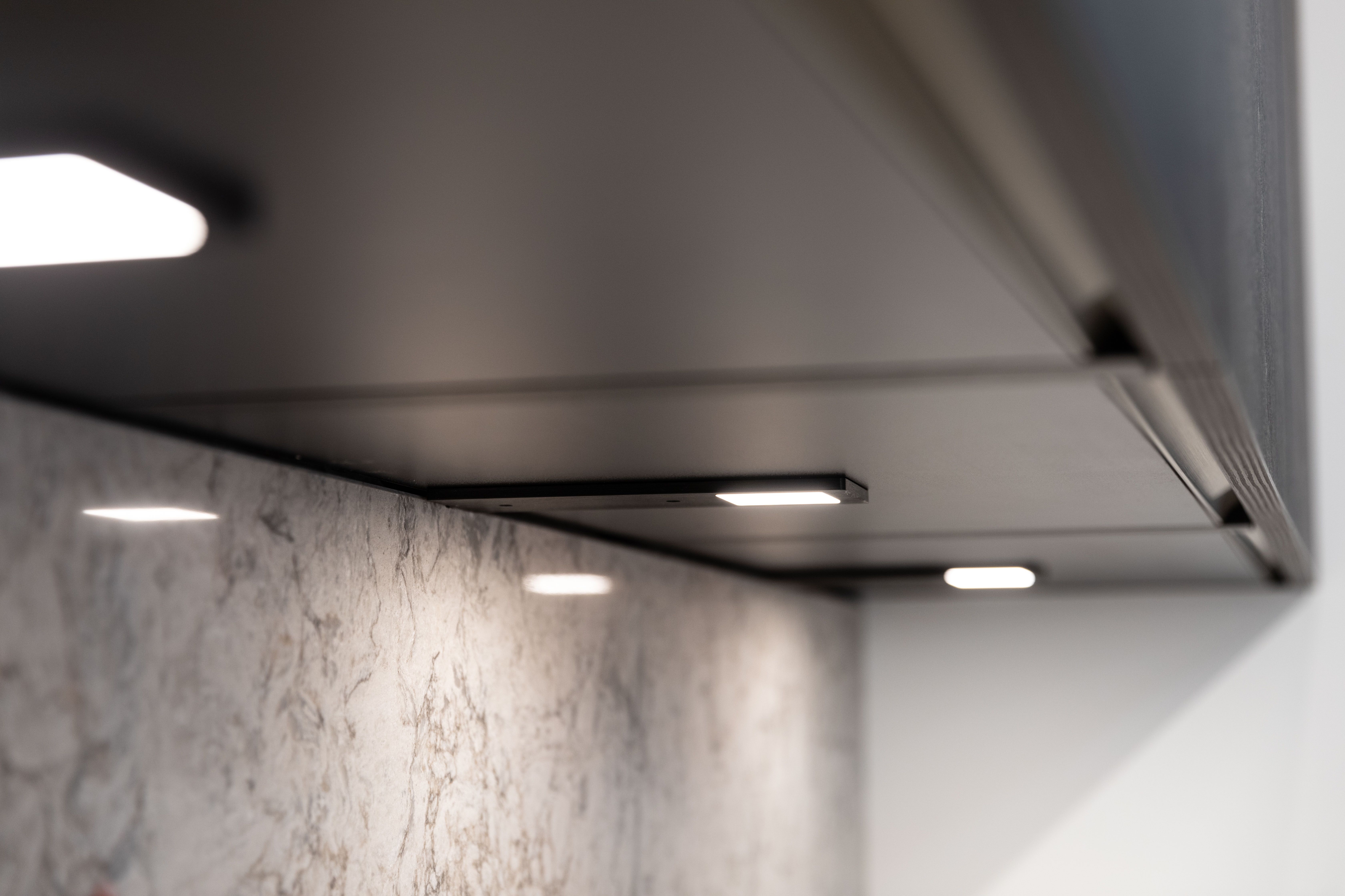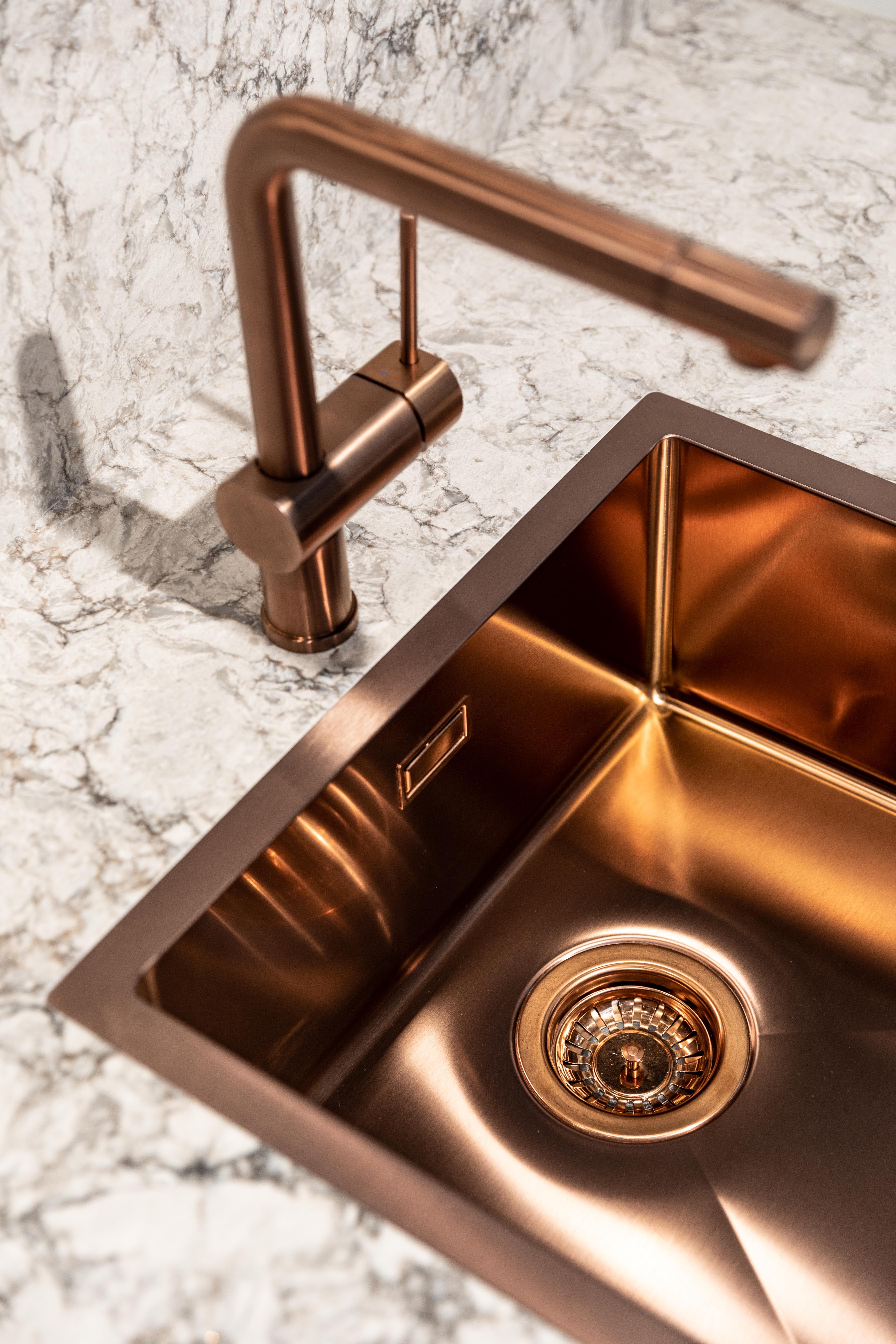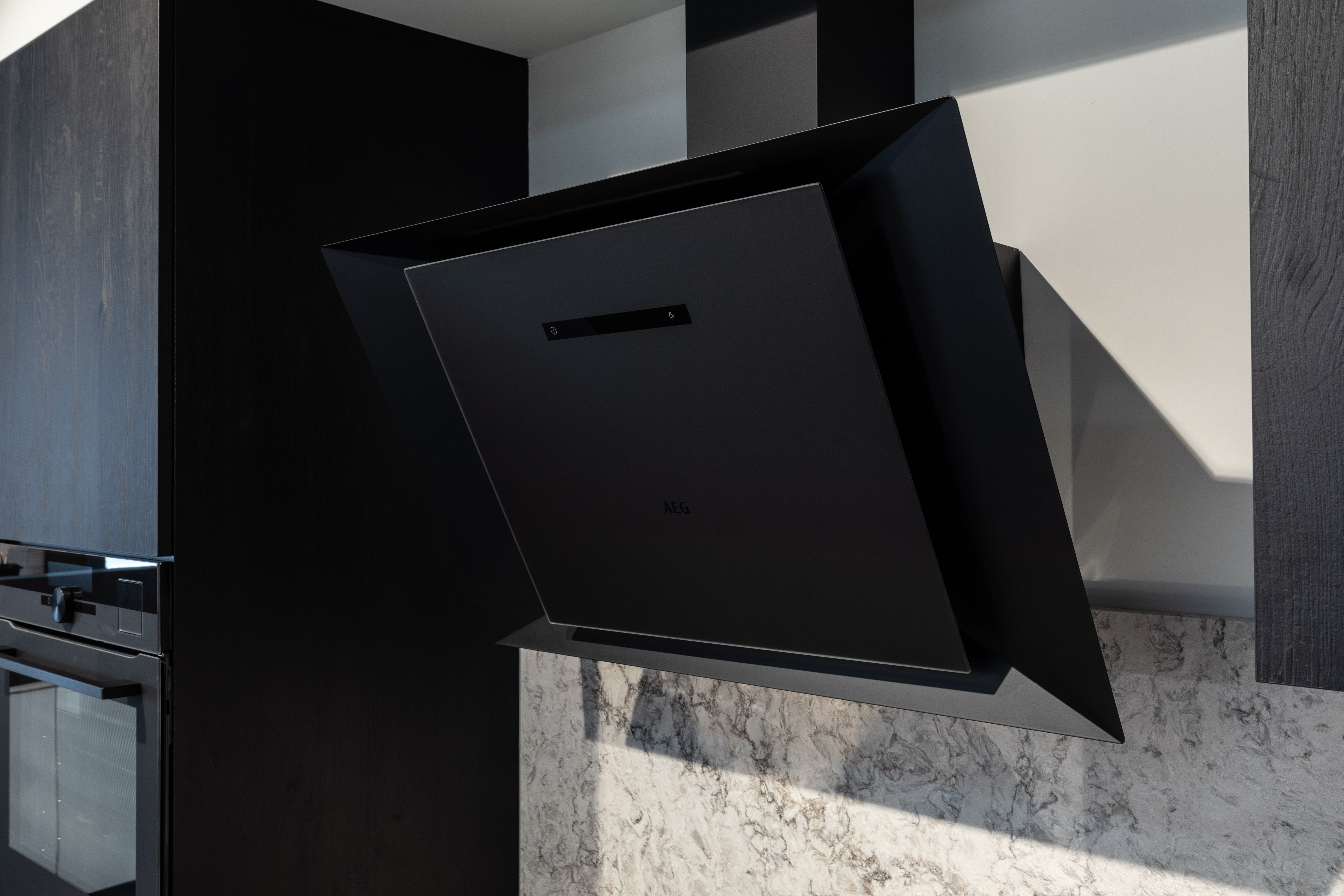 Deze nieuwe keukenwand bevat ook een aantal opvallende details zoals de koper gelakte kraan en spoelbak. De toestellen van AEG verzekeren je van een functionele keuken, naast enkel het design. De mat zwarte (schuine!) wanddampkap, de combi stoomoven en zwarte kookplaat met touch bediening beantwoorden aan al je wensen. Ook sfeerverlichting is mogelijk hier.