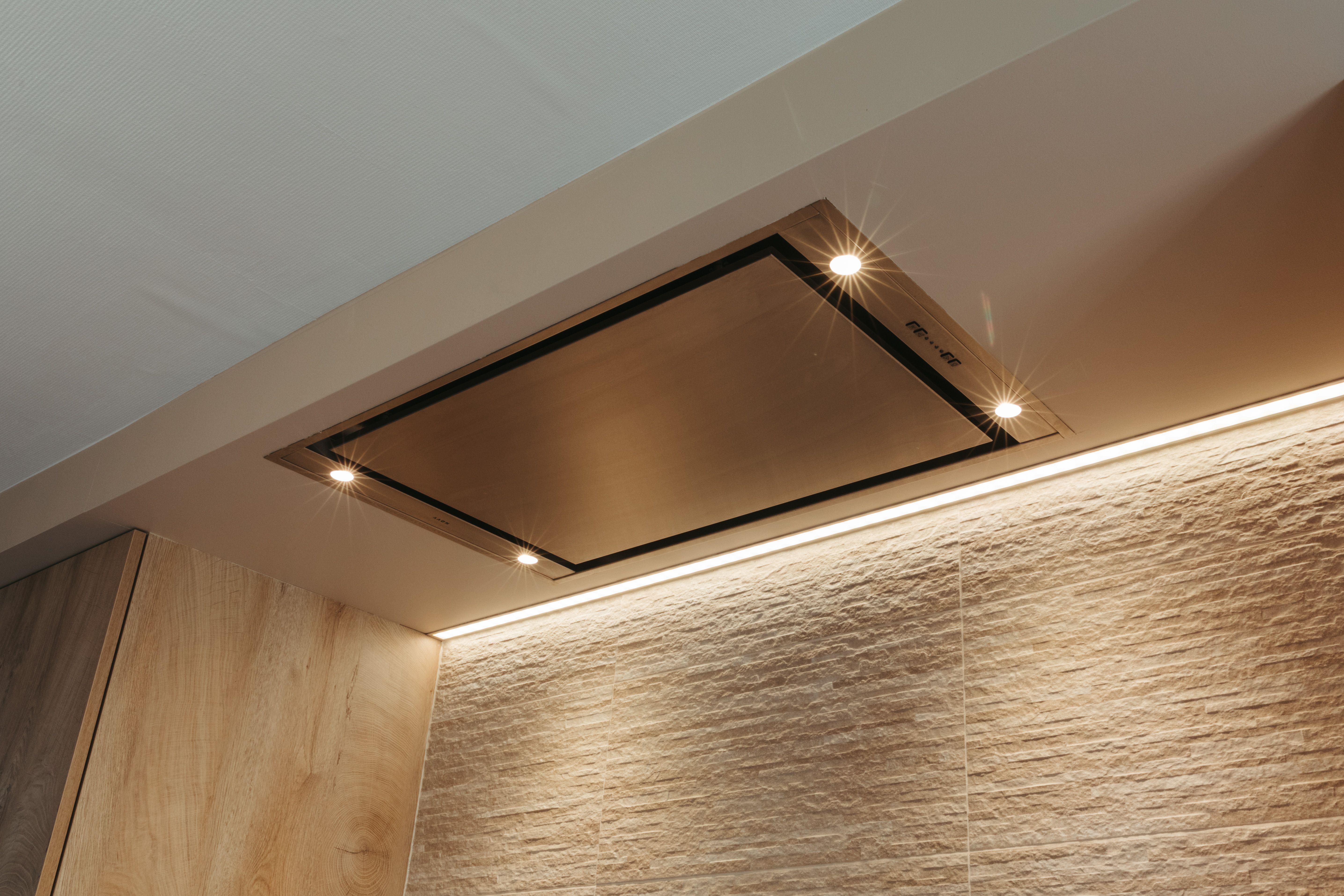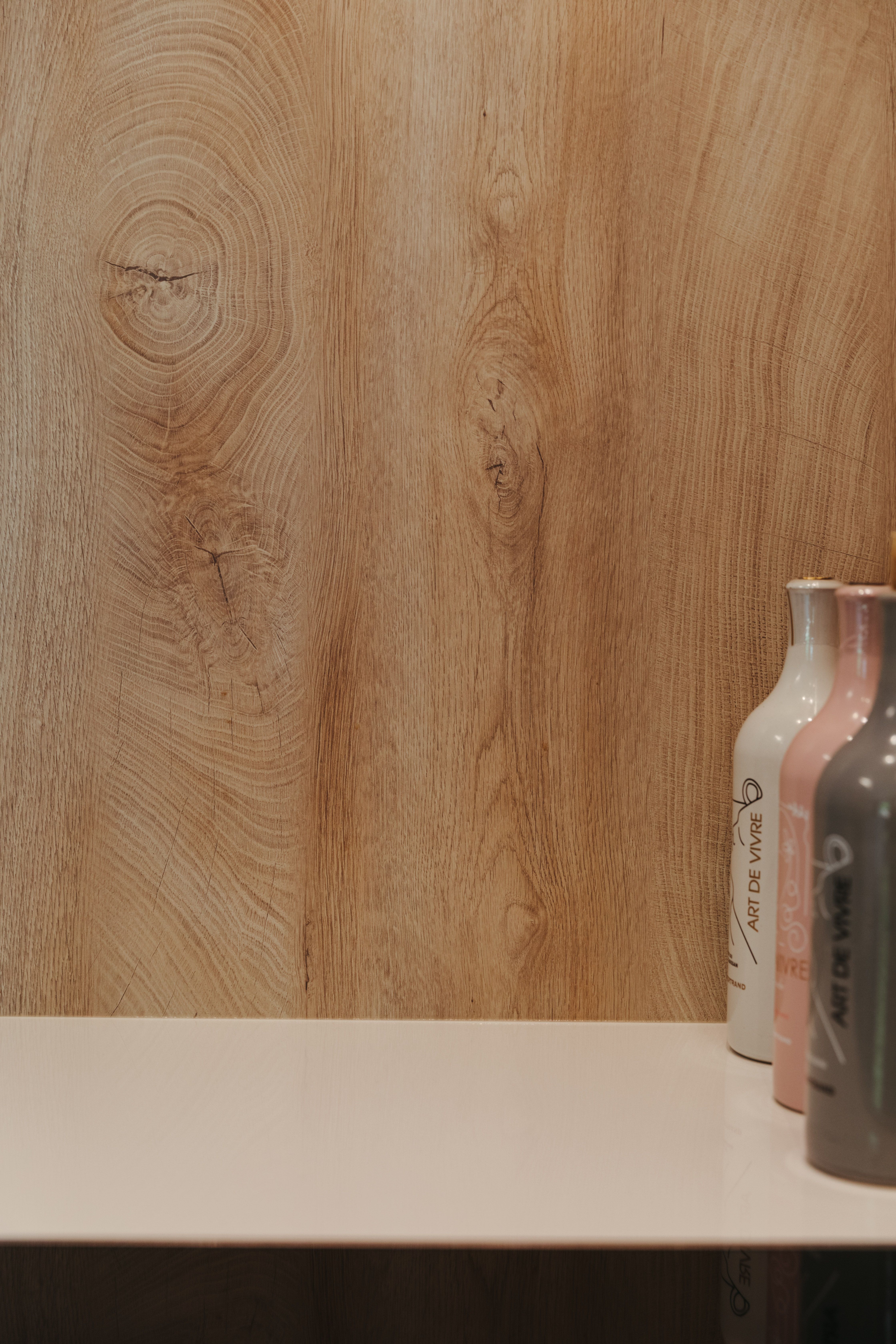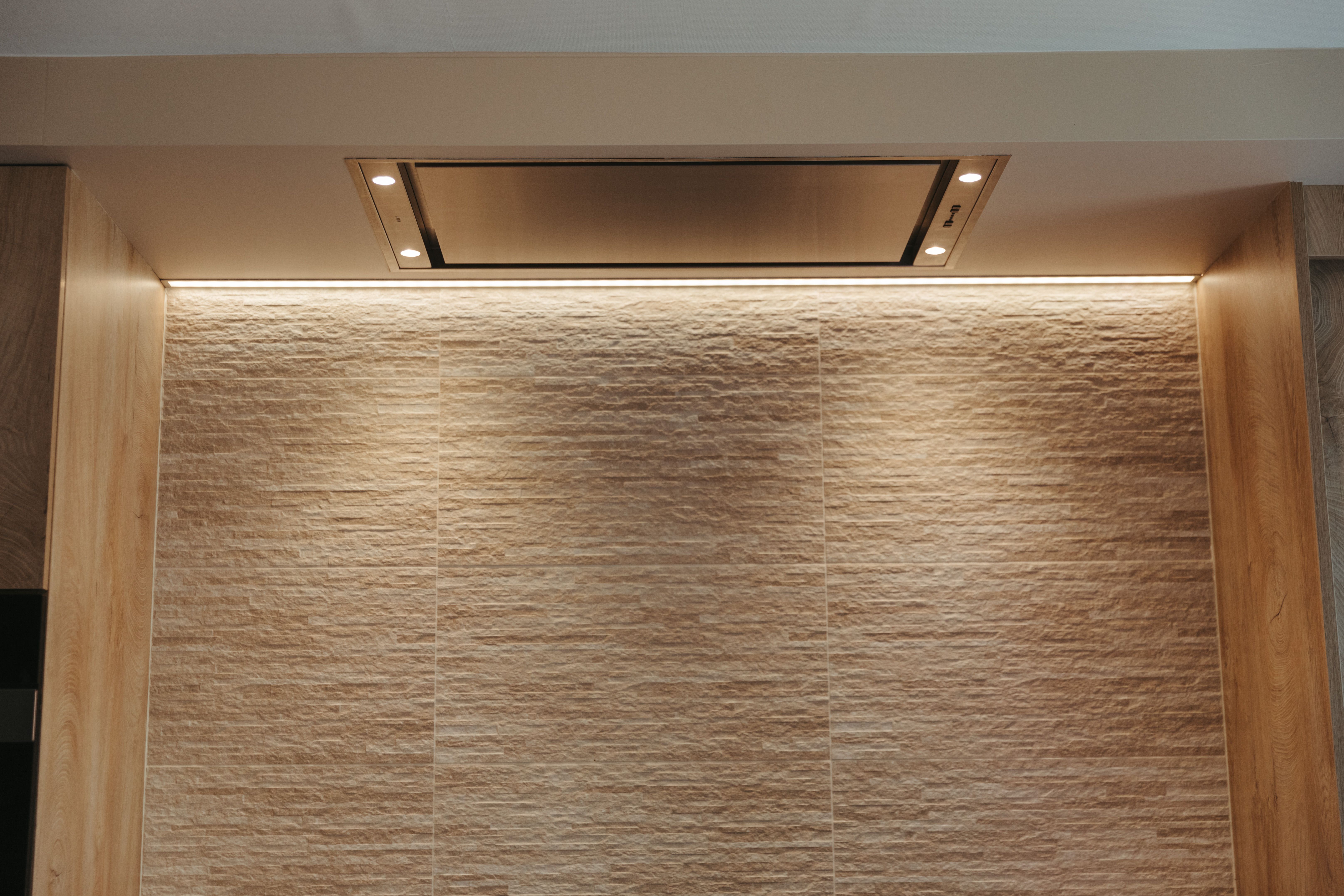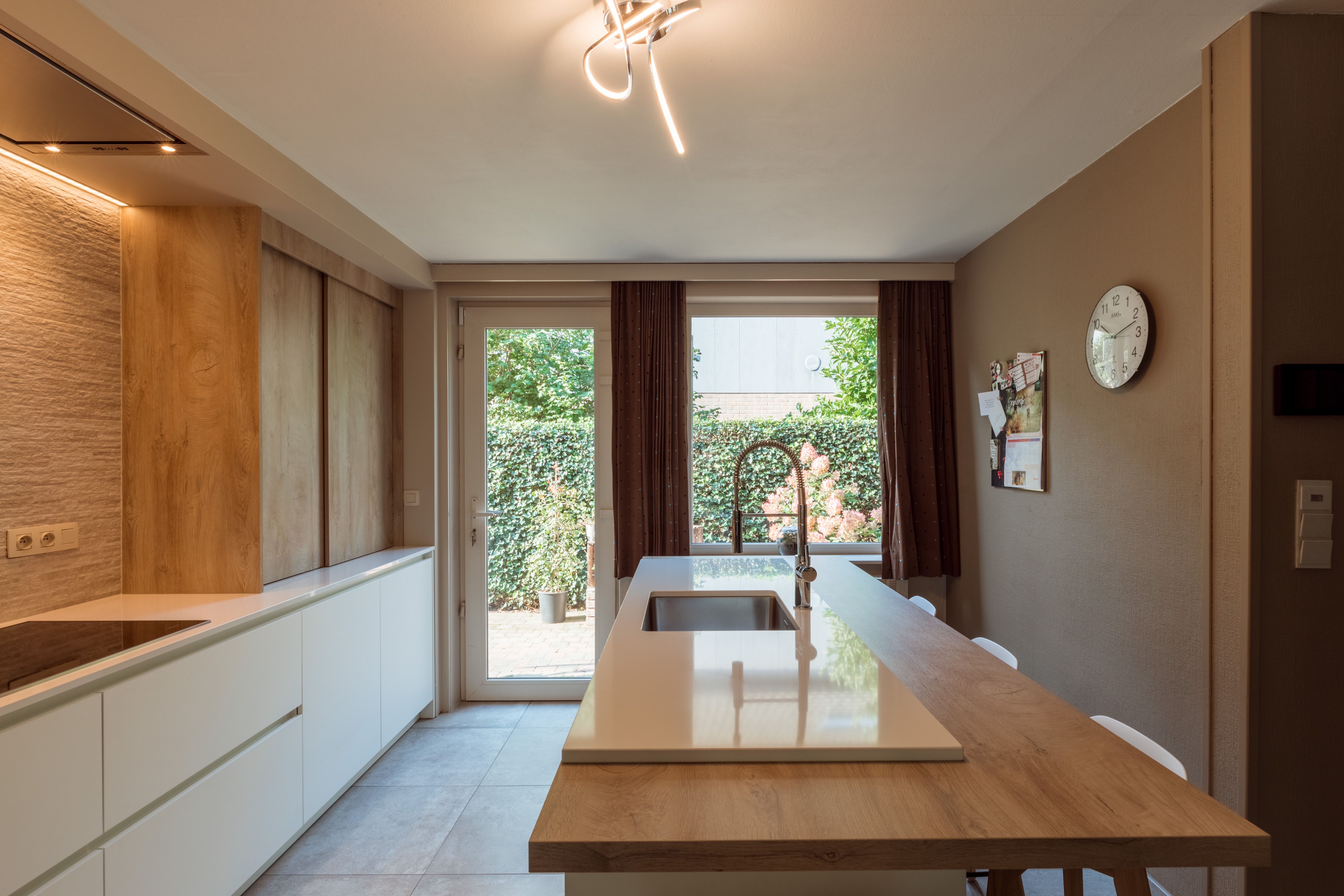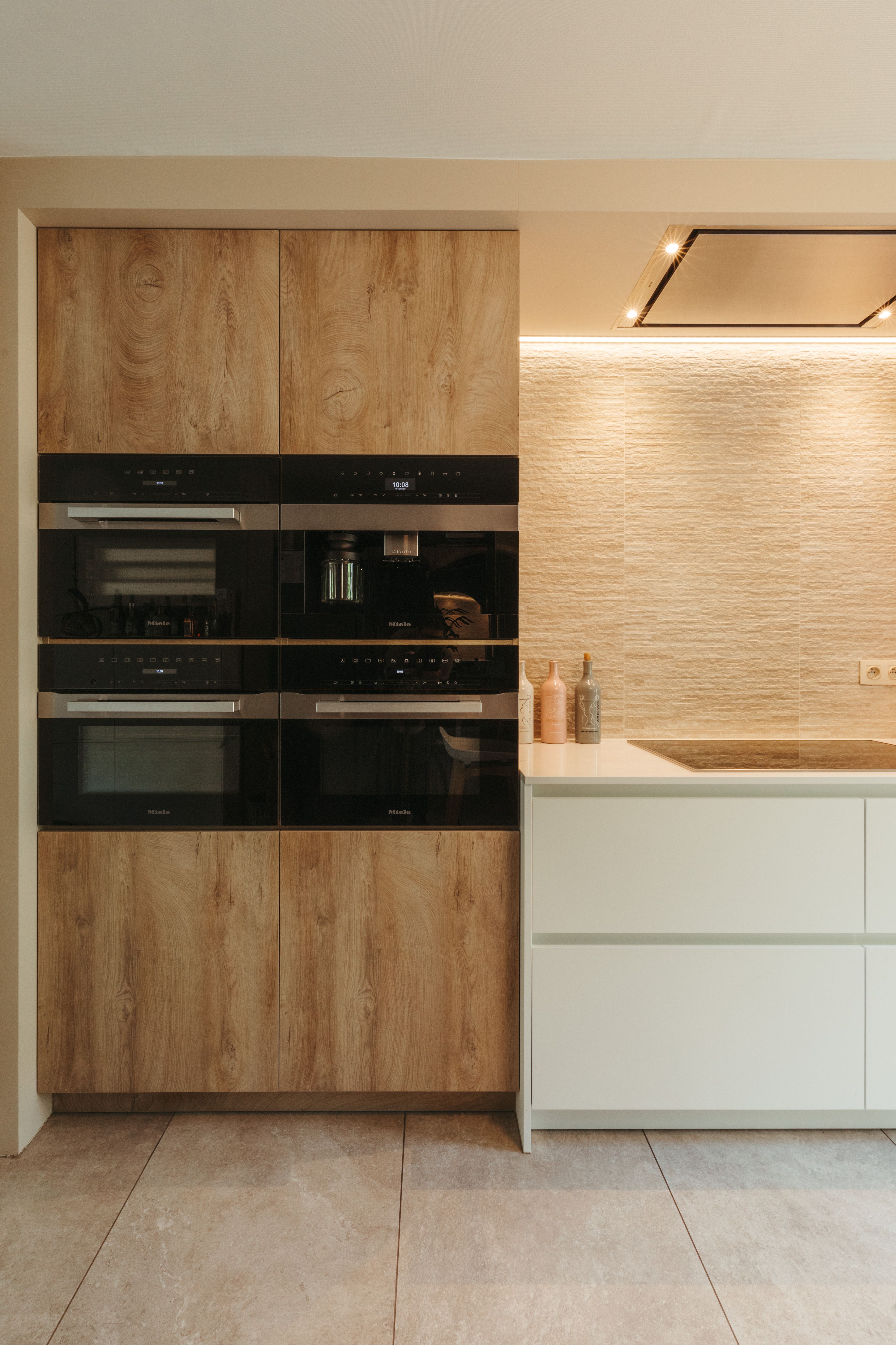 Het werkblad heeft een stevige basis in composiet gecombineerd met laminaat. Hier zien we, net zoals bij de fronten, de kleurcombinatie van warm wit met halifax eiken. De fronten zelf komen in hoogglans lak, wat zorgt voor een erg modern gevoel. De finishing touch is de sfeerverlichting die in de keukenwand voorzien is. Gezellig!