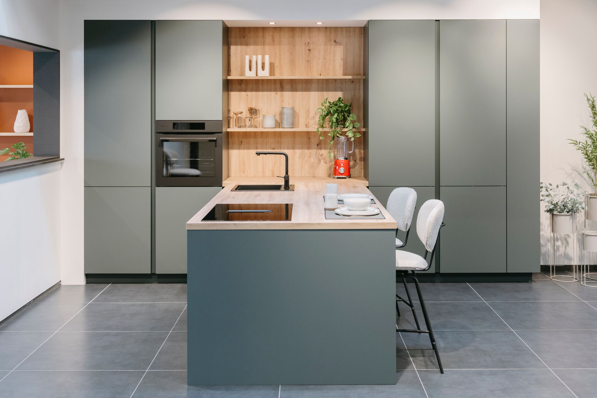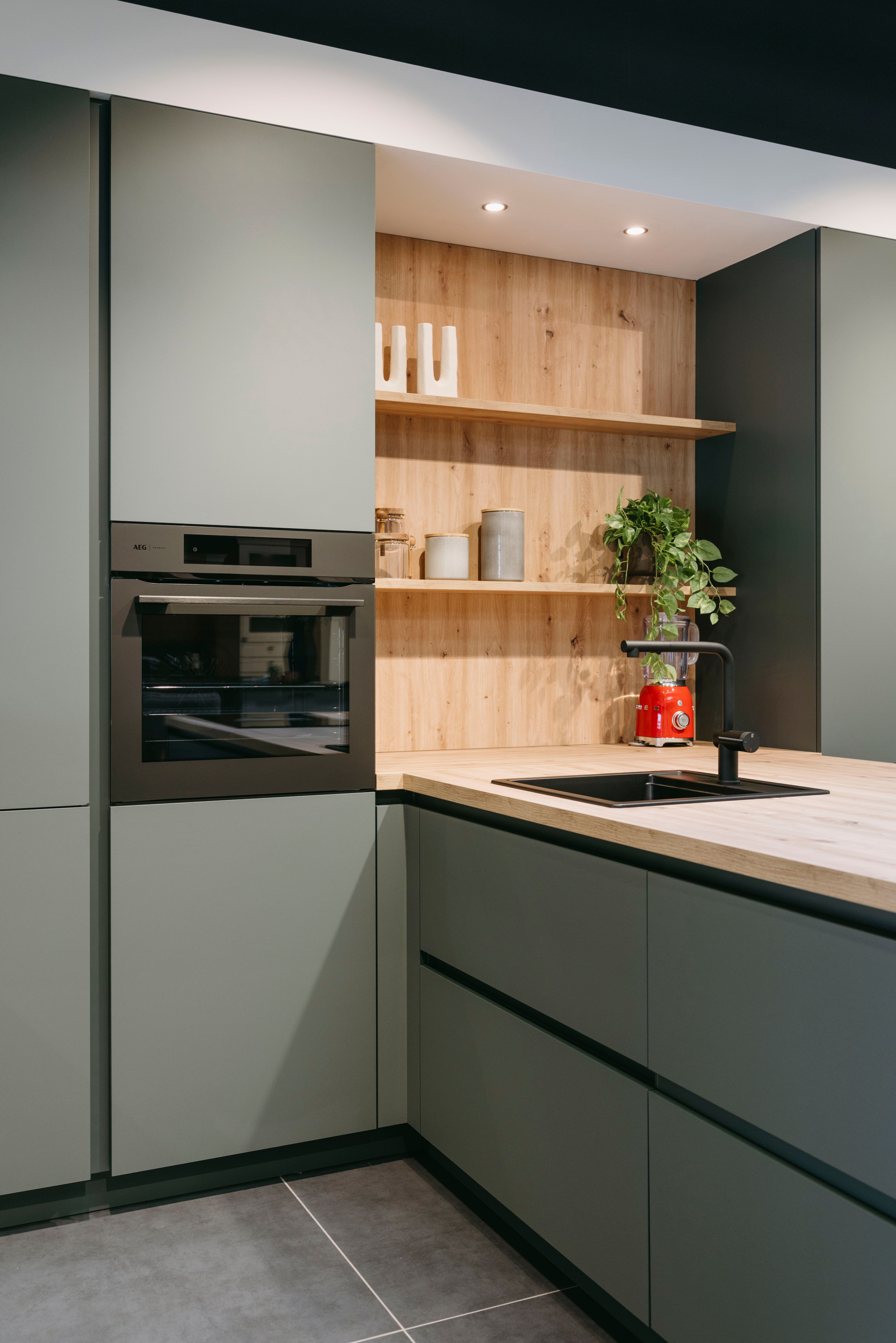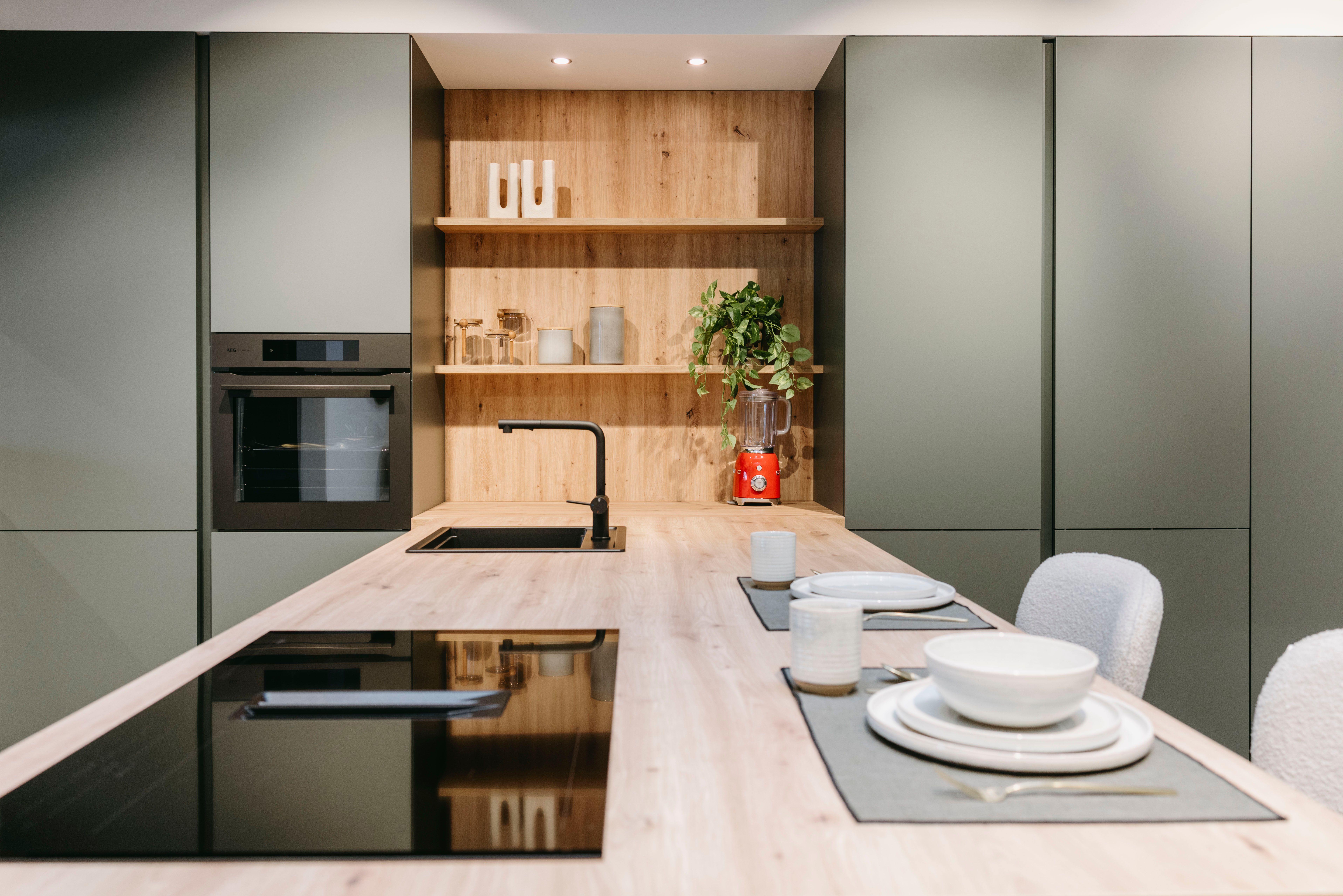 Deze moderne keuken combineert stijl en functionaliteit op een elegante manier. Het matte groene kleurgebruik geeft de ruimte een frisse, natuurlijke uitstraling, terwijl het houten werkblad en de open planken warmte en karakter toevoegen. Het ruime keukeneiland nodigt uit om samen te koken, te eten of gezellig bij te praten, en biedt tegelijkertijd praktische opbergruimte en een werkoppervlak waar alles binnen handbereik is. De fronten zijn afgewerkt in een matte lak met antifingerprint, wat zorgt voor een strakke uitstraling én makkelijk onderhoud. Het werkblad is uitgevoerd in laminaat met een eiken houtdecor, wat de natuurlijke uitstraling van de keuken benadrukt.