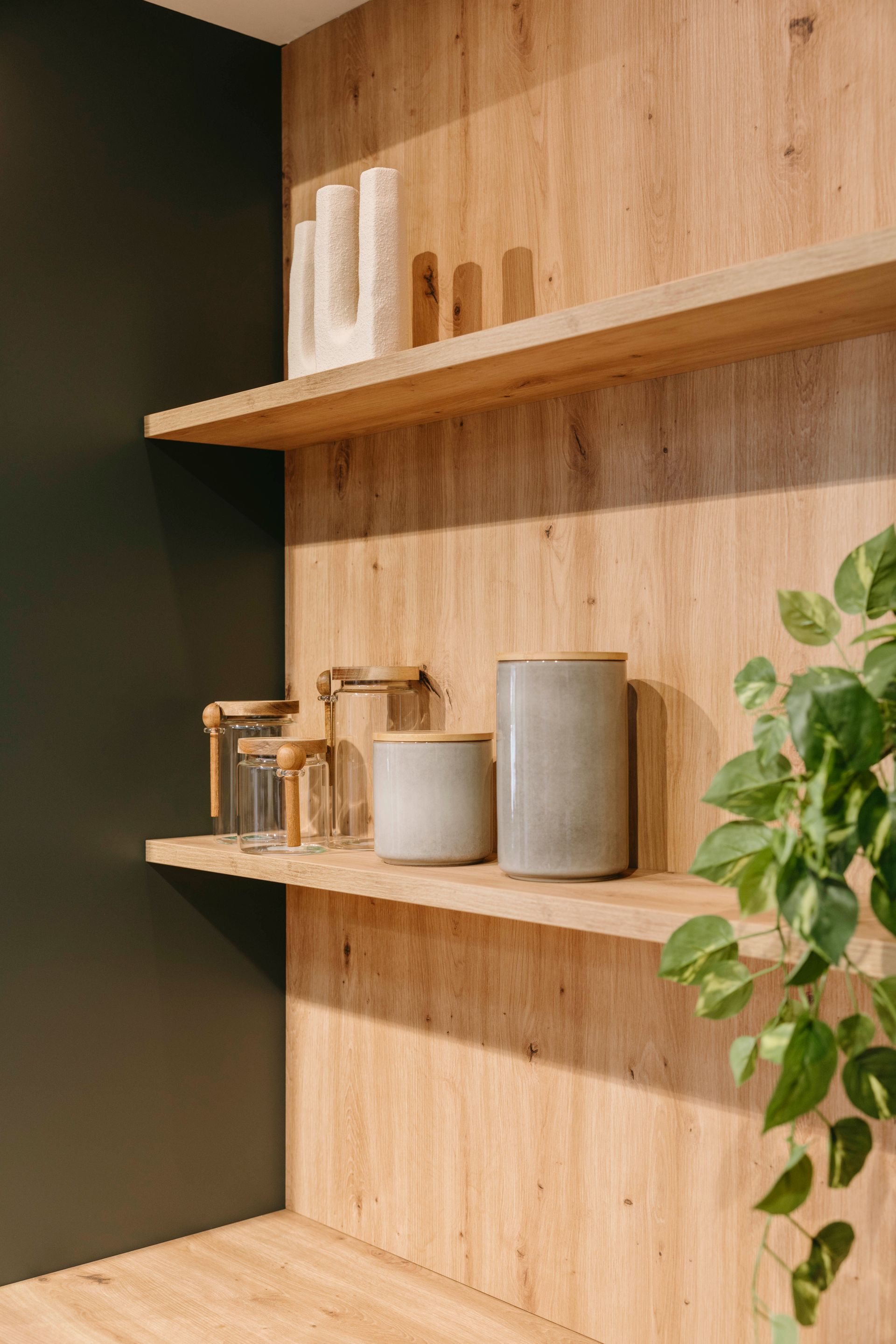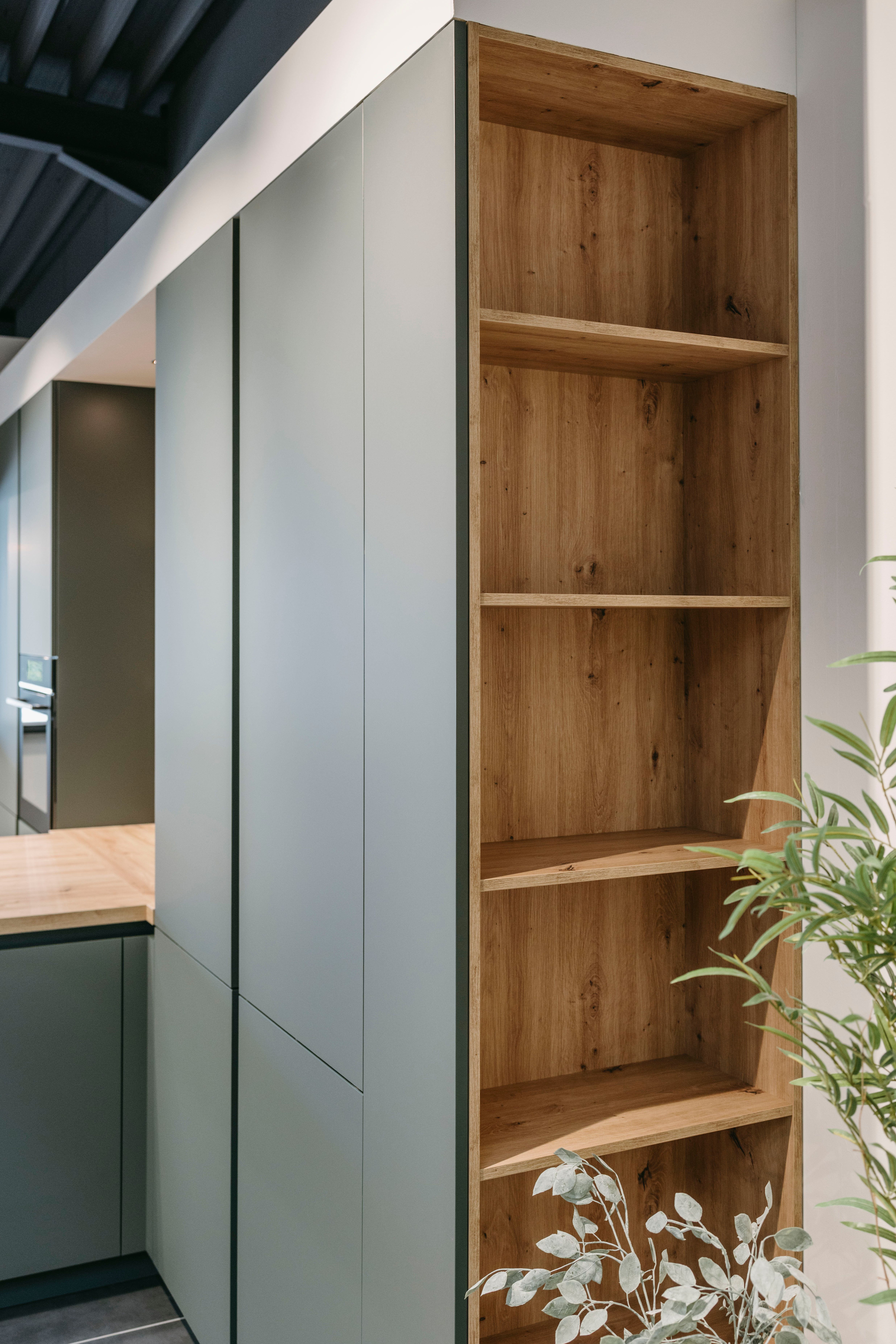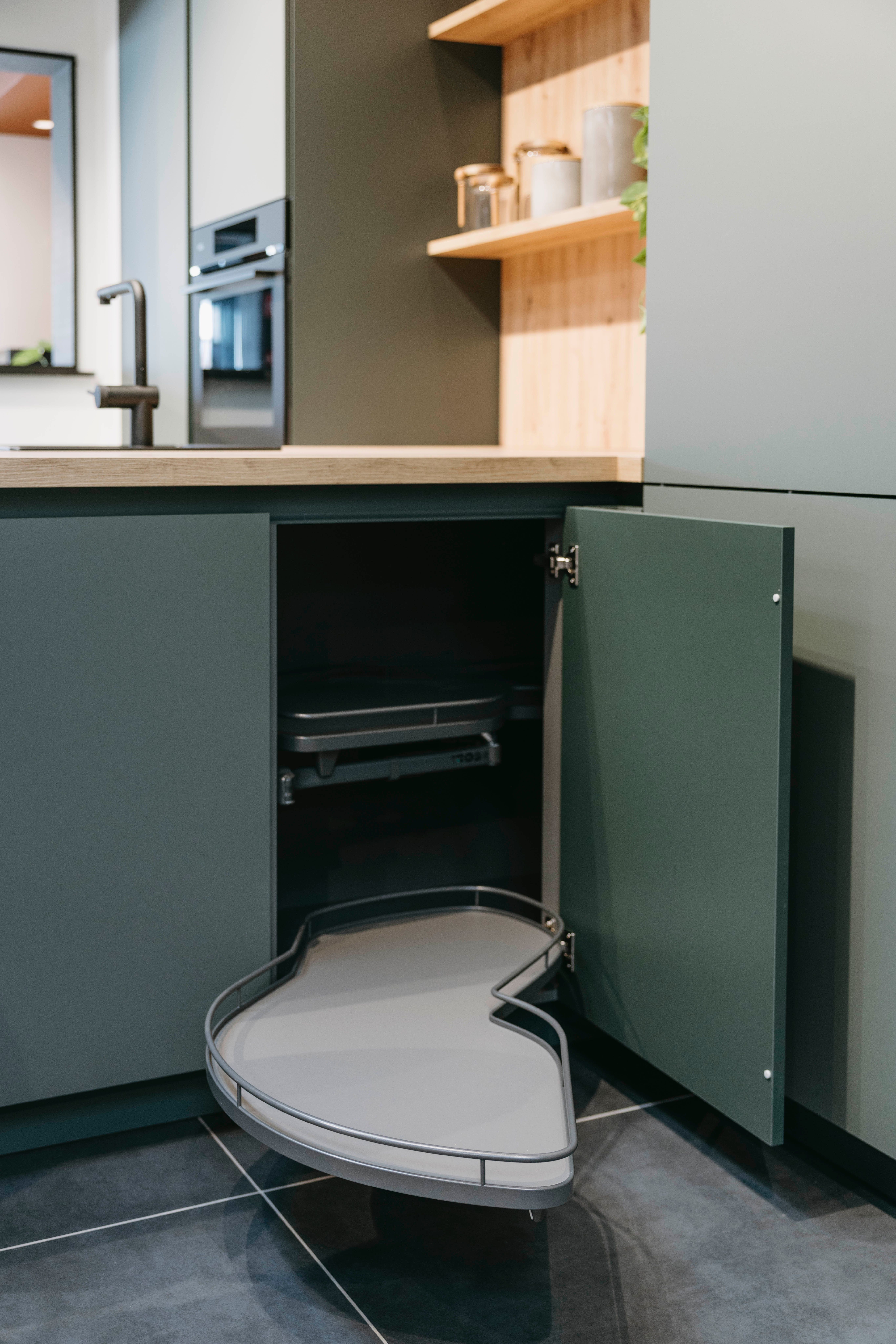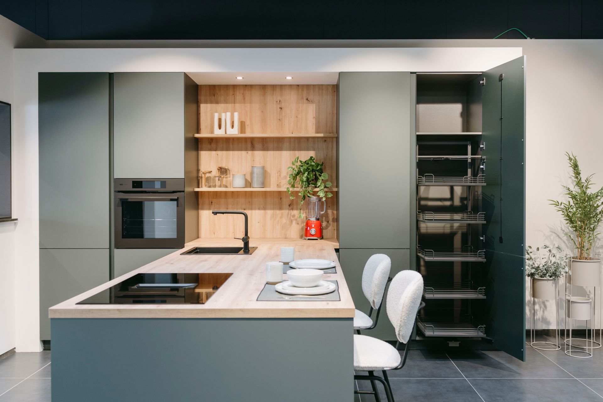 Deze moderne keuken combineert stijl en functionaliteit op een elegante manier. Het matte groene kleurgebruik geeft de ruimte een frisse, natuurlijke uitstraling, terwijl het houten werkblad en de open planken warmte en karakter toevoegen. Het ruime keukeneiland nodigt uit om samen te koken, te eten of gezellig bij te praten, en biedt tegelijkertijd praktische opbergruimte en een werkoppervlak waar alles binnen handbereik is. De fronten zijn afgewerkt in een matte lak met antifingerprint, wat zorgt voor een strakke uitstraling én makkelijk onderhoud. Het werkblad is uitgevoerd in laminaat met een eiken houtdecor, wat de natuurlijke uitstraling van de keuken benadrukt.