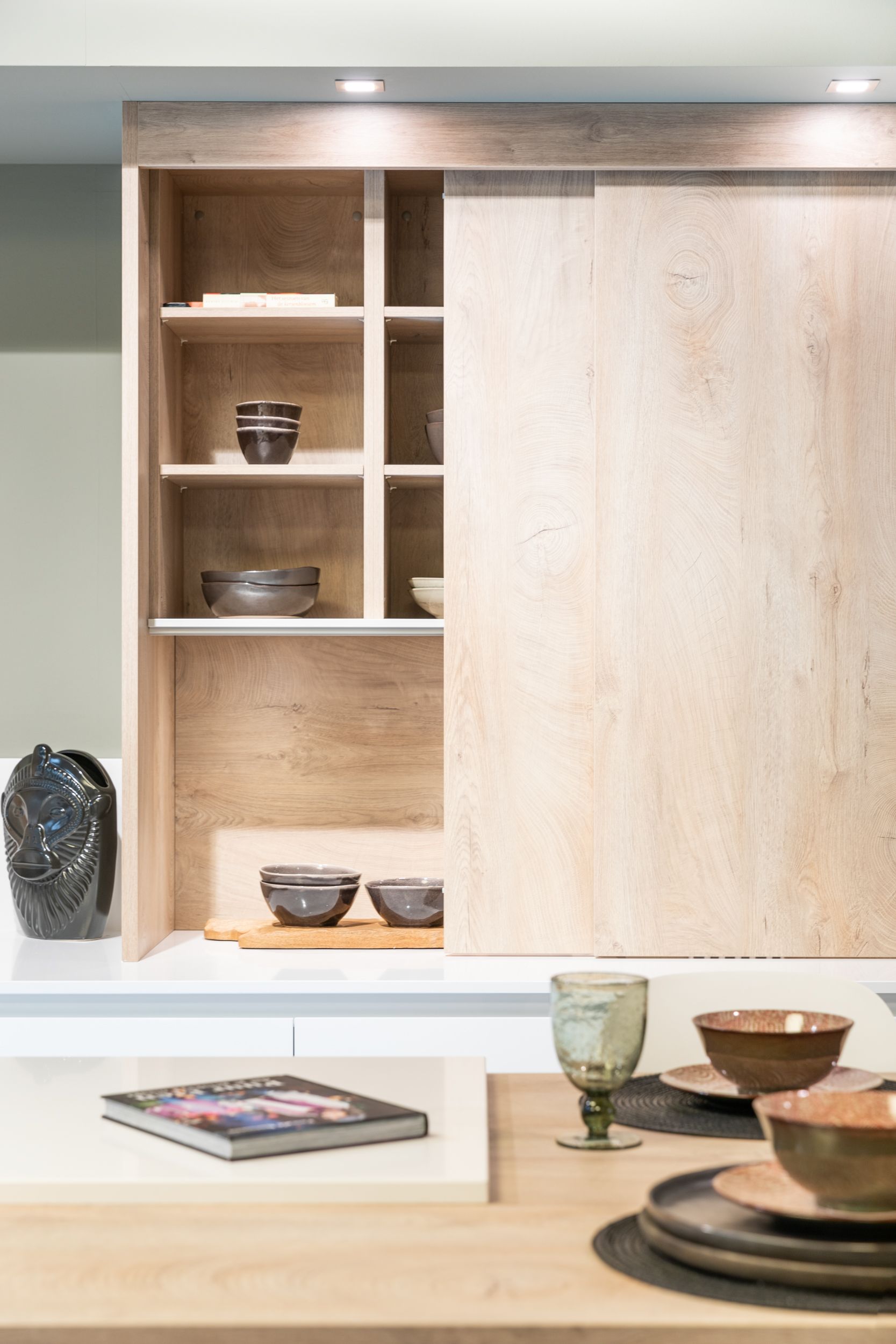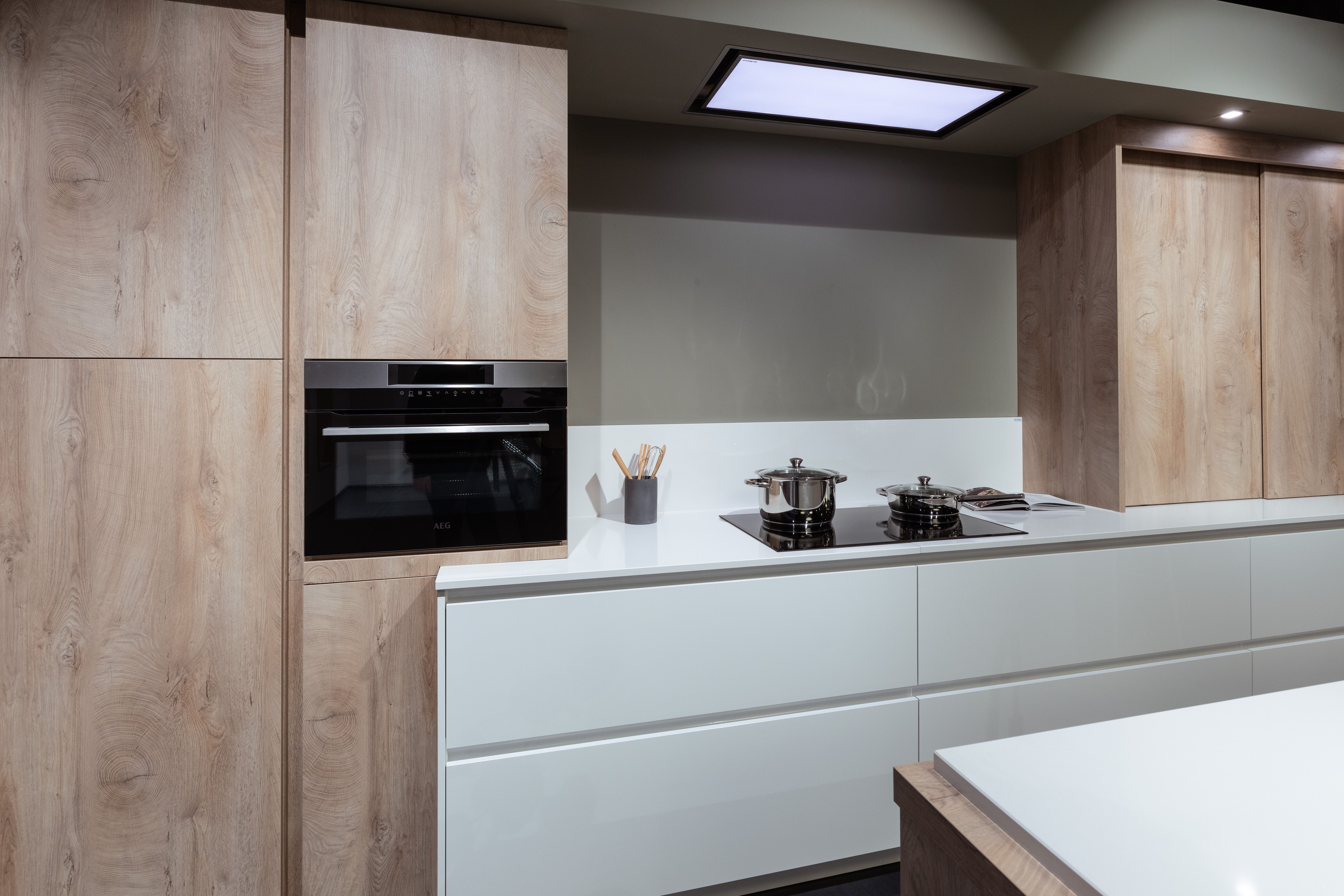 Keuken Stockholm combineert witte hoogglans met eikenhouten details tot een prachtige, landelijke keuken met een tijdloos design. Het keukeneiland met zitgedeelte trekt de sfeer door van de keukenwand, waardoor je een rustgevend, samenhangend geheel krijgt. Naast een volledig ingerichte keuken met eiland krijg je bij deze keuken ook kwalitatieve AEG toestellen, kasten en sanitair, waardoor je volledig voorzien bent van het nodige om de lekkerste gerechtjes op tafel te toveren.