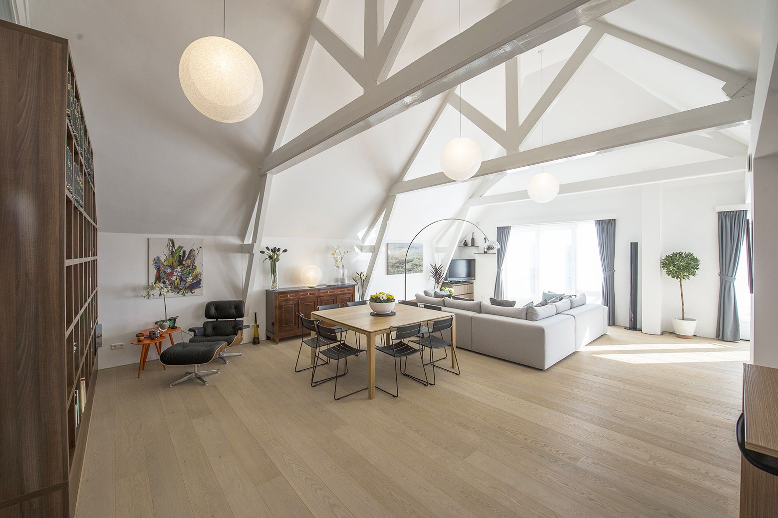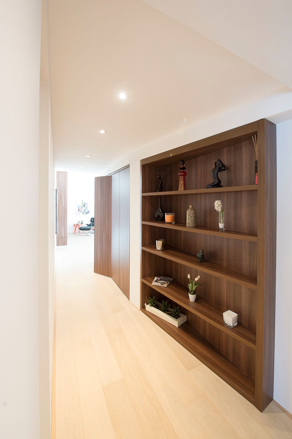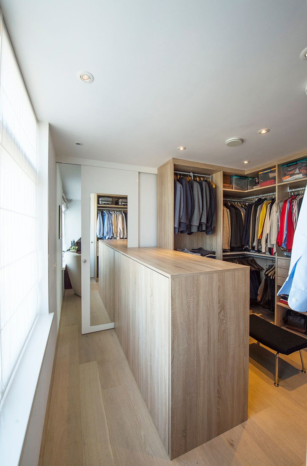 Samen met het Nederlandse PEÑA architectuur realiseerden we het maatwerk van dit project in Rotterdam. Het voormalige Kralings Museum werd getransformeerd tot een luxe appartementsgebouw. De afgeschuinde bibliotheek in de leefruimte zorgt voor optimaal plaatsgebruik tot onder het dak. In de slaapkamer was het een technische uitdaging om de steunbalk tussen het dak en de vloer naadloos in de dressoir in te werken. Aansluitend aan de slaapkamer bevindt zich de praktische inloopkast, waarvan het verlaagde element zicht visueel verlengt in de spiegel op de schuifdeur. Of hoe het ruimtegevoel hand in hand gaat met de praktische indeling. Vanuit de dressing heb je ook toegang tot de aanpalende badkamer. En ook de maatkasten in de gang zijn van de hand van onze maatwerkspecialisten.